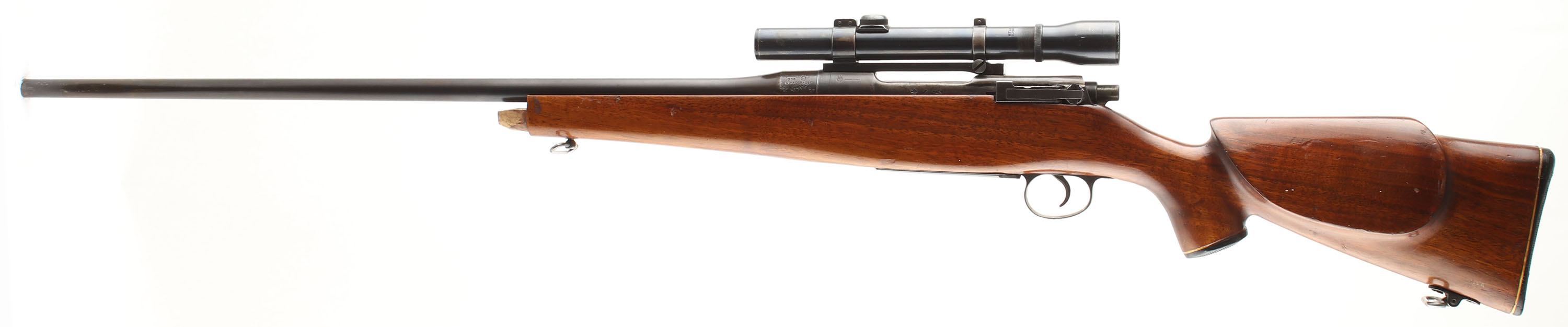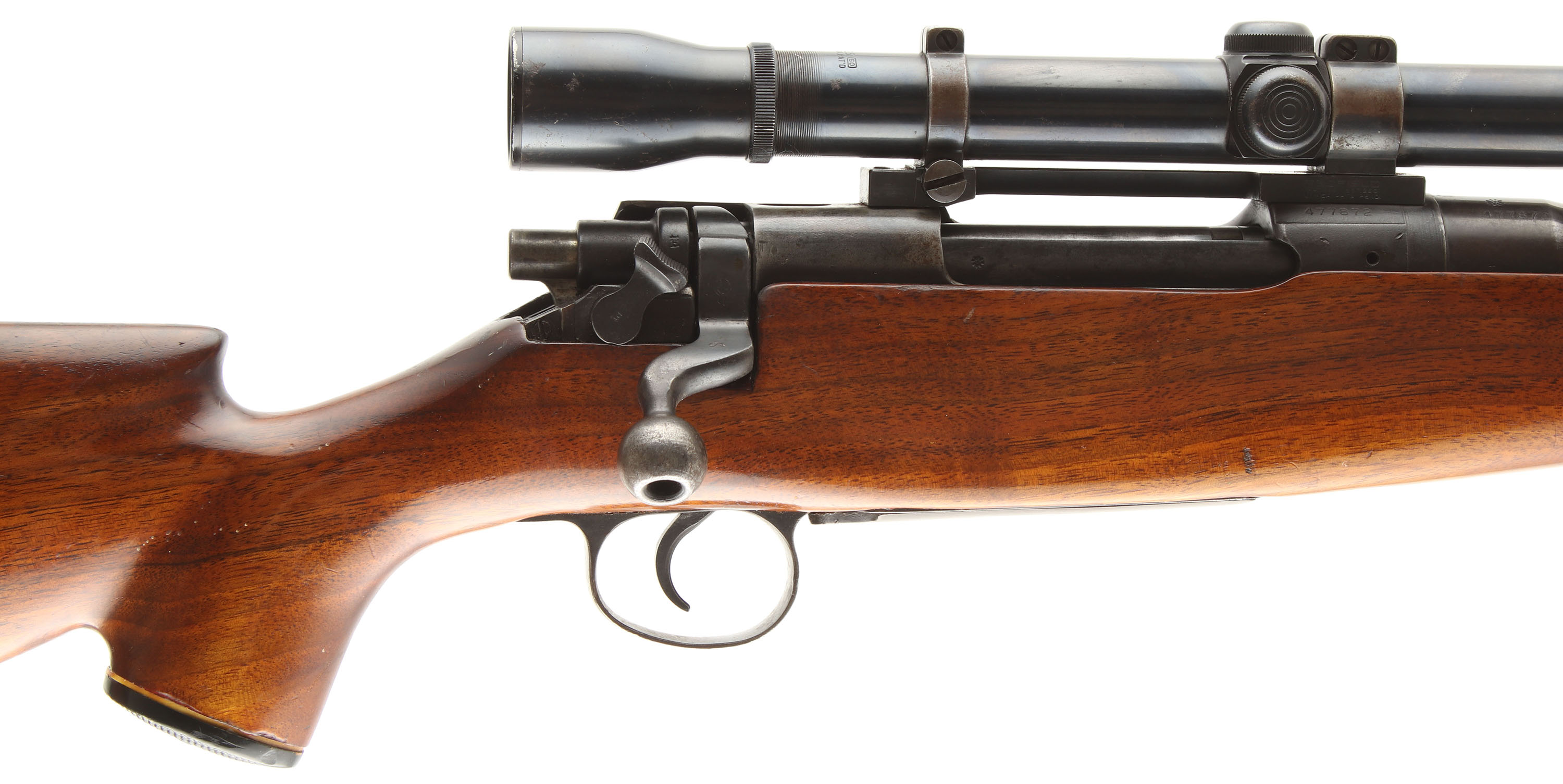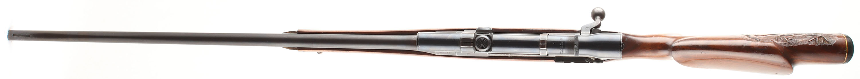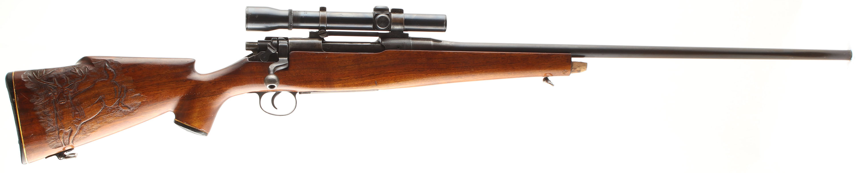 Sporterized Rifle, Built from an Eddystone U.S. Springfield 1917 Action, CAL: 30-06, MFG:1917 (action), SN: 477872, Bolt Action Rifle, 26'' Round barrel. The Bishop cheeked, checkered & capped pistol grip wood stock is good, with several minor scrapes, scratches & contusions to the wood & finish. The right side of the stock displays a carved buck deer. The plastic forend cap is missing. The original metal blue finish on the barrel rating 60%, while the receiver & floorplate appear to display a mix of original & added finishes toning brown. The original SN matching barrel has the front sight removed, while the receiver carries a Weaver K2.5 scope on Redfield mounts. The receiver & barrel carry U.S. & British stampings & proofs, as this rifle was originally part of the U.S. Military's ''Loan Lease'' program to the British Government during WWI. Bore is very good. Stock carries a Bishop checkered plastic buttplate. Sling loops. A sporterized military to hunter conversion. FFL or C&R Req. - Value: 200 to 400
