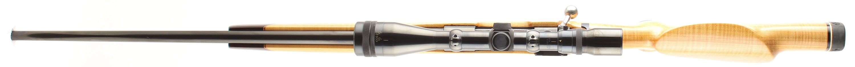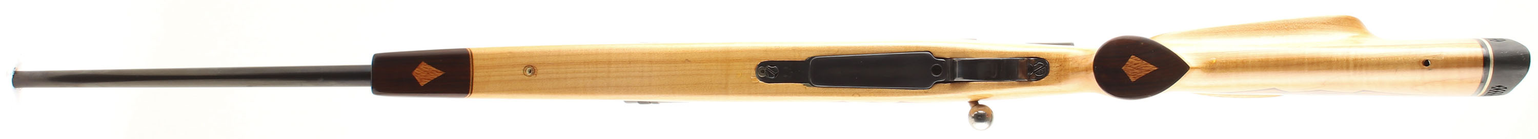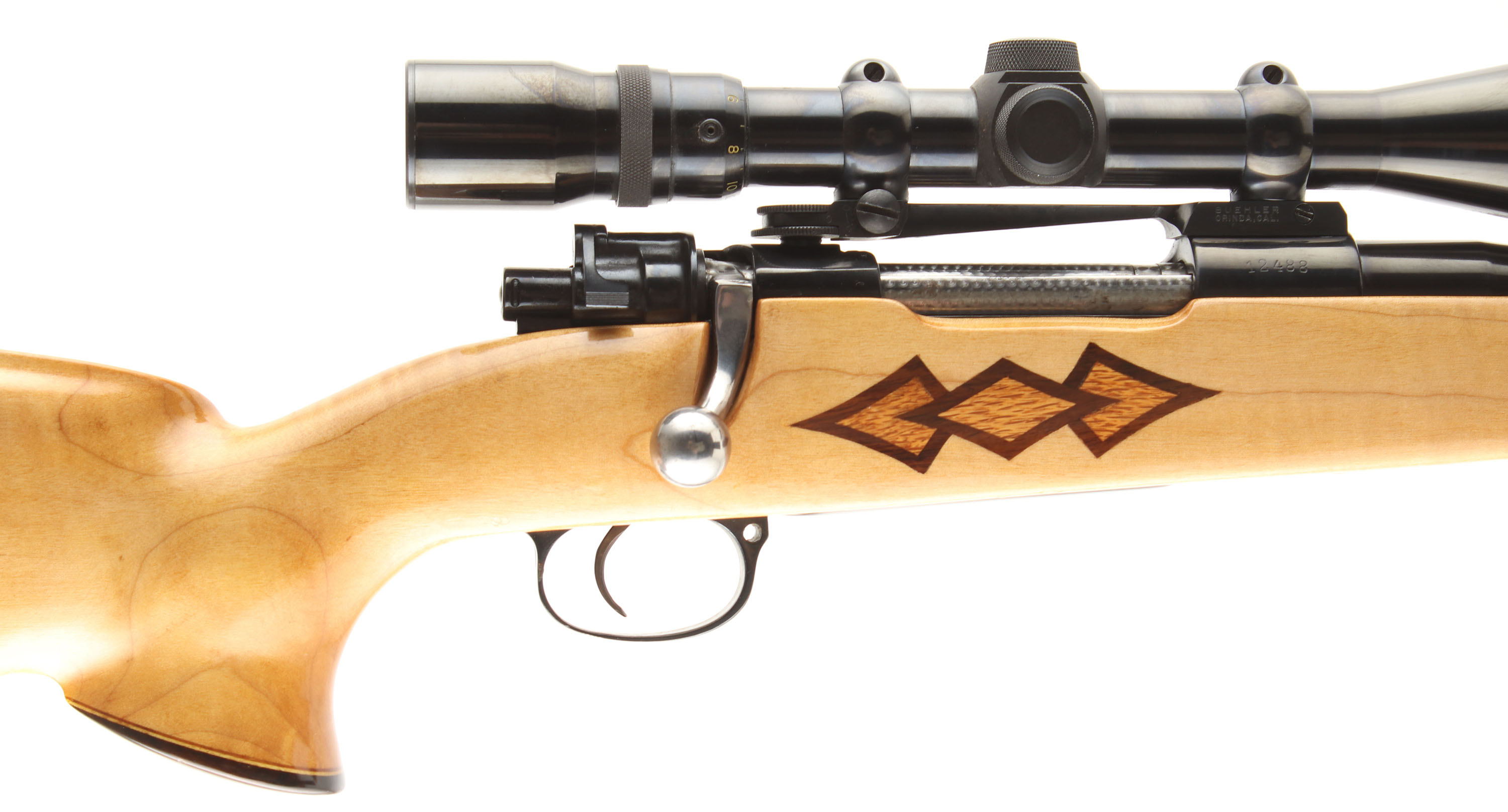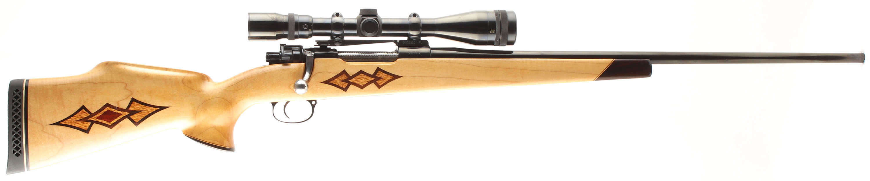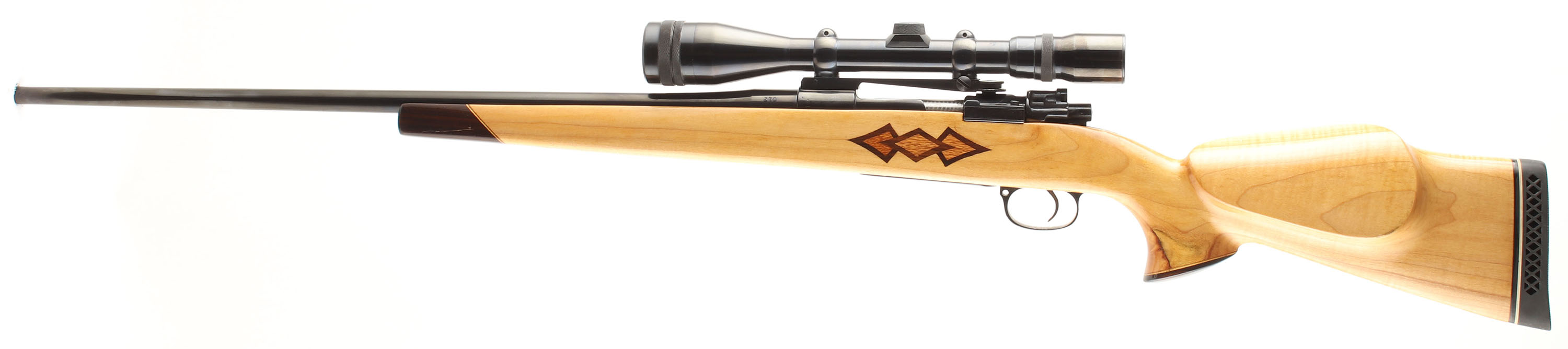 Custom Built Rifle, Built from a Fabrique Nationale Belgium M1924 Action, CAL: 270 WIN, MFG: 1924-30 Action, SN: 12488, Bolt Action Rifle, 24'' Round barrel. The custom cheeked & capped pistol grip Monte Carlo style wood stock is excellent, with slanted rosewood forend tip & pistol grip cap. The stock exhibits inlays on the forend tip, sides of the stock under receiver, right side of lower stock & pistol cap. There are a few very minor scratches, scrapes & scuffs to the excellent finish. Overall appearance of the stock is excellent. The metal blue finish rates 95% overall. The receiver carries a Weaver 12-1 4-12 scope on Buehler mounts, with no open sight provisions on the barrel. The barrel has only the caliber marking, while the receiver carries the SN stampings. Bore is excellent. Stock carries a Pachmayr White-line ventilated recoil pad. Sling studs missing. Jeweled bolt. An excellent customized military action to hunting rifle build. FFL or C&R Req. - Value: 600 to 1000