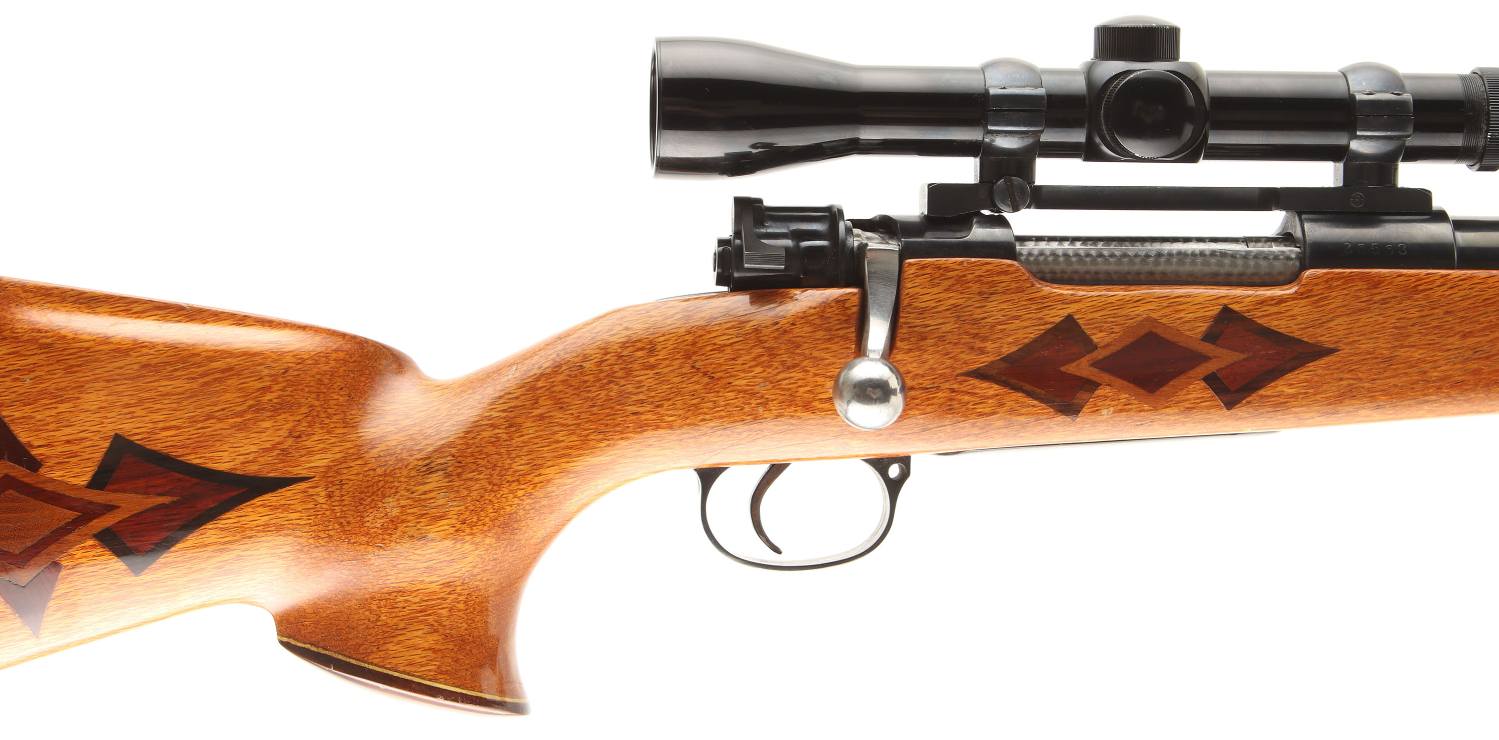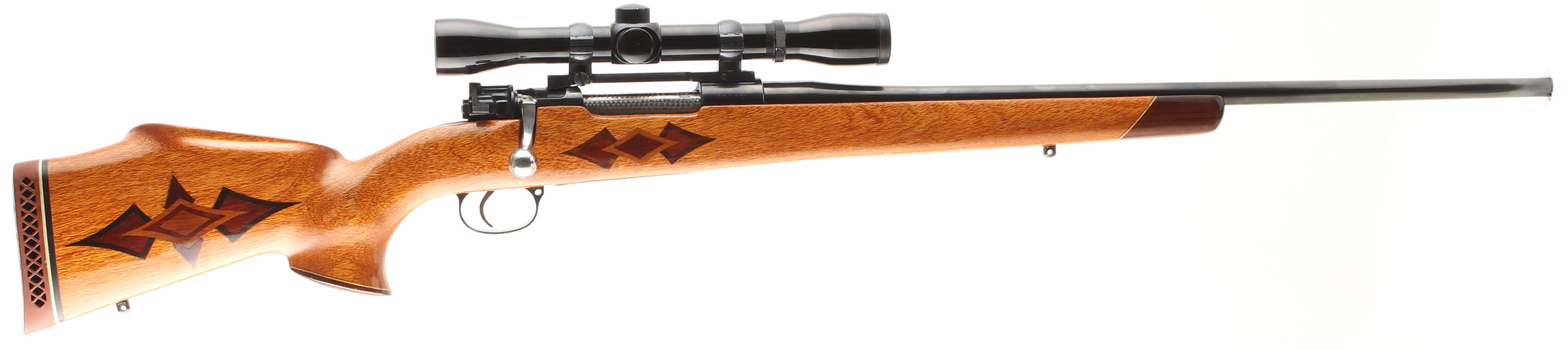 Custom Built Rifle, Built from a Fabrique Nationale Belgium M1924 Action, CAL: 243 WIN, MFG: 1924-30 Action, SN: 26563, Bolt Action Rifle, 22'' Round barrel. The custom cheeked & capped pistol grip Monte Carlo style wood stock is excellent, with slanted rosewood forend tip & pistol grip cap. The stock exhibits inlays on the forend tip, sides of the stock under receiver, right side of lower stock & pistol cap. There are a few very minor scratches, scrapes & scuffs to the excellent finish. Overall appearance of the stock is excellent. The metal blue finish rates 95% overall. The receiver carries a Bushnell Banner 4X scope on Redfield mounts, with no open sight provisions on the barrel. The barrel has only the caliber marking, while the receiver carries the SN stampings. Bore is excellent. Stock carries a Pachmayr White-line ventilated recoil pad. Sling studs. Jeweled bolt. An excellent customized military action to hunting rifle build. FFL or C&R Req. - Value: 600 to 1000