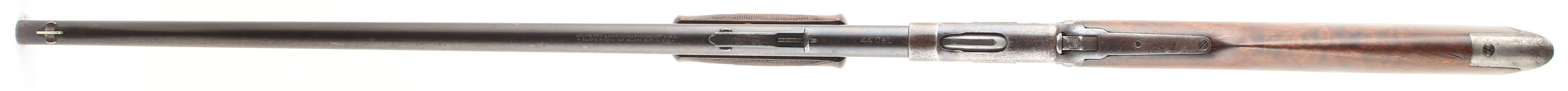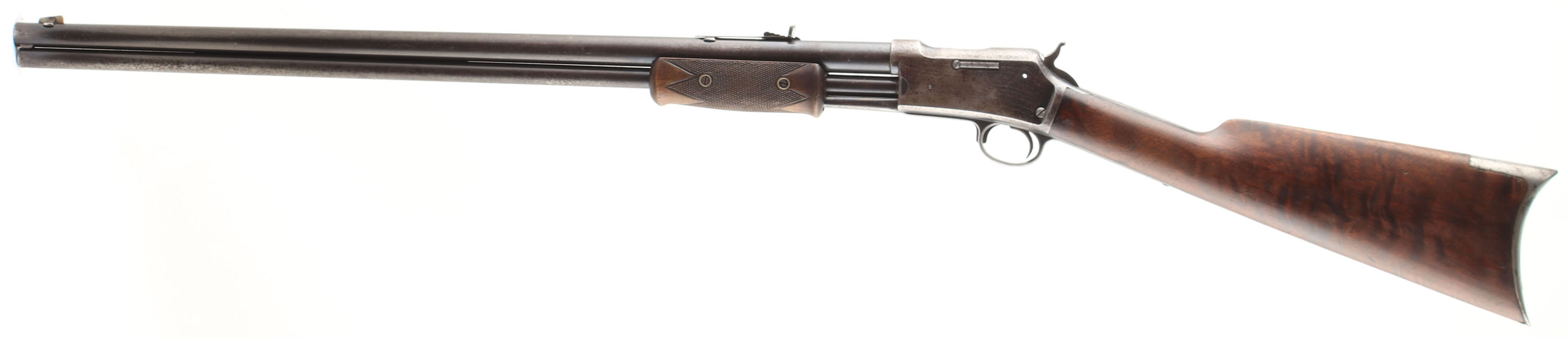 Colt Lightning, Medium Frame. Marked .44 CAL (44-40 WCF)., MFG. 1886, SN: 19956, Pump Action Rifle, 26'' Round barrel, Full mag. The factory straight grip stock & checkered forend are excellent, with minor to small scrapes, scuffs & contusions, to the evenly thinning original finish. The forearm checkering remains prominent, with some smoothing of the points & carries the original thinning finish. The original metal blue finish rates 60% on the barrel, 20% on the mag tube, with the receiver worn mostly gun metal gray & a thin brown patina, with remnants of original blue in protected areas. Bore is very good & bright, with some spotty areas of cleaned roughness. Barrel carries an adjustable rear & an elongated blade front sight. Crescent metal buttplate. Overall, very nice original & antique pump rifle. Antique, No FFL Req. - Value: 2500 to 4500