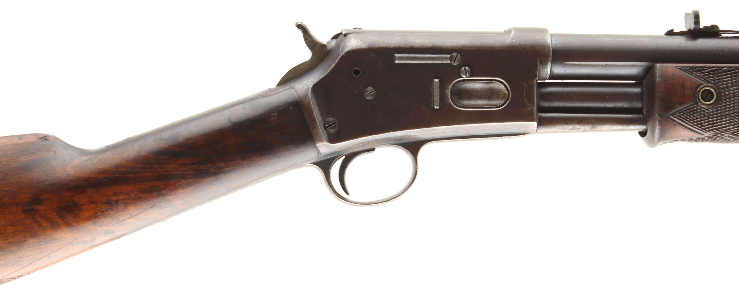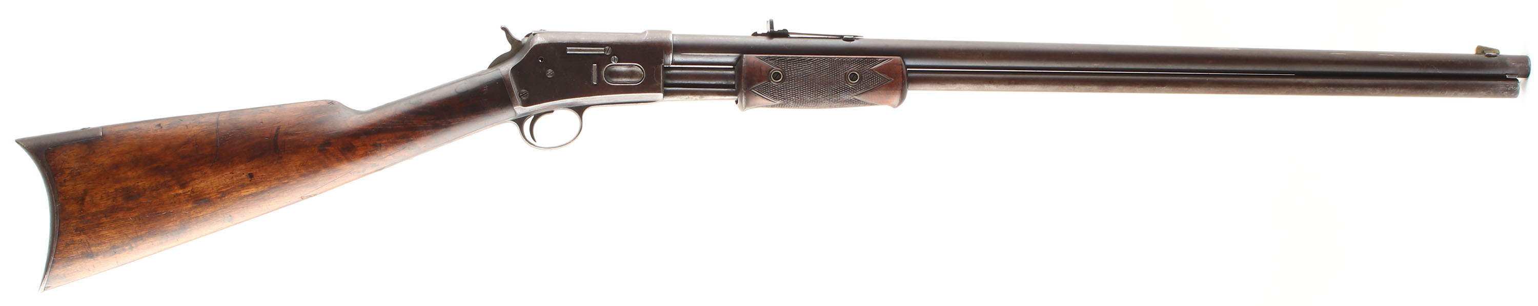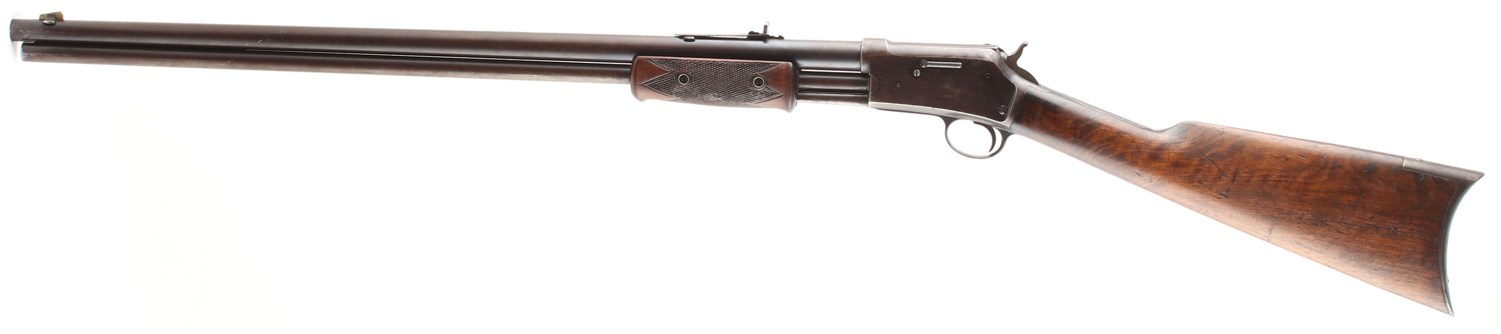 Colt Lightning, Medium Frame. Marked .32 CAL (32-20 WCF)., MFG. 1893, SN: 66805, Pump Action Rifle, 26'' Round barrel, Full mag. The factory stock is very good, with a checkered forend which remains excellent. The stock displays the most wear, with minor to small scrapes, scratches, & contusions. The has mostly worn thin & the stock appears to carry an added layer of finish over the remains of the original finish. The forearm checkering remains prominent, with some smoothing of the points & carries the original finish. The metal displays an even & thinning brown patina, with remnants of original blue finish in the more protected areas. Bore is good, with some dull roughness amongst strong rifling. Barrel carries an adjustable rear & an elongated blade front sight. Crescent metal buttplate. Overall, very nice antique pump rifle. Antique, No FFL Req. - Value: 2000 to 4000