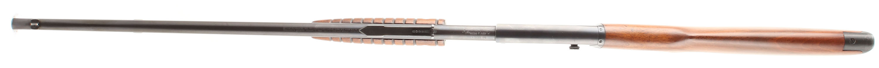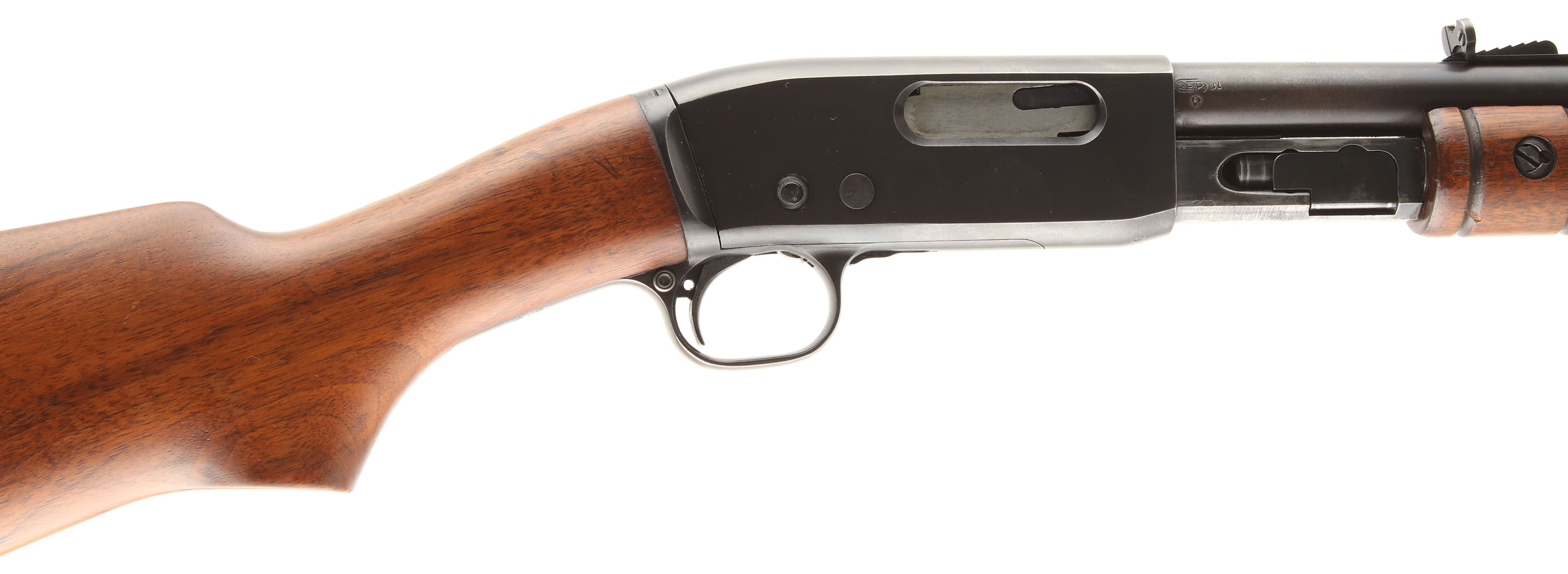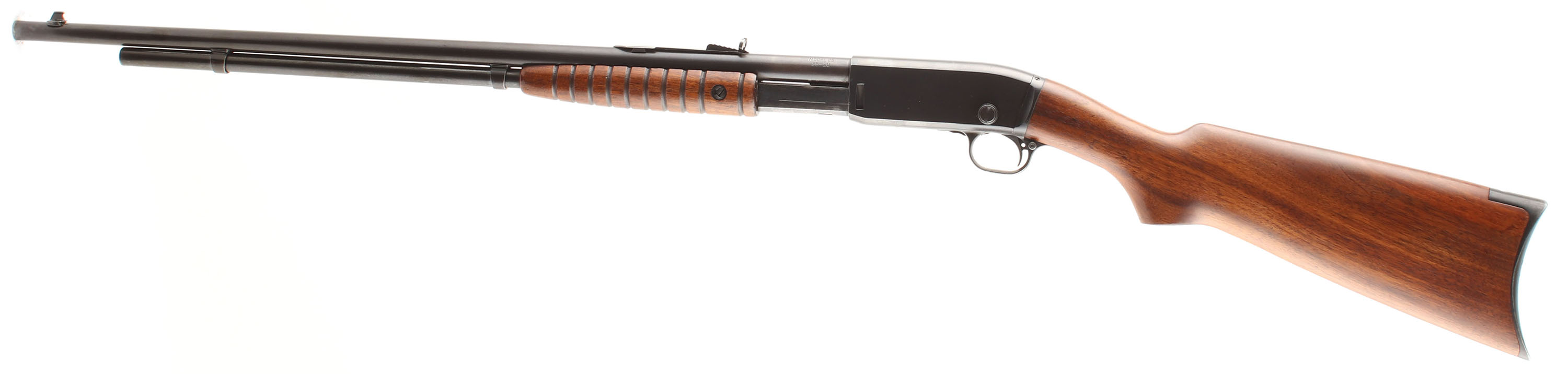 Remington, Model 25, marked 25-20, MFG: 1923-36 SN: 9545, Pump Action Take-down Rifle, 24'' round barrel. The original flat pistol grip wood stocks are excellent & solid, with the stock having been professionally cleaned, lightly sanded & nicely refinished to match the original finish still on the forend. There are minor finish level light scratches or handling marks to the stocks. The original factory metal blue finish has 90% coverage on receiver, 80% on the mag tube & barrel, with the barrel starting to tone plum in areas of thinning. Bore is excellent. Barrel carries an adjustable rear & standard front sights. Remington stamped crescent metal buttplate. These smaller caliber & light weight pumps were popular for small game & varmint hunting & most saw heavy use. With less than 32,000 model 25 rifles produced, nice examples are fairly rare. FFL or C&R Req. - Value: 500 to 1000