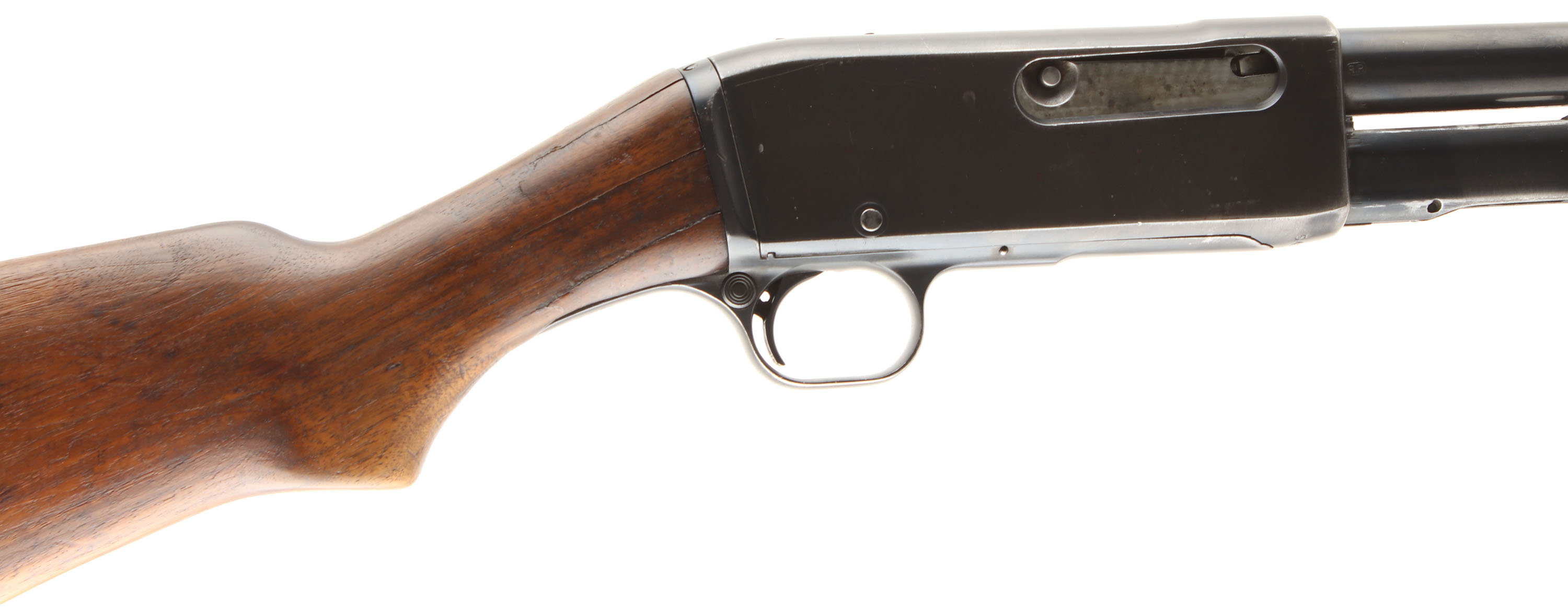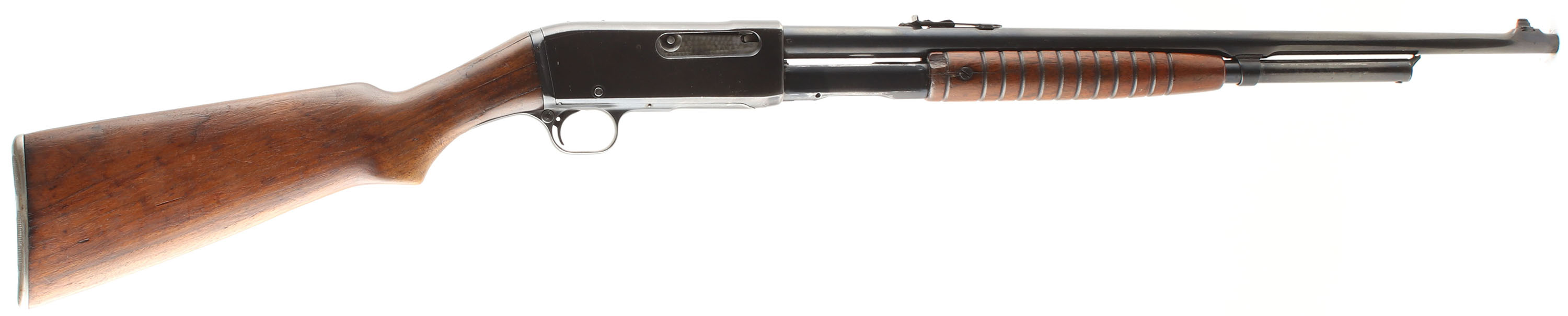 Remington, Model 14, .30 REM Cal., MFG. 1917, SN: 54148, Pump Auction Rifle, 22'' Round barrel, The rifle has been rechambered to 30 Rem, with the caliber marking being altered & displaying a ''30'' punch dot marking. The original flat pistol grip wood stock is fair & still solid, despite 8, 1'' to 2'' glued stress cracks at the wrist at the receiver or lower tang. Unfortunately, these stress cracks are very common to this model. The forend also has a few 1'' to 2.5'' stress cracks & a small wood chip. There are numerous minor to small scratches, gouges & contusions, with much of the original finish has worn away. The metal carries a reblue, with 80% coverage on the barrel, 60% on the receiver & mag tube, with some abrasions & cleaned pitting under the blue. The original mag tube has been replaced with a non-twist Remington Model 14 1/2 mag tube. Top of the receiver has two screw filled holes from previous optic mounting. The barrel carries a replaced adjustable rear sight & a King brass bead blade front sight. Bore is very good, bright & clean. The stock carries a fairly rare Remington reverse tear drop metal buttplate, which is a bit misfitting. Jeweled bolt. An early Remington pump shooter. FFL or C&R Req. - Value: 200 to 400