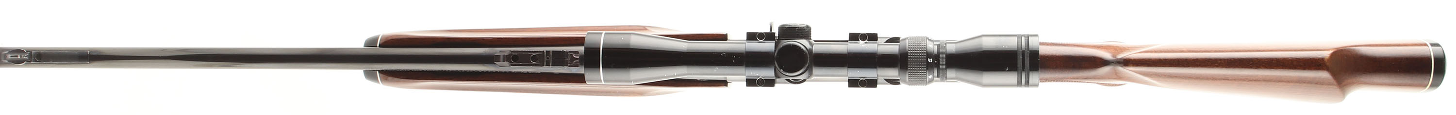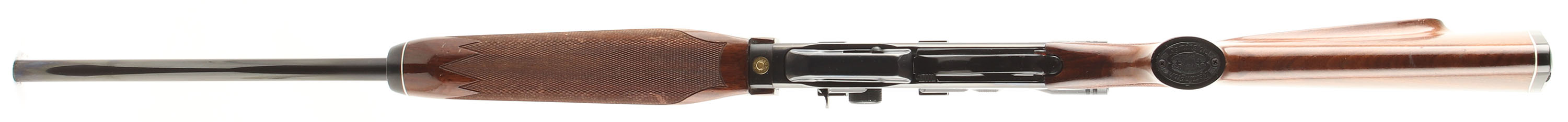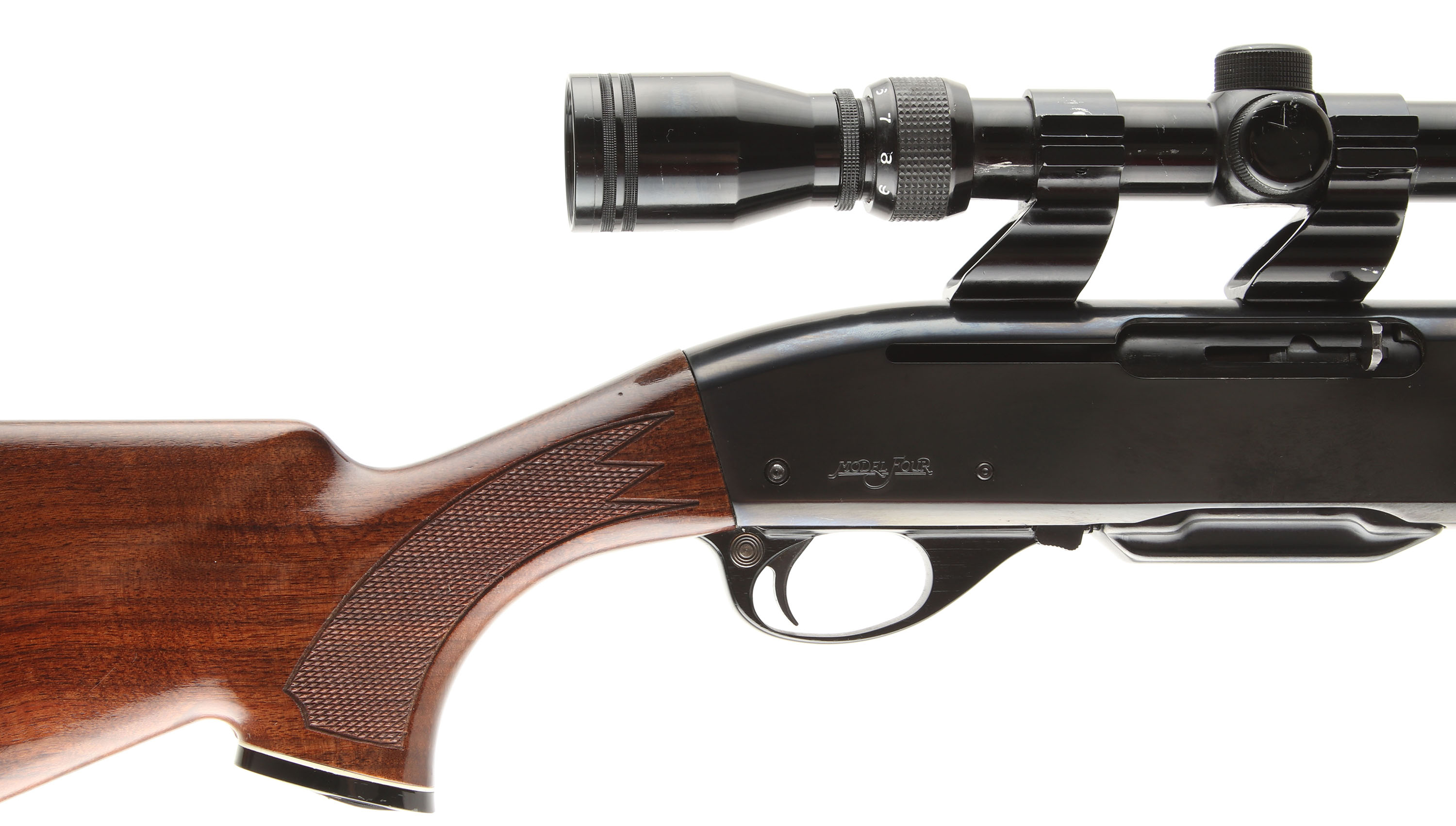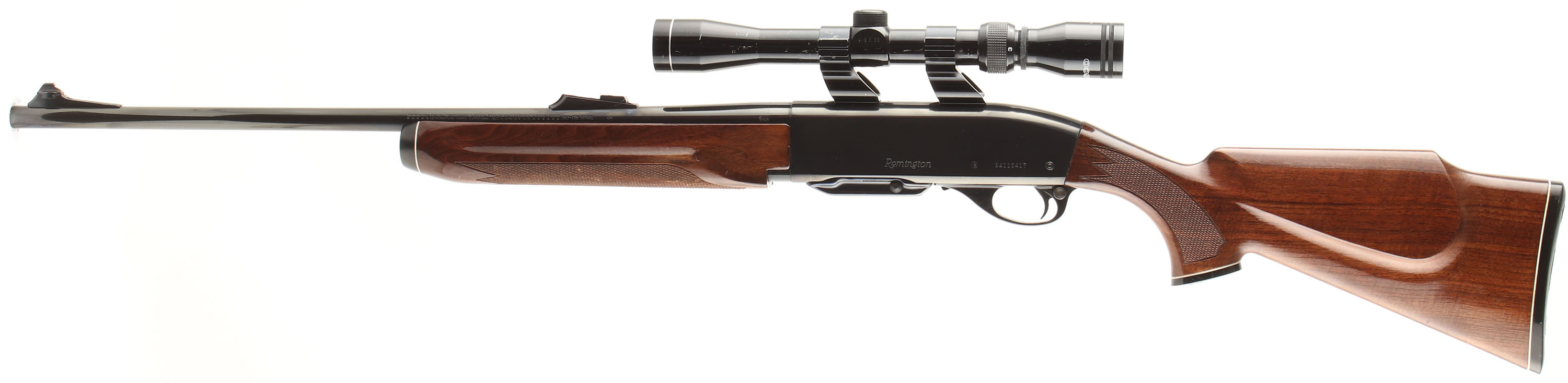 Remington, Model Four, CAL: 30-06 SPRG, MFG: 1984-87, SN: A4110417, Semi Auto Rifle, 22 1/2'' barrel. The original checkered, cheeked & capped pistol grip Monte Carlo style walnut stocks are excellent, with very few minor handling marks or rubs to the excellent original finish. The original metal blue finish rates 95% overall. Bore is excellent. The receiver carries a Tasco W39x32 3-9X32 scope, while the barrel holds the factory rear sight base, no sight, & a ramped blade front sight. The stock carries the factory buttplate. Detachable mag. Overall excellent & original condition. FFL Req. - Value: 600 to 1000