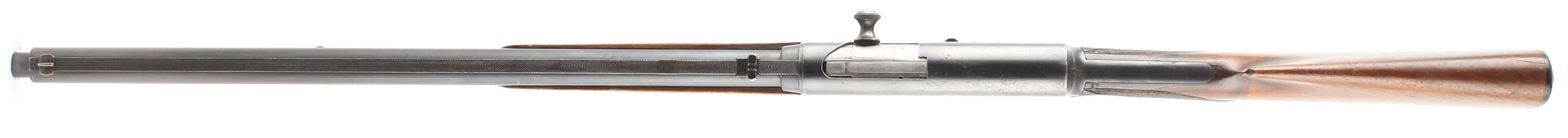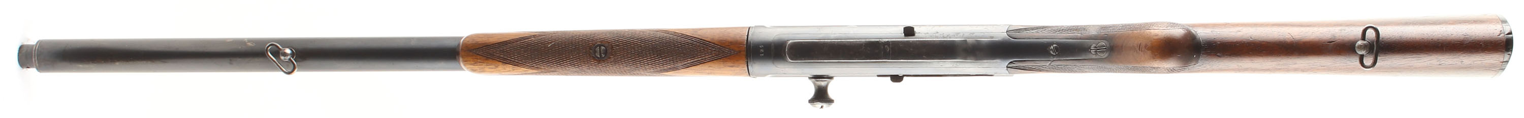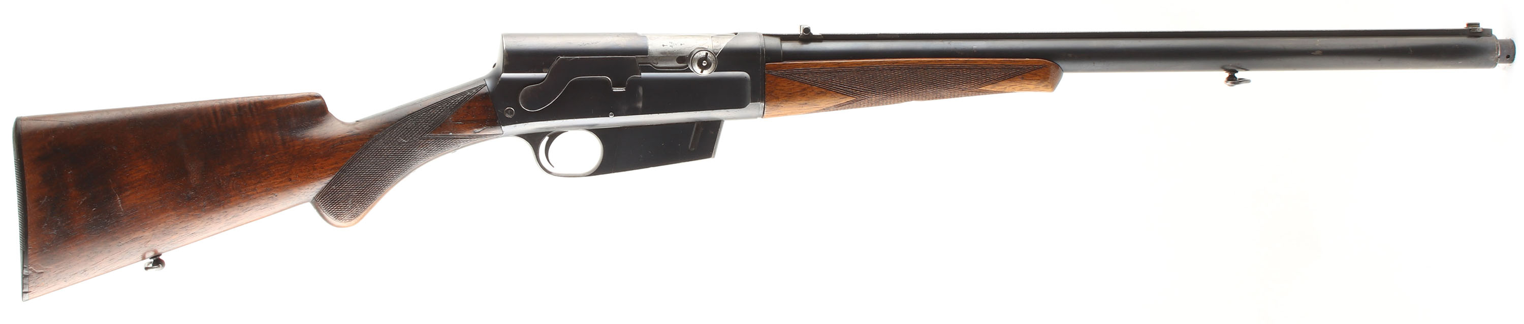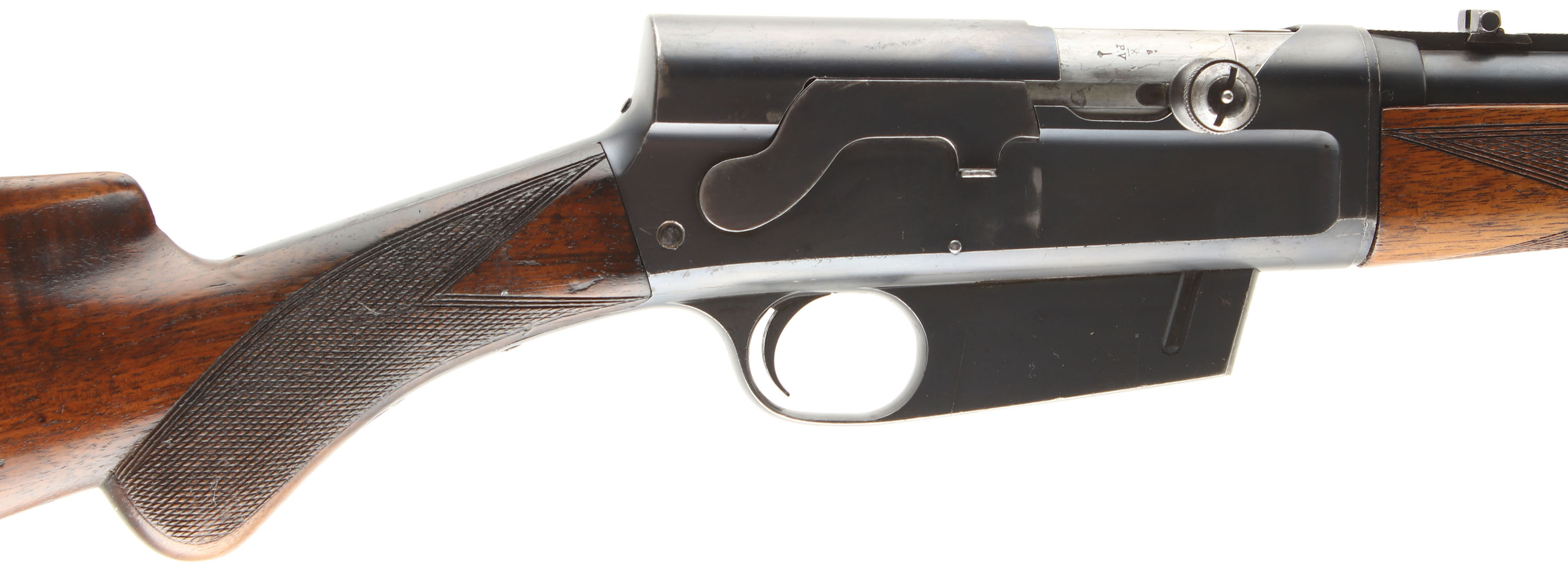 RARE FN (Fabrique Nationale), Model 1900, .35 Rem Cal., MFG. 1910-36, SN: 121, Semi-Auto Rifle, 22'' barrel, In Belgium it was known as ''La Carabine Automatique Browning'', in Germany it was the ''Selbstladebchse Browning Kaliber 9mm'', but in the U.S. we know it simply as the F.N. 1900. Records indicate only 4,913 Modele 1900's were ever produced. While records indicate 2909 rifles were produced for the years 1910-21, with no allocation to a particular year during that time, it is very likely that SN 121 is a first year production rifle. This rifle, invented by John Browning, was one of Europe's first successful semi auto high-power rifle. FN obtained the rights to produce the rifle as early as 1902, however, they chose to focus their production efforts on the A5 shotgun, which they acquired production rights to at the same time. They correctly viewed greater consumer sales potential in the A5. By 1904 restrictive importation tariffs into the U.S. caused Browning to negotiate with FN to allow manufacture of his shotgun within the U.S. The Remington Arms Co. was eager to work with John Browning & acquire the rights to manufacture both his autoloading shotgun & his autoloading rifle. FN was first to introduce the long-recoil shotgun (A5), but it was Remington that first produced John Browning's long-recoil rifle in 1906, dubbed the ''Autoloading Rifle'' or more commonly known today as the Model 8. If the Remington Model 8 is the grandfather of American semi-automatic sporting rifles, the F.N. 1900 is its European twin. The FN model 1900 was marketed throughout the world except the U.S., while the model 8 was intended for the U.S. market. Production comparisons place the model 8 at around 70,000, nearly a 14 to 1 difference in total FN production. Since the FN was not sold in the U.S. market, few examples of the limited 4913 total produced are found amongst collectors in the U.S. It is known that some were vet bring-backs from two World Wars & at least a few were imported by John & his son Val Browning into the US. Since the FN was exported to Canada, some have made their way south of the border. Regardless of how they arrived, they are rare & very desired amongst John Browning, FN & Remington 8 & 81 collectors. Produced with old-world craftsmanship, these rifles are a testament to Fabrique Nationales world-wide reputation for manufacturing high quality firearms. It doesn't take long to notice there were probably more hours of labor involved in producing the FN over the Remington. A close inspection & disassembly of both rifles will reveal a significantly superior fit & finish with the Belgium made version, even over early production Model 8's. The FN came in two versions, neither of which were a higher grade than the other. One version had a standard barrel jacket like the Model 8, the other a solid barrel rib running the length of the jacket, which is the case with this example. These take-down rifles were often broken down into the 22'' & 20'' halves & placed into travel cases for train rides into the countryside for hunting. The rifle has an English walnut round knob pistol grip stock & schnabel tip forend. Hand cut factory checkering is 20 lines-per-inch, with the early 1st style 6 point forearm checkering pattern. All hand fit & assembled, to that point stocks do not always interchange one rifle to another & factory LOP can vary by as much as a full inch. LOP on this rifle is 13 7/8''. The stocks original condition is very good, with honest use wear & some thinning to the original finish. The finish has darkened a bit in areas of the stock, with some smoothing to the points of the hand cut checkering. There are also minor to small handling scuffs, scratches & contusions. The barrel carries a solid matted rib, which carries the front & rear sights. The rear sight is the original two position flip sight, but it has been moved rearward towards the receiver approximately 2'' & a blank fills the original dovetail. The original metal blue finish rates 85% on the barrel, 75% on the receiver, with blue thinning most on the magazine. There is spotting & some cleaned light pitting or abrasions mostly found on the left side of receiver & mag. There is also a dent on the bottom of the magazine, along with some abrasions. The left side of the receiver carries the factory roll stamp & proof markings. Matching SN's on the receiver, barrel, side of lower tang, bottom channel of stock & inside of forend. Bore is excellent & bright. The stock carries the early FN serrated buttplate, with some minor edge chipping. Factory sling loops. Tight action & all appears to function as it should. Overall, the rifle has a very nice vintage & original appearance, which is highly collectible as a rare & early 1st year production rifle. FFL or C&R Req. - Value: 3000 to 4500