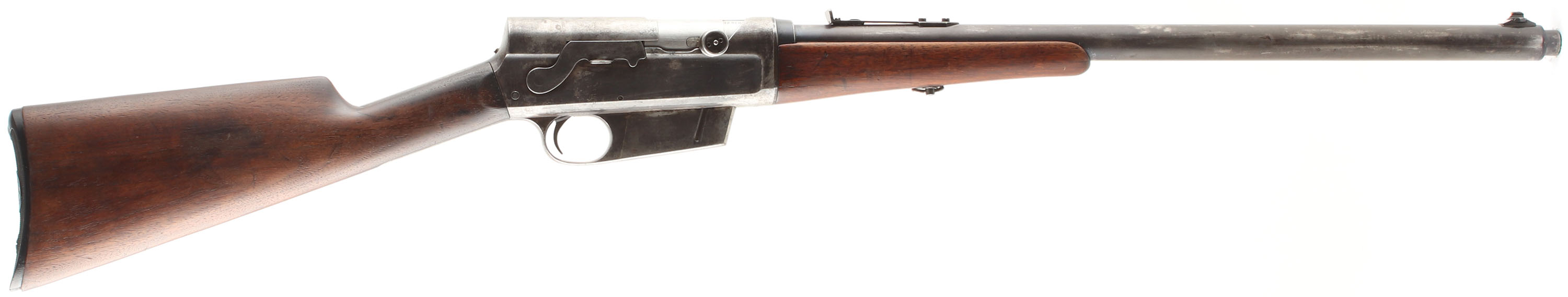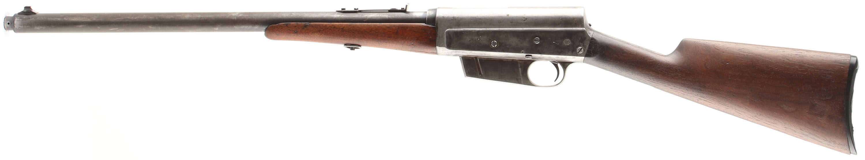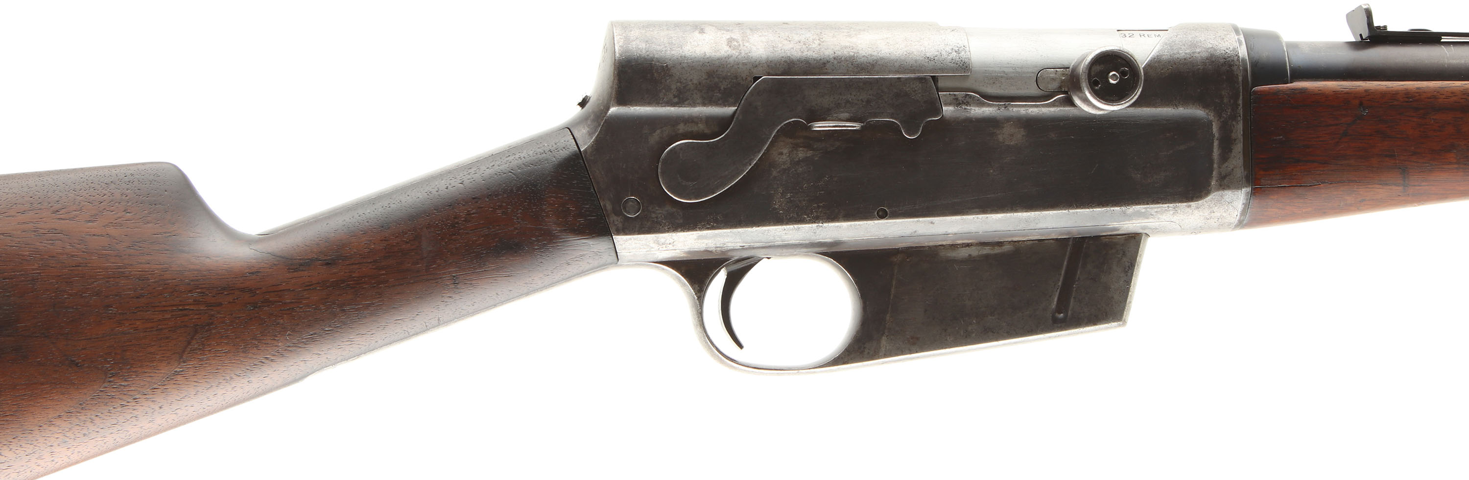 Remington, Model 8, 32 REM CAL, MFG. 1907, SN: 2735, Semi-Auto Rifle, 22'' barrel. This is a 2nd year early production rifle. The original straight grip stock is very good & solid, despite a couple of short stress cracks emanating from the end of the upper tang. Nearly all of the original finish has evenly worn off from use & there are minor handling marks, light scratches & contusions. The stock displays the early wrist cheeks where the stock meets the back edge of the receiver. The forend is good & solid as well, despite a couple of 2'' & 2 1/2'' cracks on the backend & some missing slivers of wood to the edge & left side corner. The finish has worn thin & there are numerous minor scratches, scrapes & contusions. The original metal blue finish has worn mostly gun metal gray, but with spotty remnants of blue in more protected areas. There is speckling & spots of cleaned pitting, found mostly on the receiver. The rifle carries the early first variation safety lever. The rifle once carried a tang sight, but currently only has a replaced filler screw in the factory provision. The barrel is fitted with an adjustable rear sight & a Marble No. 2 white bead front sight. Bore is excellent. Stock carries a modern reproduction, checkered Remington buttplate, which is a bit undersized, leaving the wood proud along the edges. 5 rd fixed magazine. An early production rifle, with early production features. FFL or C&R Req. - Value: 400 to 800
