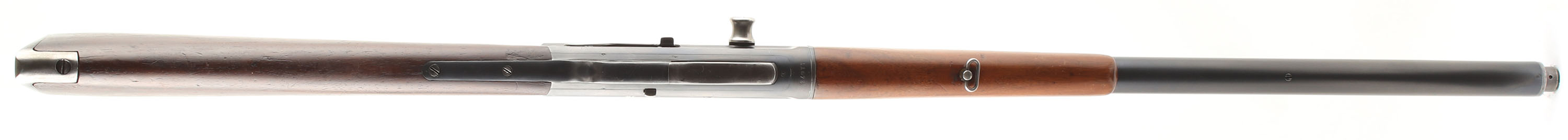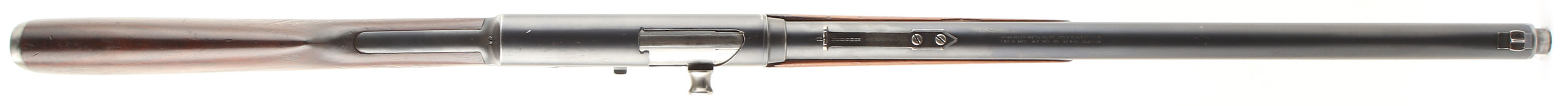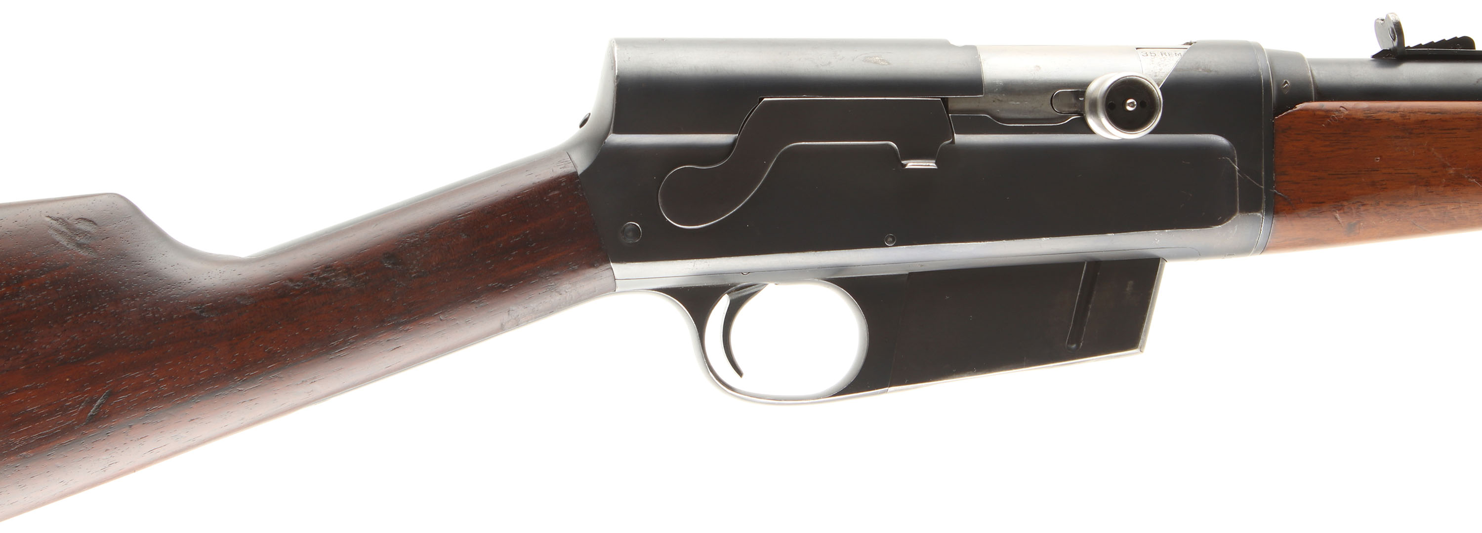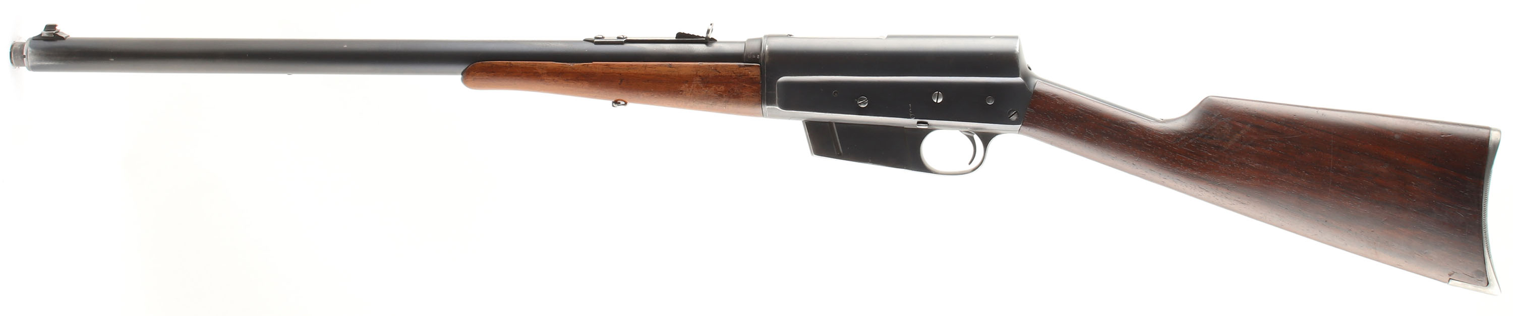 Remington, Model 8, .35 Rem Cal, MFG. 1908, SN: 11673, Semi-Auto Rifle, 22'' barrel. The original straight grip & schnabel forend stocks are very good, with the stock having been cleaned, lightly sanded & reoiled. There are minor scratches & handling marks remaining, along with some larger contusions & scrapes. The forend also displays numerous minor scratches & contusions, with corners chips at the back end & a sliver of missing wood along the left edge. The original metal blue finish rates 85% on the barrel & 75% on the receiver, with even wear loss or thinning from honest use. Bore is excellent, bright & clean. The barrel carries a standard adjustable rear & blade front sights. The stock carries a serrated & bottom tang, crescent metal buttplate. 4 round fixed magazine, with some contusion dents on the belly. Tight action. An overall nice looking & great shooting condition rifle. FFL or C&R Req. - Value: 500 to 1000