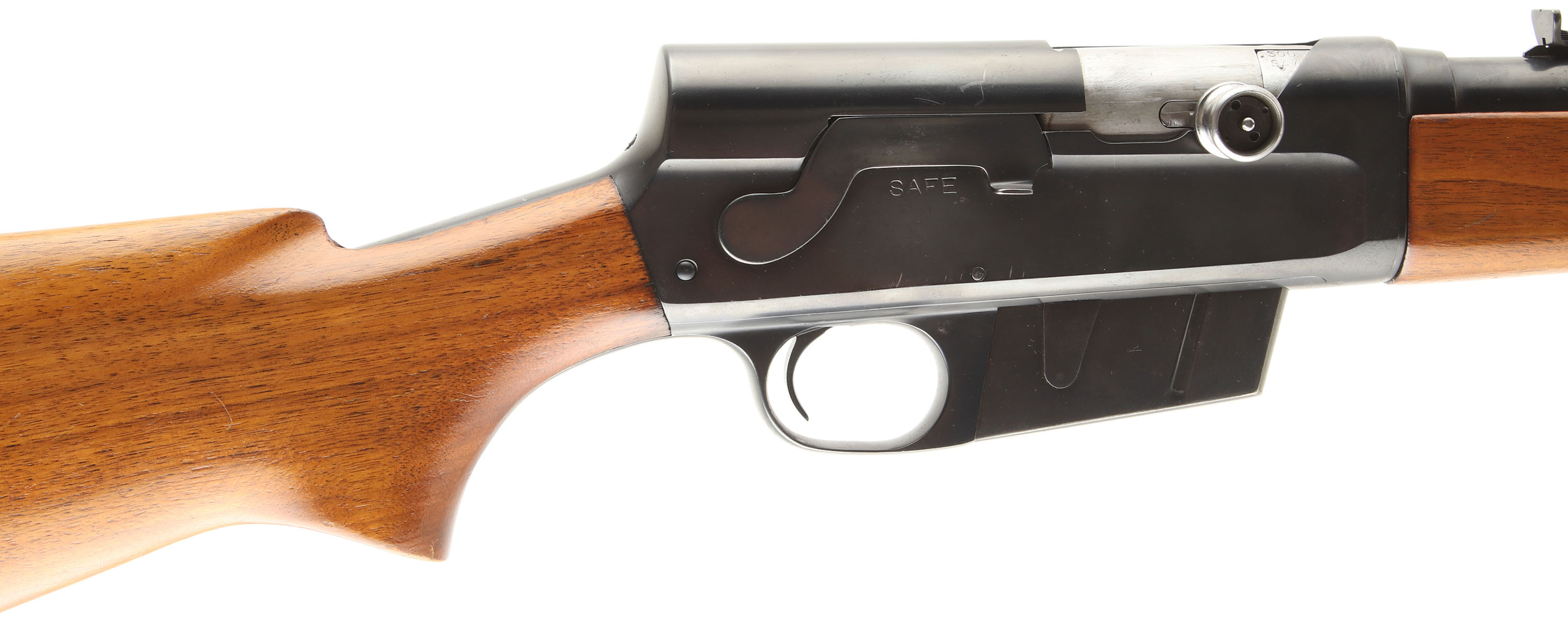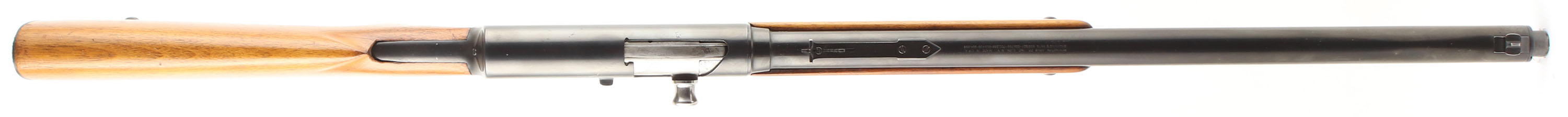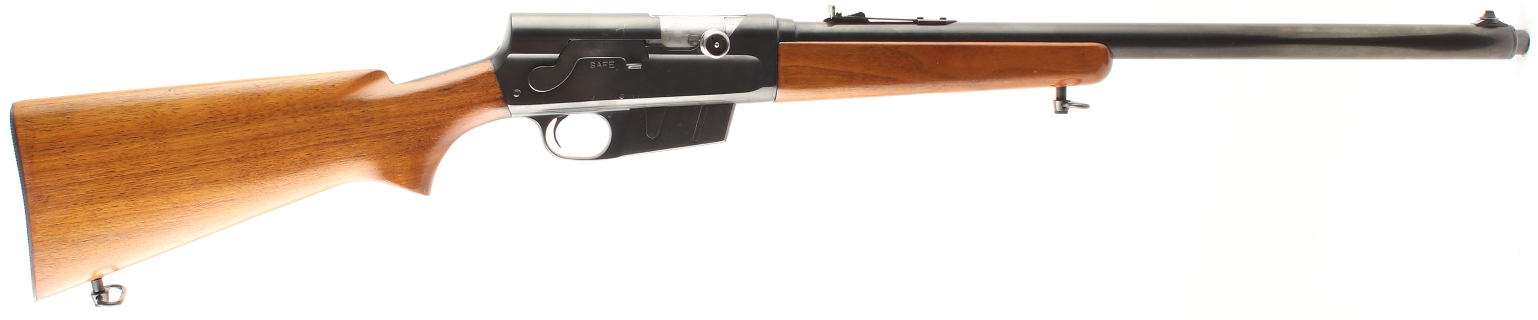ODDITY Remington, Model 81, .22-250 REM. CAL., MFG. 1945, SN: 23373, Semi-Auto Rifle, 22'' barrel. This rifle is very unique as it has undergone a restoration & conversion. The rifle started life in 300 Savage caliber & is factory marked as such on the barrel bell. Over the span of 45 years of collecting these rifles as a family, we have encountered a handful of these rifles. The story as shared with us as to how these 22-250 rifles came to be is unique. Apparently there was a southern Oregon gunsmith who was known to convert Remington model 8 rifle into 22-250 & 300 Sav. calibers before Remington ever produced the 300 Sav. caliber in their Model 81 rifles. It was a Remington factory rep. during his business travels that stumbled onto one of these rifles & the gentleman who had converted it. He was so impressed with the 300 Sav. version that he asked to borrow the rifle to take it back to Remington's head quarters to be tested for possible factory production. Remington's R&D & their Brass, were also so impressed, that the 300 Sav. caliber soon became a regular offering within the Model 81 production. Although this is obviously not one of the those conversion 300 Sav. rifles, rather it was a factory 300 Sav. that was likely converted to the 22-250 caliber by this same gunsmith. The few that I have encountered or heard of, had their caliber marking changed from the original, which is not the case with this rifle, therefore retaining the original 300 Sav. factory stamping. According to the consignor, this rifle was tested & verified by his gunsmith as correctly fitting, firing & functioning as a 22-250. However, we have not verified or tested the rifle ourselves. Also the story of its possible origins & conversion is simple the sharing of information as shared with us. The original flat pistol grip wood stocks are excellent, having been cleaned & refinished, with some thinning in the carry areas. There are tiny to minor handling marks, scrapes & contusions remaining. The metal blue finish was professionally restored, with 95% coverage. There is some cleaned speckling & a bit of spotty orange peel under the blue in areas. The barrel carries the standard front & rear sights. Bore is excellent, clean & bright. Stock carries the original Remington checkered metal buttplate. 5 rd fixed magazine. Sling swivels in stock & forend. A very unique & overall excellent condition 81 rifle, which likely has collectible interest to 8 & 81 collectors or fans of the 22-250 caliber. FFL or C&R Req. - Value: 600 to 1200
