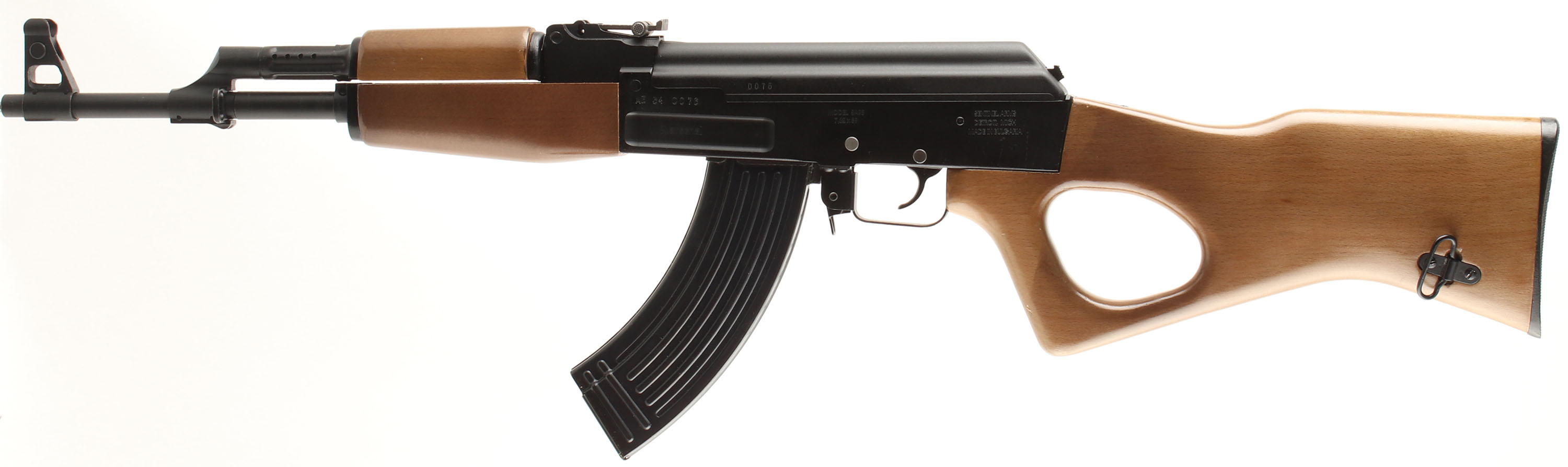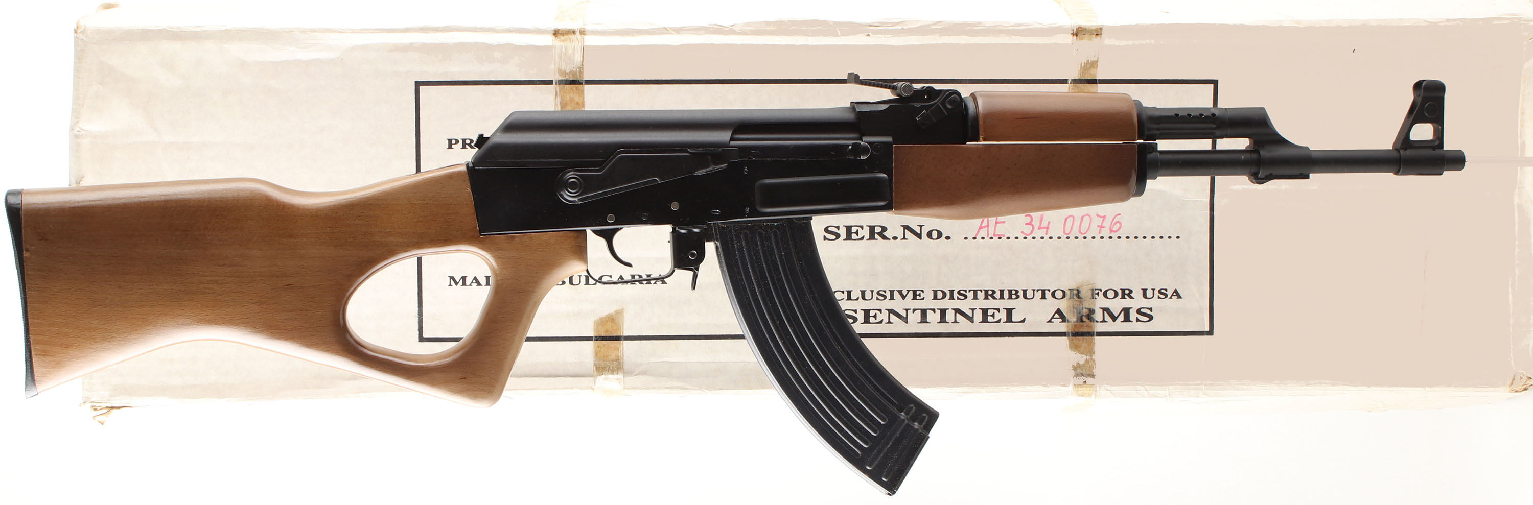 BOXED Arsenal (Sentinel Arms), SA93, CAL: 7.62x39, MFG: 1994. SN: 0076, Semi Auto Rifle, 16'' Barrel. The wood thumbhole stock & forend are in excellent condition, solid with minimal wear. The black finish on the gun is excellent with minimal wear. Bore is excellent, bright with strong rifling. Mechanically solid, seems to function well. The gun has a ladder style rear sight & a front sight post. Comes in the correct importers box with one 10 round magazine, four 30 round magazines, a sling, an oil tin, a small cleaning kit, an owners manual & other related paperwork. FFL Req. - Value: 500 to 1500