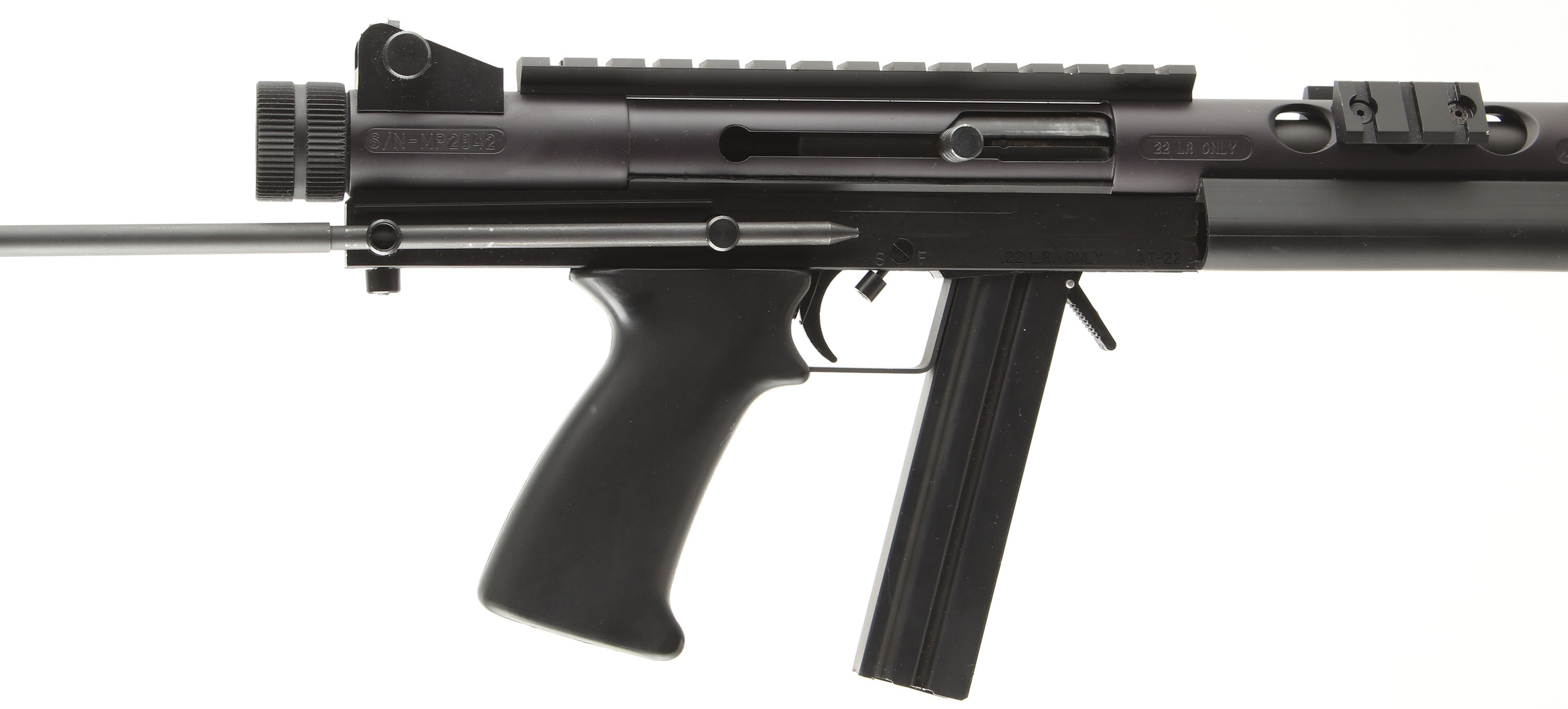 CASED, AWI Eaton Co (Feather Industries), Model AT-22 ''Rav-22LR'', CAL: 22LR, MFG: Modern, SN: MP2842, Semi Auto Rifle, 17'' barrel. The synthetic black pistol grip is excellent. The matte black finish on the frame/receiver rates 99%+. The matte black finish on the barrel & heat shield rates 95%, with handling marks from honest use. Bore is excellent. Factory sights. Factory picatinny rails for optics & accessories. Comes in a factory soft carrying case, with related paperwork & unopened 20rnd mag. A neat little semi-auto take-down rifle. FFL Req. - Value: 300 to 400