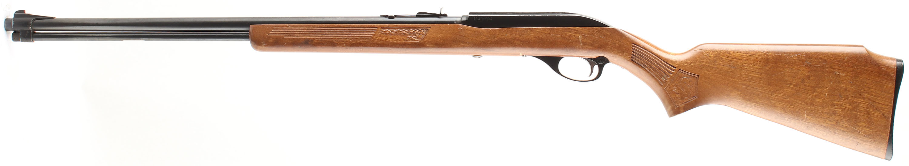 Marlin, Model Glenfield 60, CAL: 22LR, MFG: 1971, SN: 71430534, Semi Auto Rifle, 22'' barrel. The original flat pistol grip Monte Carlo stock is excellent, with a few minor handling marks to the original finish. The wood features pressed squirrel, oak leaves & stripe accents. The original metal blue finishes rates 85% overall. Bore is excellent & bright. The receiver previously had a scope mounted, while the barrel carries an adjustable rear & ramped blade front sights. Stock carries a checkered plastic buttplate. 14 rnd tube mag. Very nice overall. FFL or C&R Req. - Value: 150 to 300