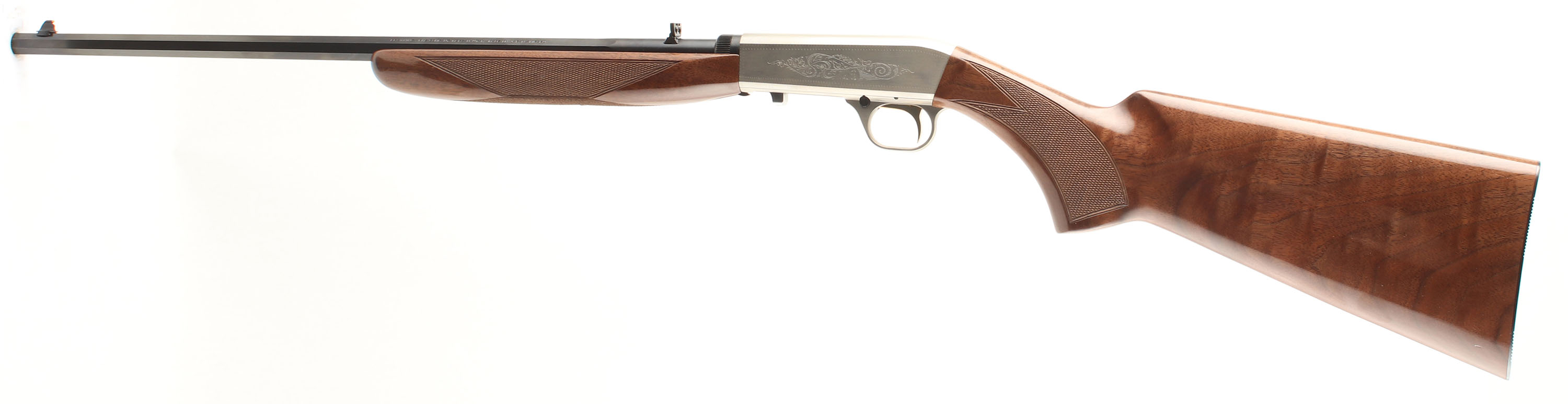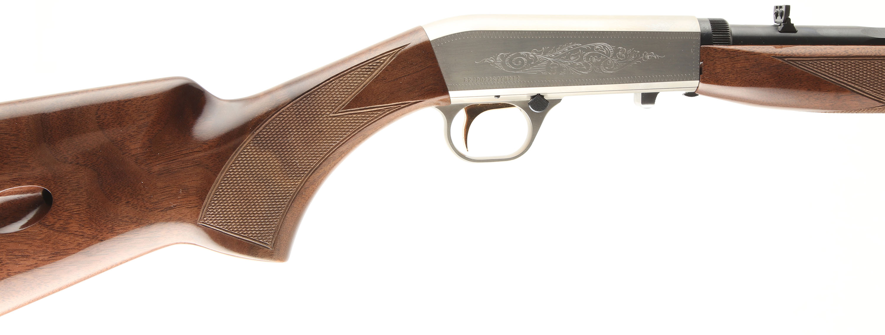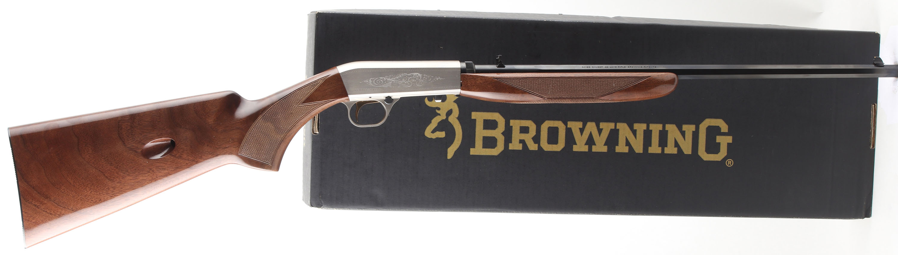 BOXED, Browning, Model SA-22 AUTOMATIC, JAPAN GRADE 2, CAL: 22LR, MFG: MOD, SN: BRJP02287YM212, Semi-Auto Rifle, 19 3/8'' Octagon barrel. The original checkered & flat pistol grip stocks are excellent, with a couple of tiny handling or storage marks to the excellent original high gloss finish. The metal blue finish on the barrel rates 99%. The silver receiver displays decorative scroll & vine engraving & rates excellent. Bore is excellent. The barrel carries factory sights. Original metal buttplate. BASICALLY NOS. Comes in SN matching factory box, with original booklet & & lock. Excellent overall. FFL Req. - Value: 1000 to 1500