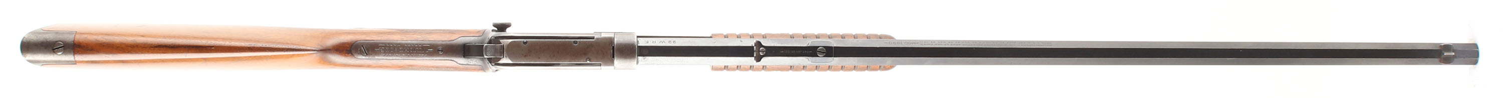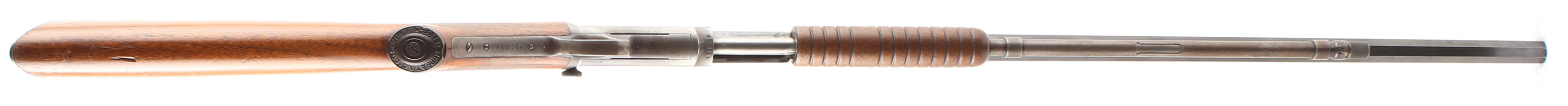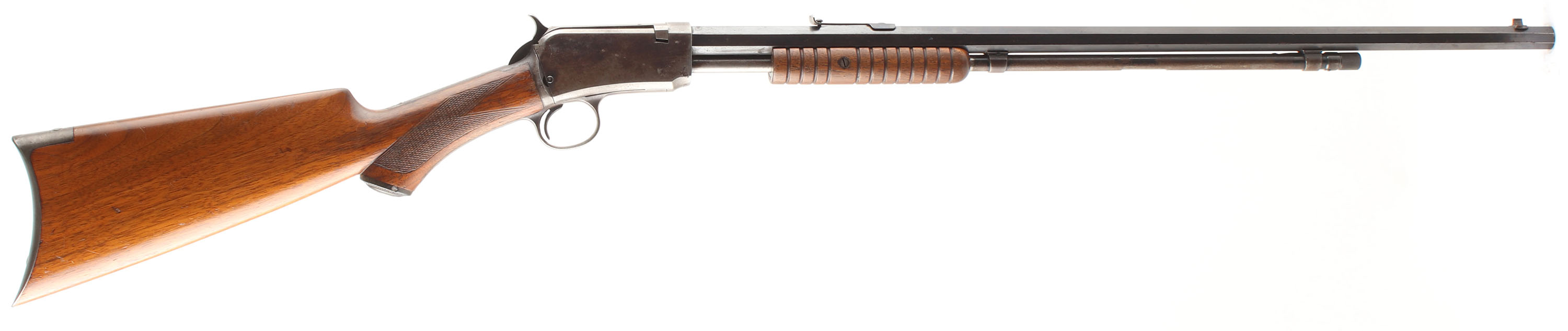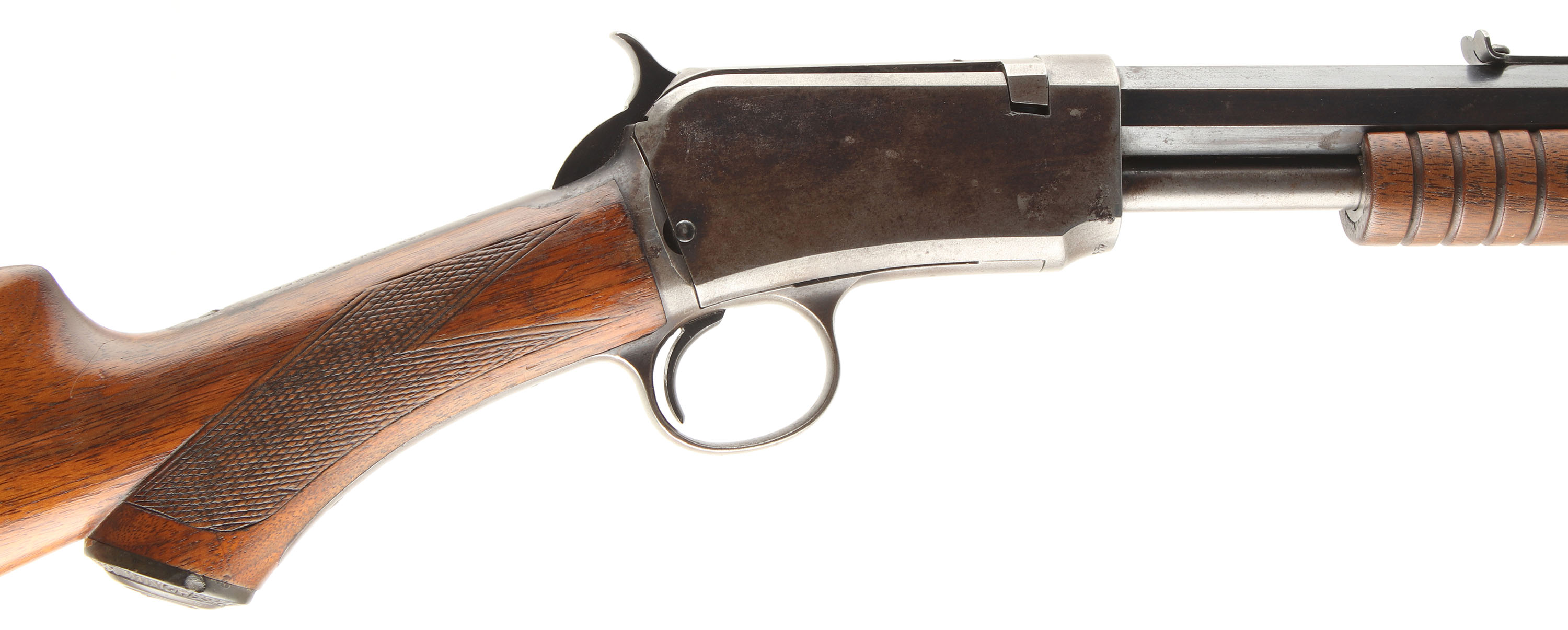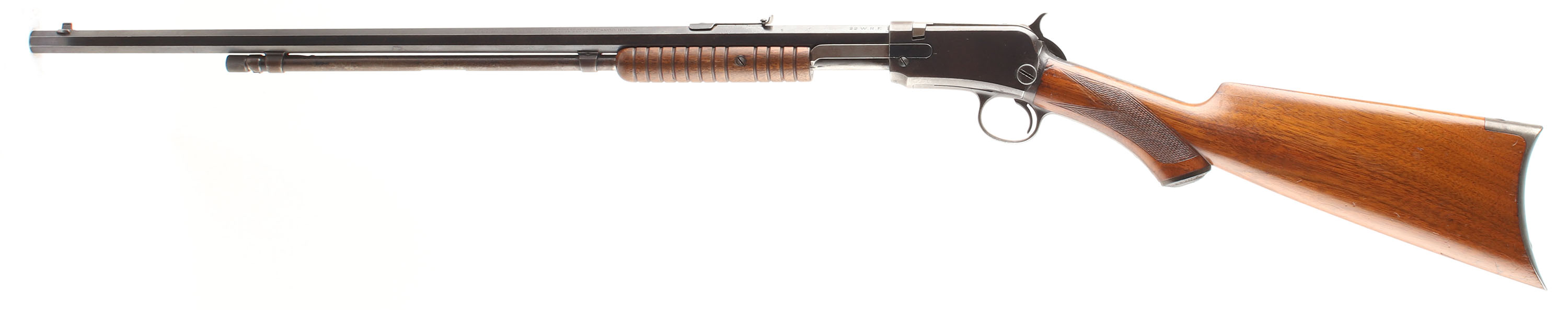 RARE DELUXE Winchester, Model 1890, 3rd variation, .22 WRF, Cal., MFG. 1912, SN: 493114, Pump Action Rifle, 24'' Octagon barrel. Special ordered WRF deluxe rifle. The original factory checkered, capped pistol grip wood stocks are excellent. There are several tiny to minor handling marks, thin scratches & contusion to the very good original finish, with thinning at the carry points of the wrist & forend. There is a couple of small chips to the edge of the pistol grip cap. The original metal blue finish rates 75% on the barrel, toning a bit plum in areas of thinning loss. The right side of the receiver has worn mostly gun metal gray, with a thin brown patina. The left side still maintains 50% of the original blue finish. The mag tube is also worn mostly gun metal gray, with remnants of blue along the upper sides protected by the barrel. The rifle is fitted with standard adjustable rear & small blade front sights. Bore is good, with areas of cleaned roughness amongst solid rifling. Crescent metal buttplate. Smooth tight action. An overall very nice & original deluxe 1890 rifle This is a rare & unusually configured collectible 1890 rifle. FFL or C&R Req. - Value: 3000 to 4500