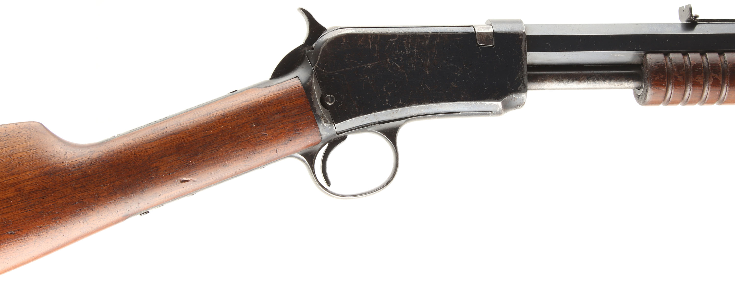 Winchester, Model 90, .22 LONG RIFLE Cal., MFG: 1923 SN: 689947, Slide Action Pump, 24'' Tapered octagon barrel. The L.R, only caliber is the rarest & most desired caliber amongst collectors as only 10% of total production was this caliber. The L.R. caliber was added in the mod 90 line-up in 1919. The original wood stocks are excellent, with several minor handling marks, scratches & light contusions to the original finish. The original metal blued finish rates 90% on the barrel, 60% on the receiver, & 30% on the mag tube, with loss on the receiver due to scratches & wear. Bore is excellent. Barrel carries the original front & rear sights. Factory crescent steel buttplate. Excellent original example of a single caliber 90 remaining in very high collectible condition. FFL or C&R Req. - Value: 1000 to 2000