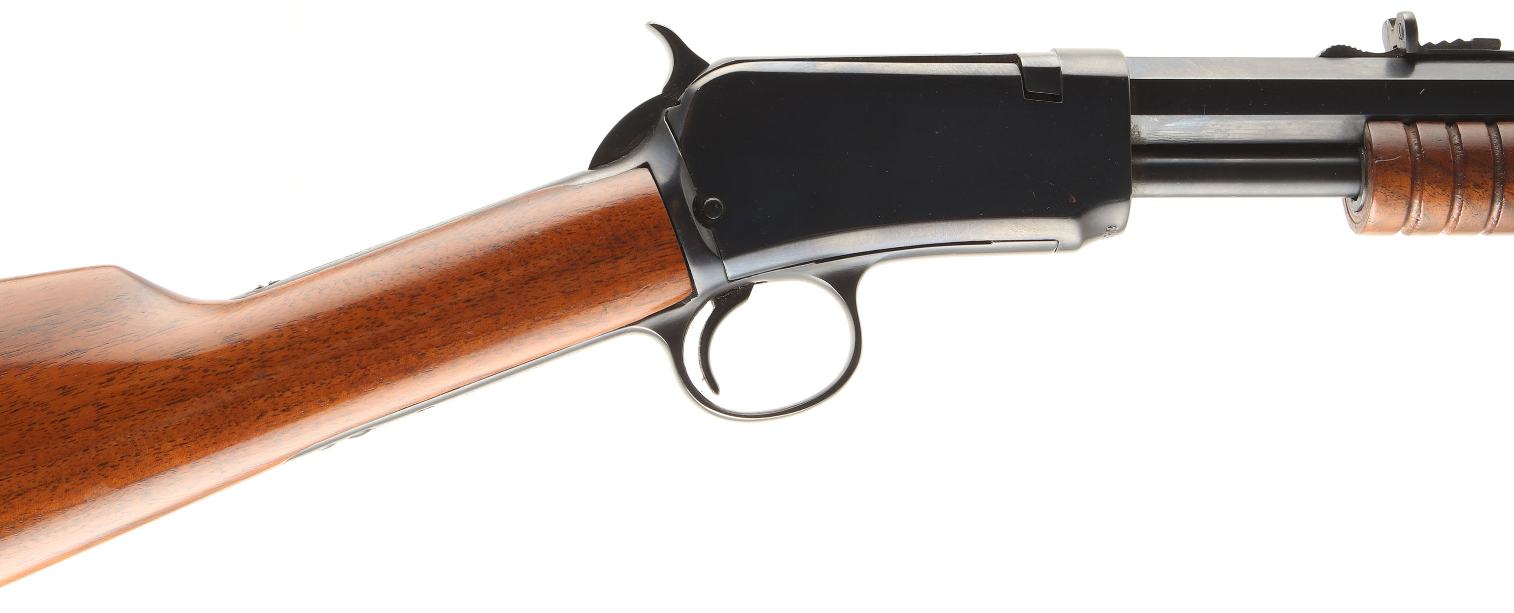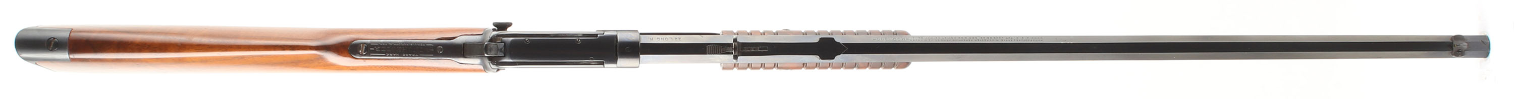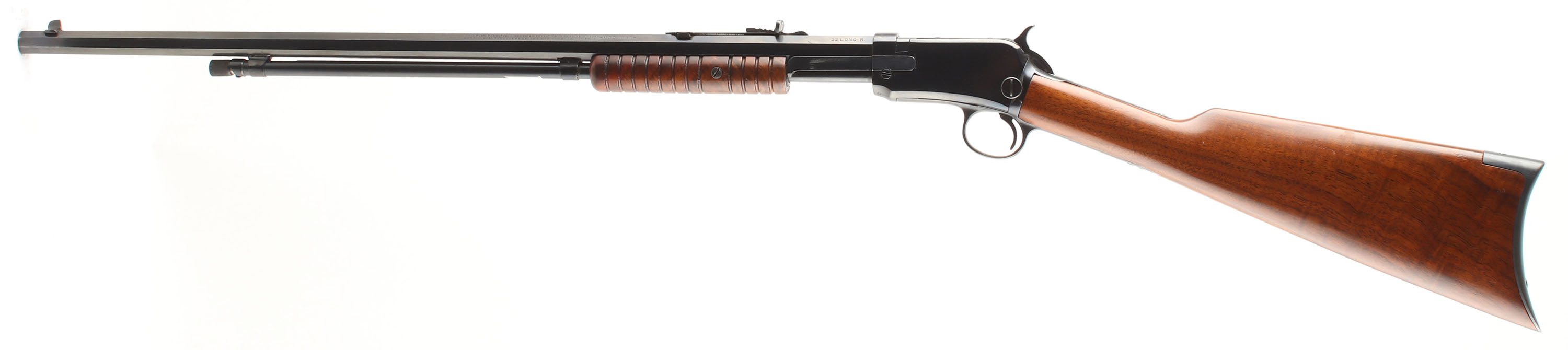 Winchester, Model 90, .22 LONG R. Cal., MFG: 1919 SN: 626385, Slide Action Pump, 24'' Tapered octagon barrel. This Rifle has been fully restored. The L.R, only caliber is the rarest & most desired caliber amongst collectors as only 10% of total production was this caliber. The L.R. caliber was added in the mod 90 line-up in 1919 making this a 1st year rifle with this caliber. The original wood stocks are excellent, as lightly sanded & expertly refinished. There are very few tiny handling marks to the excellent finish. The restored metal blue finish rates 95% overall. Bore is fair, with cleaned roughness & a ring in the thin rifling mid barrel, no bulge. Barrel carries an adjustable rear & blade front sights. Factory crescent steel buttplate. A sharp example of a restored single caliber mod 90. FFL or C&R Req. - Value: 800 to 1200