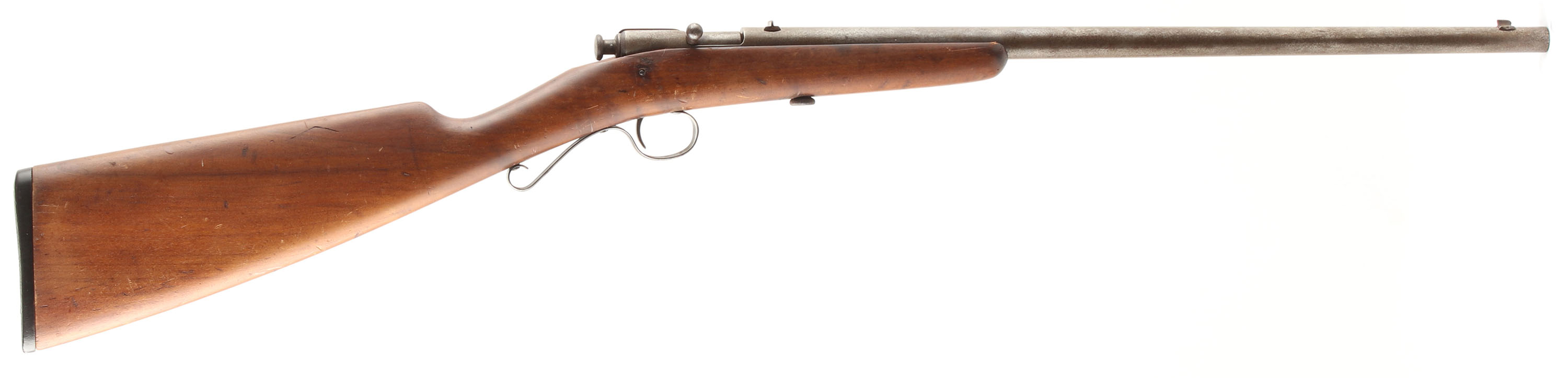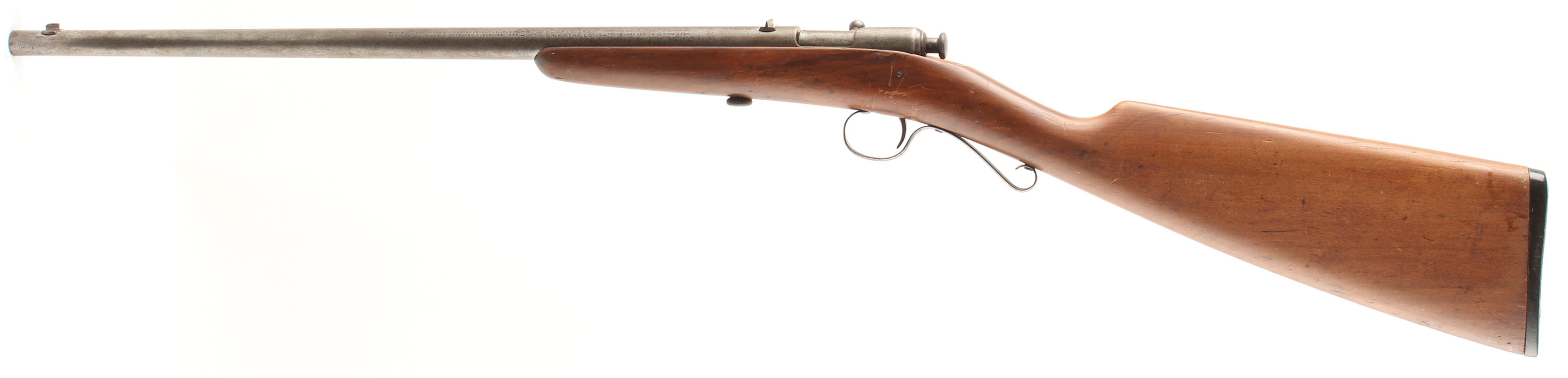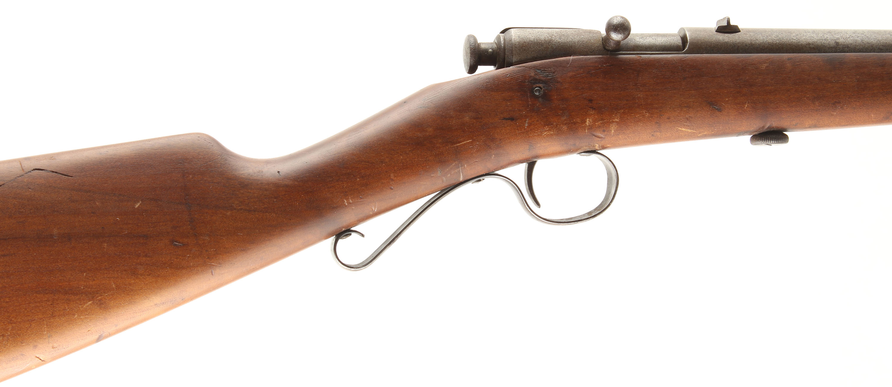 Winchester, Model 1902 (Later Variation), CAL: 22 S. L, & ExL., MFG: 1902-31, SN: NSN, Bolt Action Rifle, 18'' barrel. Later variation with the plastic buttplate & in .22 Short, Long & Ex Long. The original straight grip wood stock is very good, with a couple of glued stress crack to the wood on each side of below the receiver. There are several minor scrapes, scratches & contusions to the very good original finish. The original metal blue finish has worn mostly gun metal gray, with a spotty thin brown patina developing. Bore is fair, with lots of cleaned pitting & scarring amongst visible rifling. The barrel holds a fixed rear & blade front sights. Stock carries a Winchester plastic buttplate, with engraved screws. Serpentine trigger guard. A second variation that presents very well. FFL or C&R Req. - Value: 200 to 400