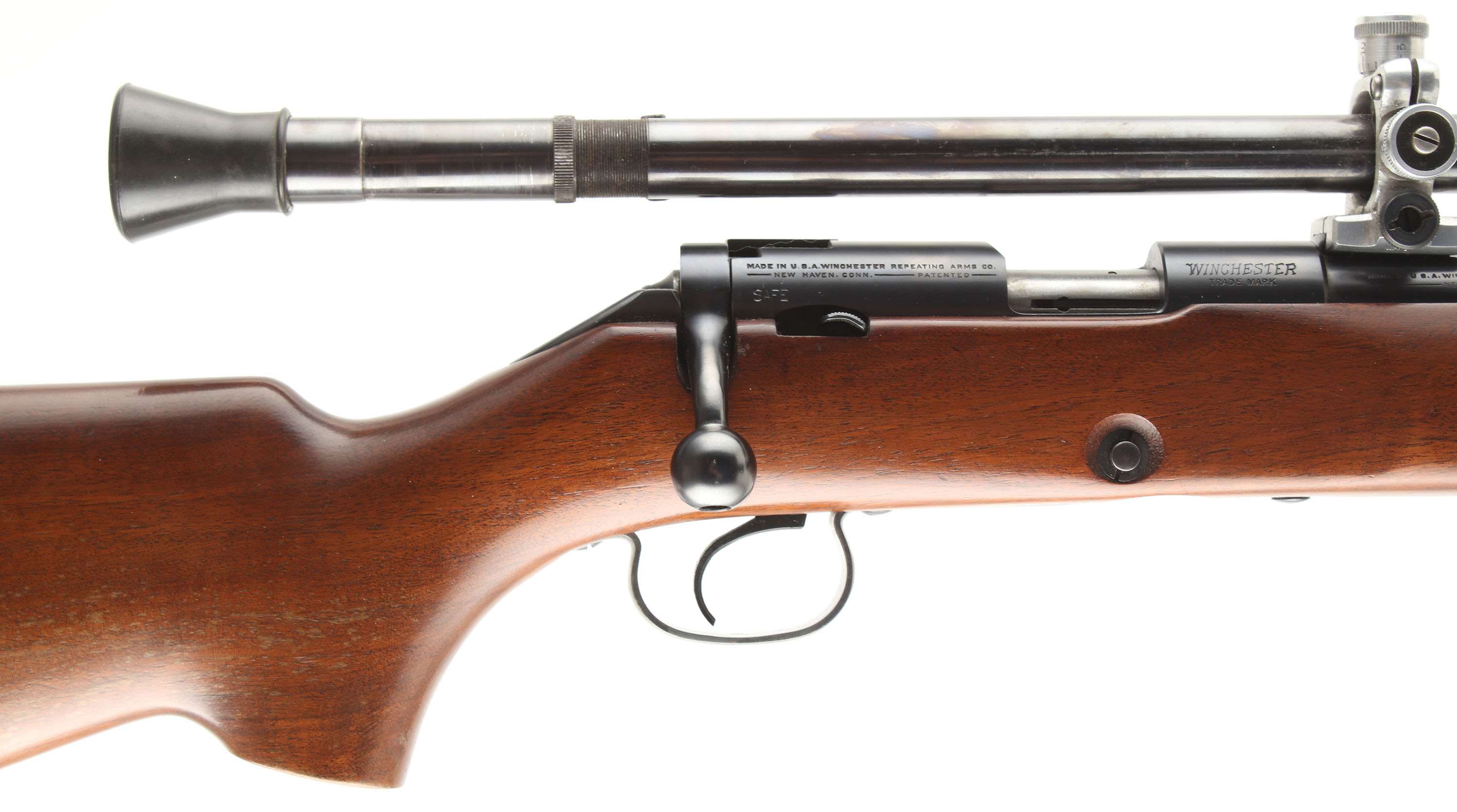 Winchester, Model 52-B Target Rifle, CAL: 22 LR, MFG: 1937, SN: 47612B, Bolt Action Rifle, 28'' Standard Target barrel. The original flat pistol grip & barrel banded forend wood stock is excellent, with light scrapes & scratches to the original finish. There is a bit of small spotty flaking on the right side of the stock. The original metal blue finish rates 95% overall. Bore is excellent. The rifle is fitted with a R.A. Litschert Model A 15 scope. The receiver carries a Lyman 48F sight base, but no adjustable sight piece. The barrel holds the factory scope blocks & a silhouette front sight. Proof stamping on receiver & barrel were correctly stamped to the left side allowing for the factory mounted scope. Buttstock carries a checkered metal buttplate. Sling loop on stock & front barrel band. Missing the detachable mag. An excellent & original condition, scoped 52-B target. FFL or C&R Req. - Value: 1000 to 1800