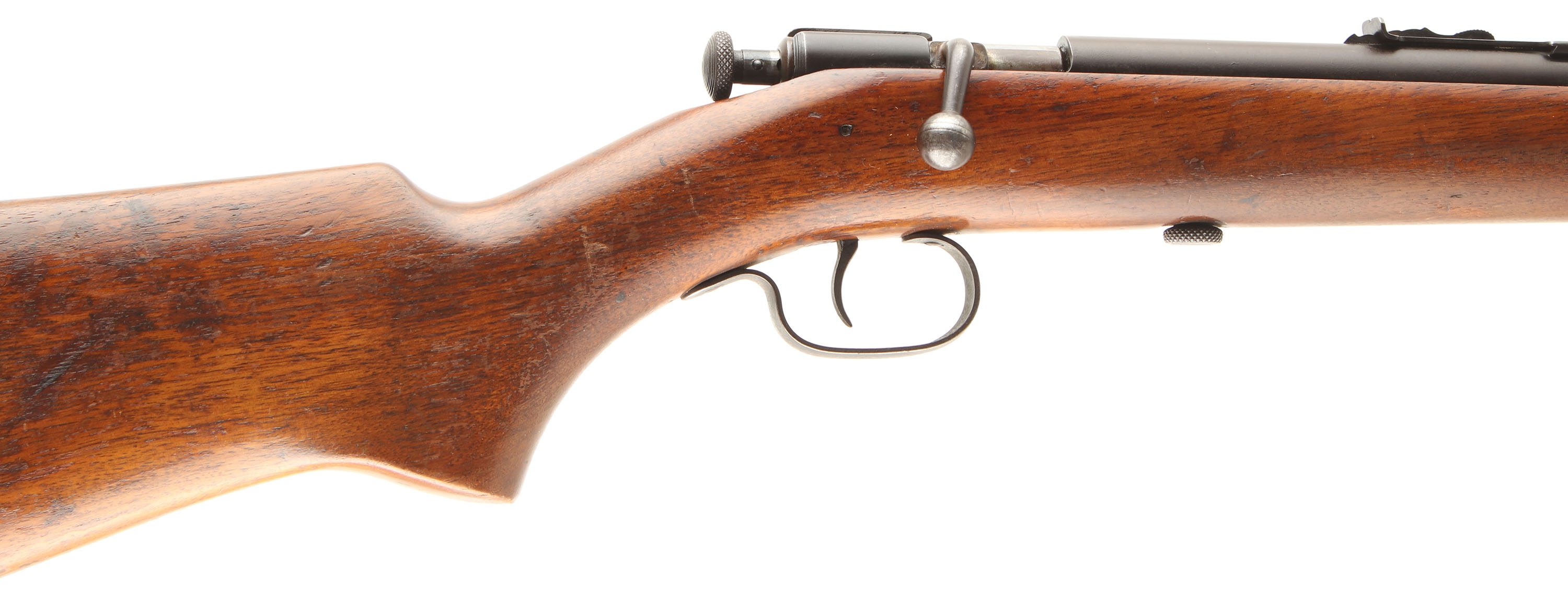 Winchester, Model 60, CAL: .22 S.L & LR., MFG: 1931-34, SN: NONE, Bolt Action Rifle, 23'' barrel. The original flat pistol grip wood stock is very good, with minor handling marks, scrapes & contusions to the worn & flaking original finish. There are two small hole in belly of the stock & two more in the forend tip area , likely from missing sling provisions. The metal finish is a full coverage combination of orginal blue & an aged plum/brown patina. Bore is excellent. The rifle carries the original sights. Buttstock carries hard rubber checkered buttplate. FFL or C&R Req. - Value: 150 to 300