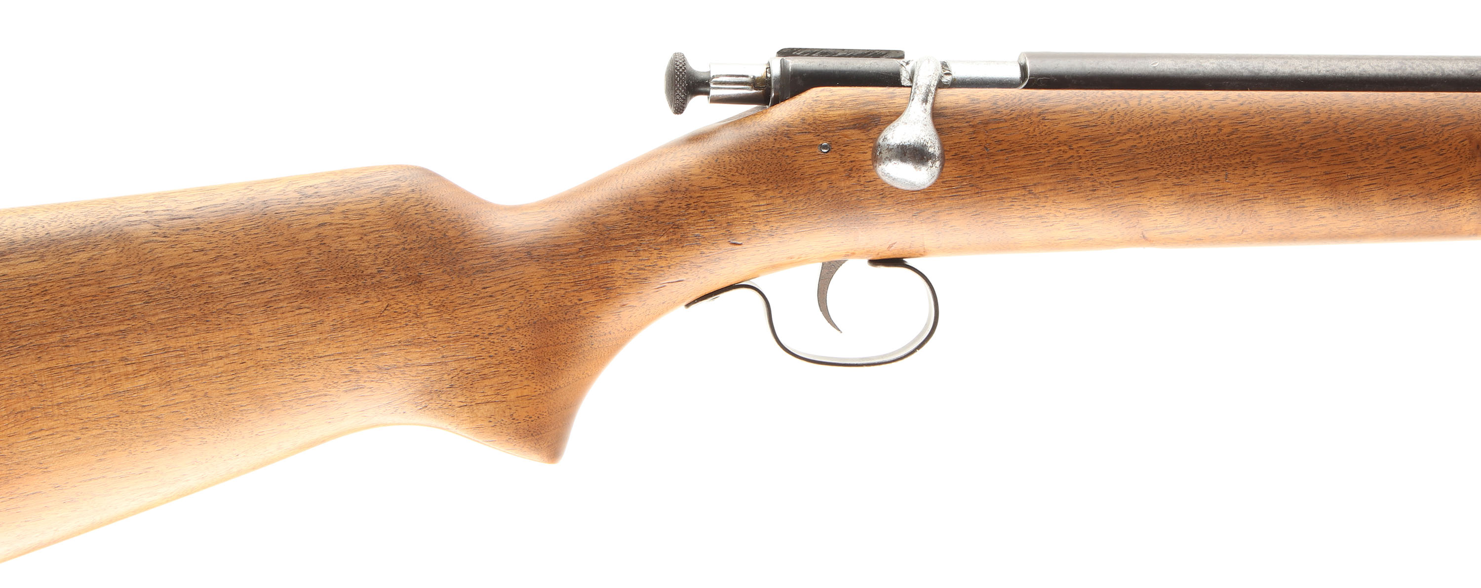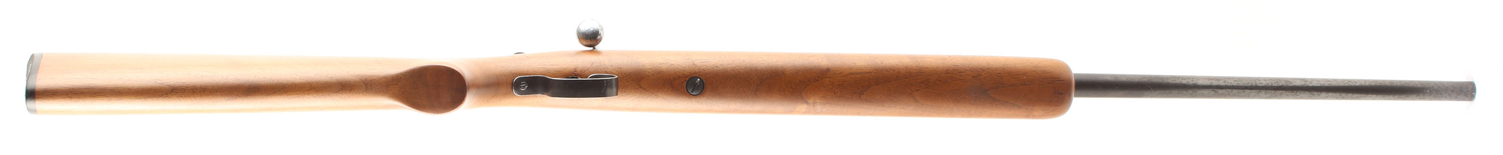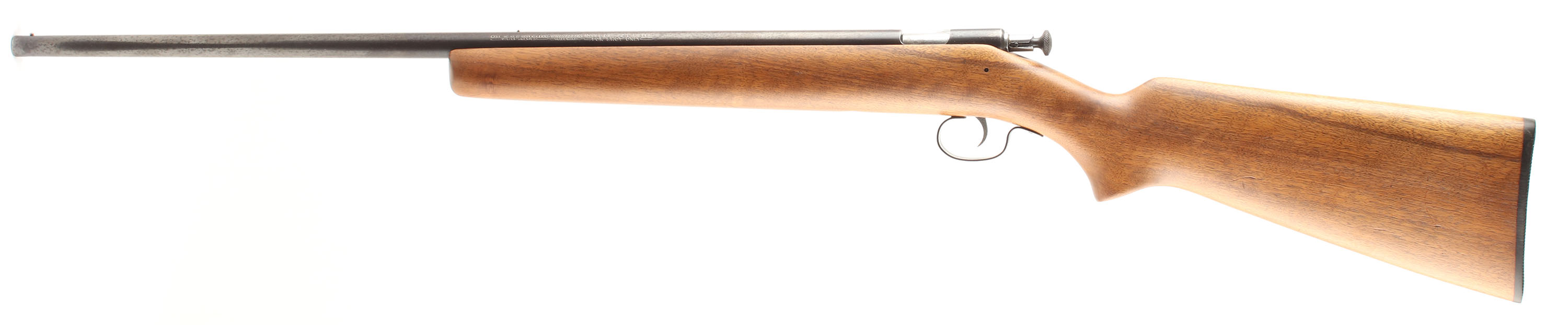RARE Winchester, Model 67 ''Mini Target Bore'' (SMOOTH BORE),Marked .22 L. Rifle FOR SHOT ONLY Cal., MFG. 1934-63, SN: None, Bolt Action Rifle, 24'' Tapered round barrel, This is the rarest version of the model 67 rifles. The factory flat pistol grip wood stock is very good having been very lightly sanded & expertly refinished. There remains tiny light handling marks & contusions to the excellent finish. The factory metal finish has given way to a plum/brown finish rating 70%, with speckling & spotting. The trigger guard has 50% blue. The counter-bored barrel is excellent. The barrel carries a mid & front bead. Winchester plastic buttplate. A sharp looking & rare model 67 rifle. FFL or C&R Req. - Value: 600 to 1000