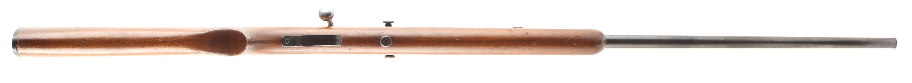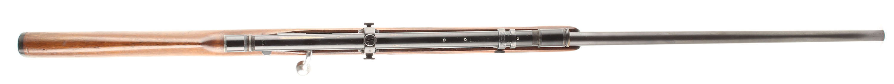 VERY RARE Winchester, Model 677 (Scoped Rifle), .22 S. L. LR. Cal., MFG. 1937-39, SN: None, Bolt Action Rifle, 27'' Tapered barrel. Although the barrel is marked ''67'' it is a rare model 677 rifle, with no factory provisions for open sights. Winchester sold the British Government scoped Models 67, 677, 69 & 697 rifles, to be used as military training rifles. The Model 677 & 697 rifles were in .22 S.L.or LR. Or WRF Cal., with scopes & no provisions for open sights. The Model 67 & 69 stamped rifles were in .22 S.L.LR. Cal. & fitted with the same scopes, but also with open sights. This is one of the rare Model 677 British Government rifles, without open sight provisions & British proofs. Next to the British proofs is the ''NOTBRITISHMAKE'' stamping. It also exhibits the ''N'' stamping on the barrel & Broad Arrow marking on the top of barrel & on the right side of the stock. The original pistol grip & early rare finger grooved forend wood stock is excellent & solid. It displays the majority of the original finish, with minor to small scratches, scuffs & contusions. The metal blue finish on the barrel & receiver is retained at 95% coverage. Finish on trigger guard rates 85% with edge wear toning to a brown patina. Bore is excellent & bright. Rifle is factory fitted with a Winchester scope on Winchester scope rings & blocks. The scope does have minor finish scratches on the tube. Again, the barrel has no sight provisions, which is factory for this model 677. Nickel bolt handle & trigger. The ''Winchester'' marked buttplate is also excellent. Only 2,240 produced. A very rare rifle with collectible optics. Highly sought after & collectible! FFL or C&R Req. - Value: 2000 to 4500