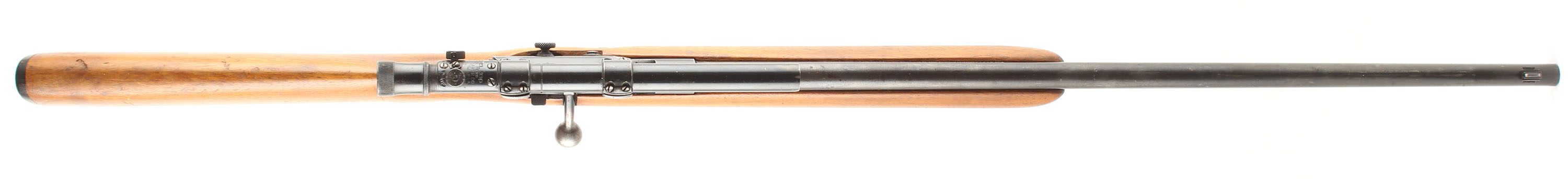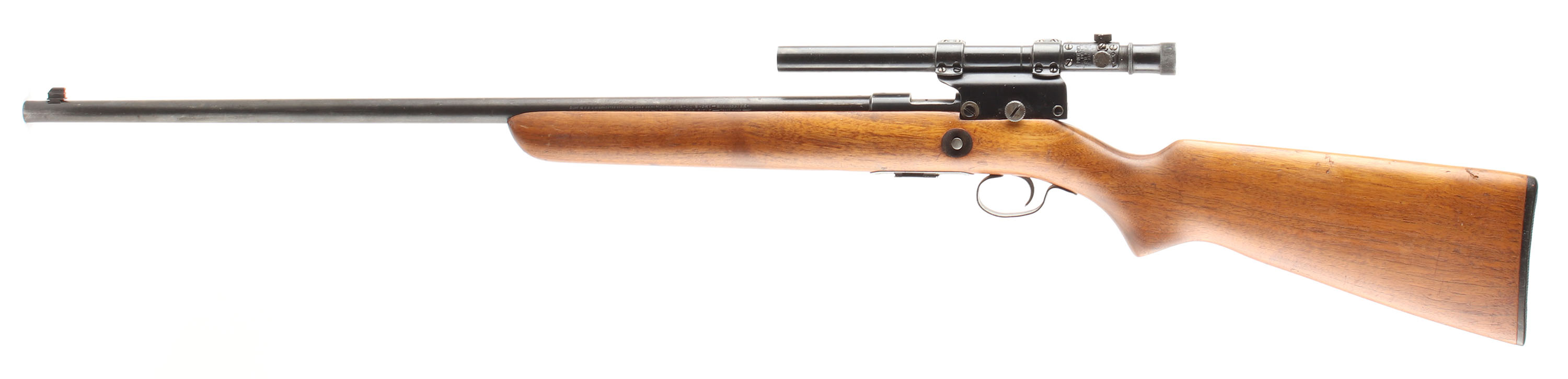 Winchester, Model 69A, CAL: 22 S,L,LR, MFG: 1935-63, SN: NONE, Bolt Action Rifle, 25'' barrel. The flat pistol grip wood stock, with slanted forend tip, is excellent. The original finish is wearing thin & with several minor to small handling marks, scratches & contusions. The metal blue finish rates 80% overall. Bore is excellent. The rifle is fitted with a Weaver Model 330 scope, while the barrel has a replaced blade front sight. Buttstock carries a Winchester marked, checkered black plastic buttplate. Blued bolt handle, trigger & trigger guard. Comes with a ''W'' stamped detachable magazine. FFL or C&R Req. - Value: 250 to 500