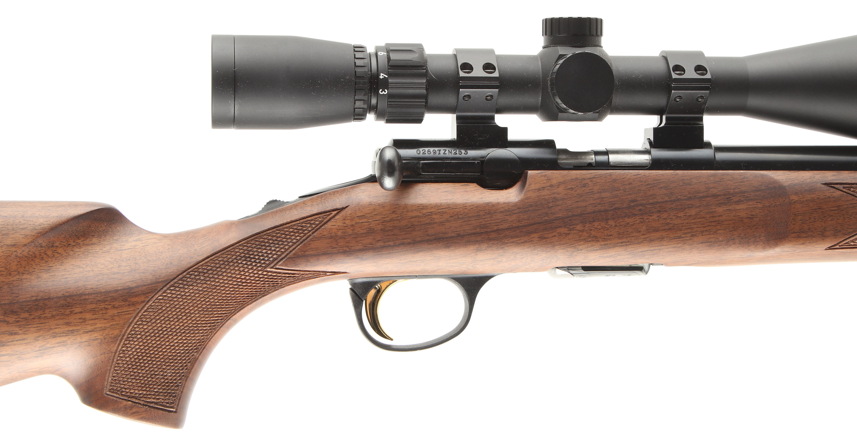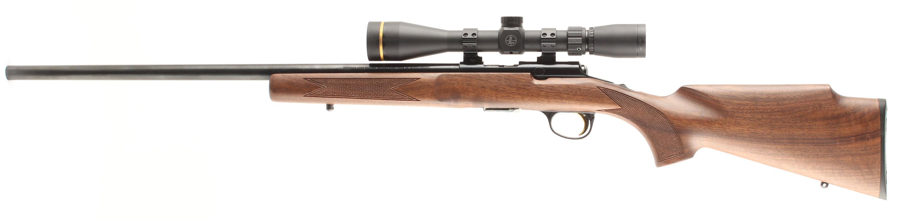 BOXED & NEW Browning, Model T-Bolt, CAL: .17 HMR, MFG: Modern, SN: 02697ZN253, Bolt Action Rifle, 22'' round barrel. The factory checkered & flat pistol grip walnut stock is near mint. The factory metal blue finish is 100%. Mounted with a Leupold VX-Freedom 3-9X40 scope & no open sight provisions. Mint bore. Browning plastic buttplate. Gold Trigger. Sling studs. Comes in the SN matching original box, with lock & paperwork packet. Basically NOS, with added quality scope. FFL Req. - Value: 800 to 1200