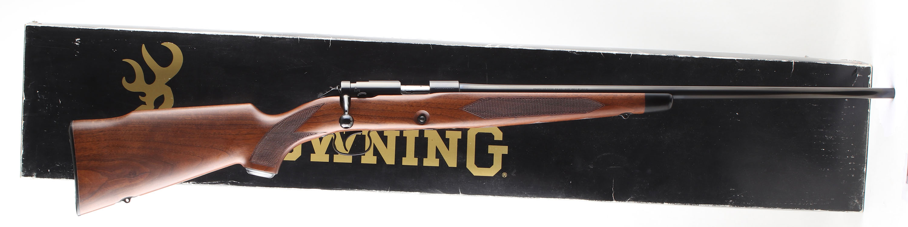 BOXED Browning, Model 52 Sporter, CAL: .22 LR, MFG: 1991, SN: 02819NZ496, Bolt Action Rifle, 24'' round barrel. The factory cheeked, checkered &capped pistol grip Monte Carlo walnut stock is near mint. Ebony forend tip. The factory metal blue finish is 100%. No open sight provisions on barrel. Mint bore. Browning plastic buttplate. Sling provisions. Browning detachable mag. Comes in the SN matching original box, with Browning scope block & paperwork packet. Basically NOS. FFL Req. - Value: 1000 to 1300