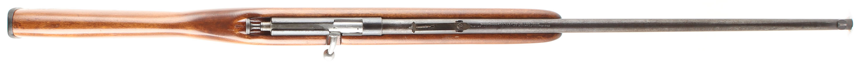 Marlin, Model 100, CAL: 22 S.L.LR, MFG: 1935-50, SN: NONE, Bolt Action Single Shot Rifle, 24'' barrel. The flat pistol grip wood stock is excellent, with several minor to small handling marks or contusions to a mix of original finish, with an added layer of finish. There is some finish scrapes or flaking damage on the left side of the stock. The original metal blue finish rates 70% on receiver, but has worn mostly gun metal gray on the barrel, with a spotty brown patina. The barrel has an adjustable rear & blade front sights. The stock carries a replaced black plastic buttplate, which is oversized & hangs well over at the toe, needs fitting. Silver bolt handle. FFL or C&R Req. - Value: 80 to 150