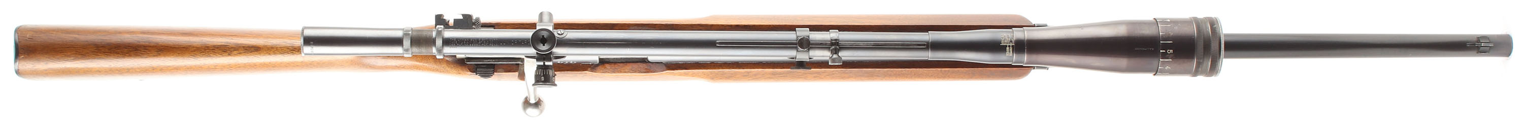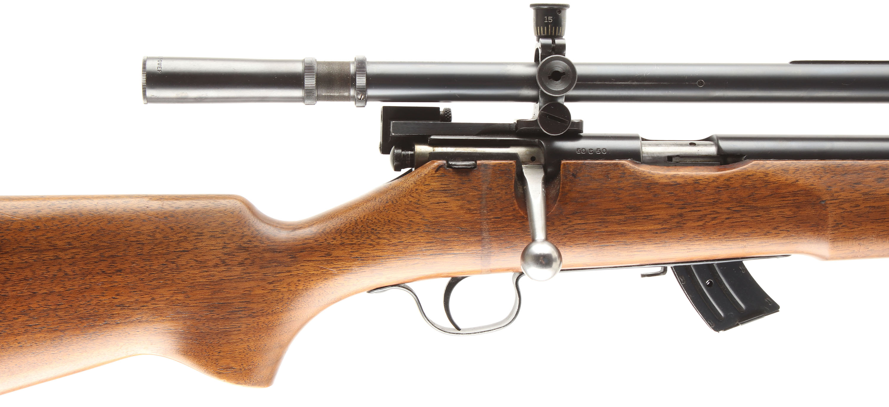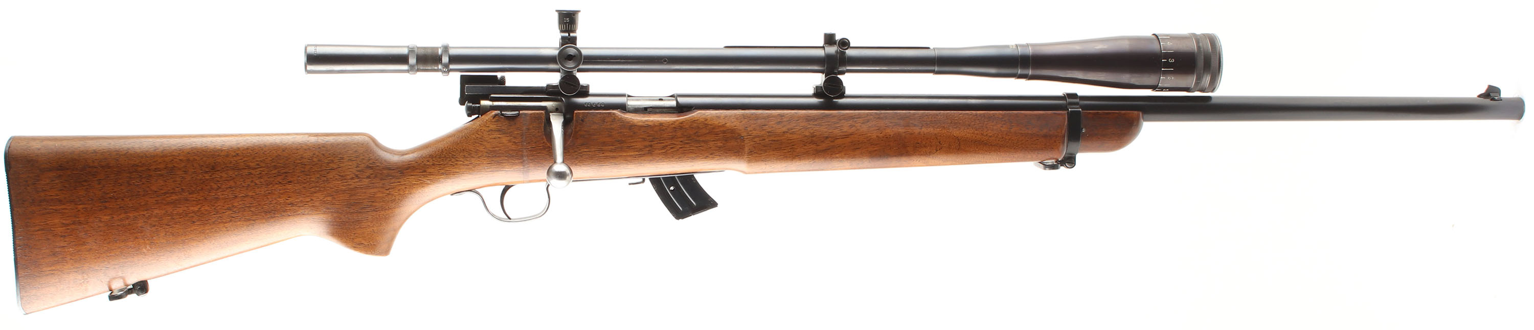 Savage, Model 19 N.R.A., CAL: .22 LR, MFG: 1919-33, SN: 50650, Bolt Action Rifle, 25 1/2'' barrel. This rifle was collaboration between Savage & the NRA to create a high-quality, match-grade rifle for smallbore competitions. The original flat pistol grip wood stock is excellent, with minor scratches & scuffs to the excellent finish. There is an oil run in the finish behind the bolt handle down to the trigger. The original metal blue finish rates 98%. The rifle is fitted with a Lyman Junior Targetspot 8 Power scope, the receiver is fitted with a Lyman receiver sight base, without the sight, & the barrel carries a blade front sight. Bore is excellent. Buttstock carries a grooved metal buttplate. Sling loops in stock & on front barrel band. Detachable mag. Excellent Overall. FFL or C&R Req. - Value: 300 to 600