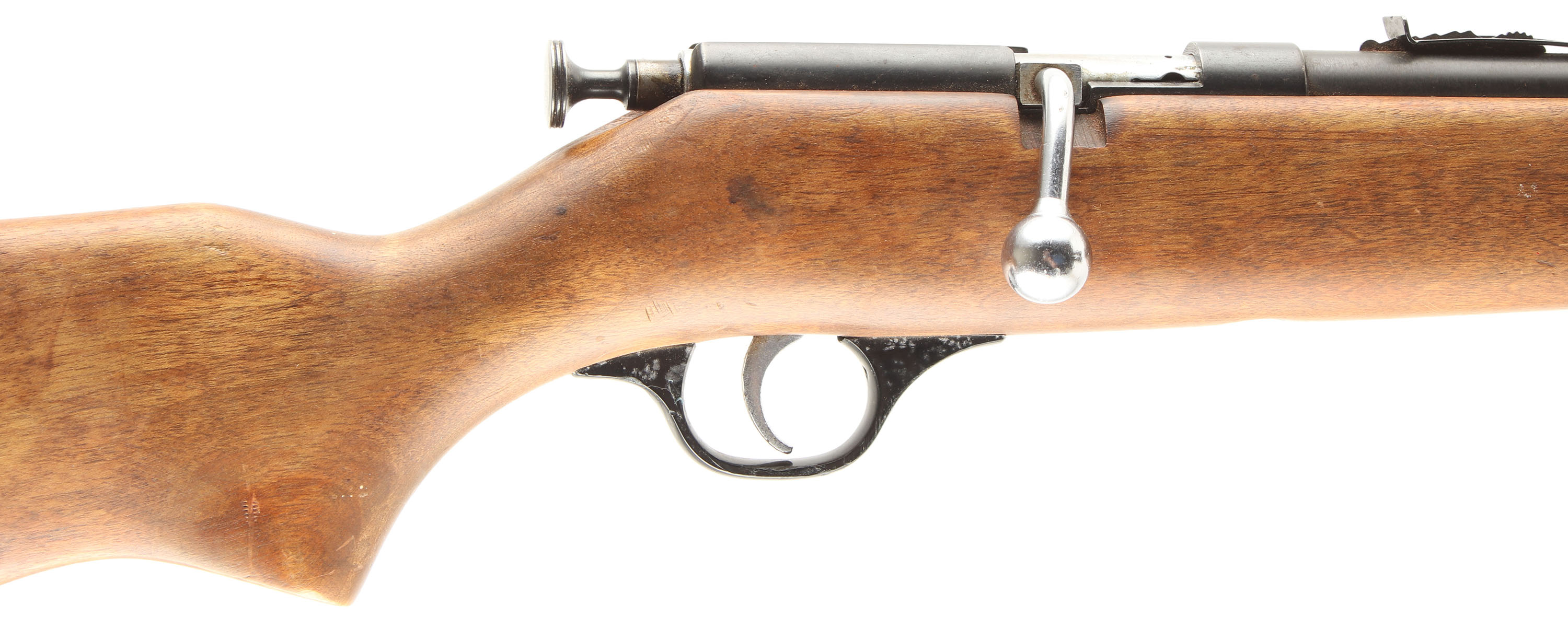 J.C. Higgins (Sears), Model 103.18 (Single shot version of Marlin 80), Marked .22 S, L, LR Cal., MFG. 1946-62, SN: None, Bolt Action Rifle, 24'' round barrel. The original flat pistol grip wood stock is excellent & solid, however most of the original finish has worn or been stripped away. There remains several minor scrapes, scratches & contusions. The original metal blue finish rates 85% overall. The bore is excellent & bright. The barrel carries an adjustable rear & front blade sights. The stock carries the original plastic buttplate. Nickeled bolt, bolt handle & trigger. FFL or C&R Req. - Value: 150 to 250