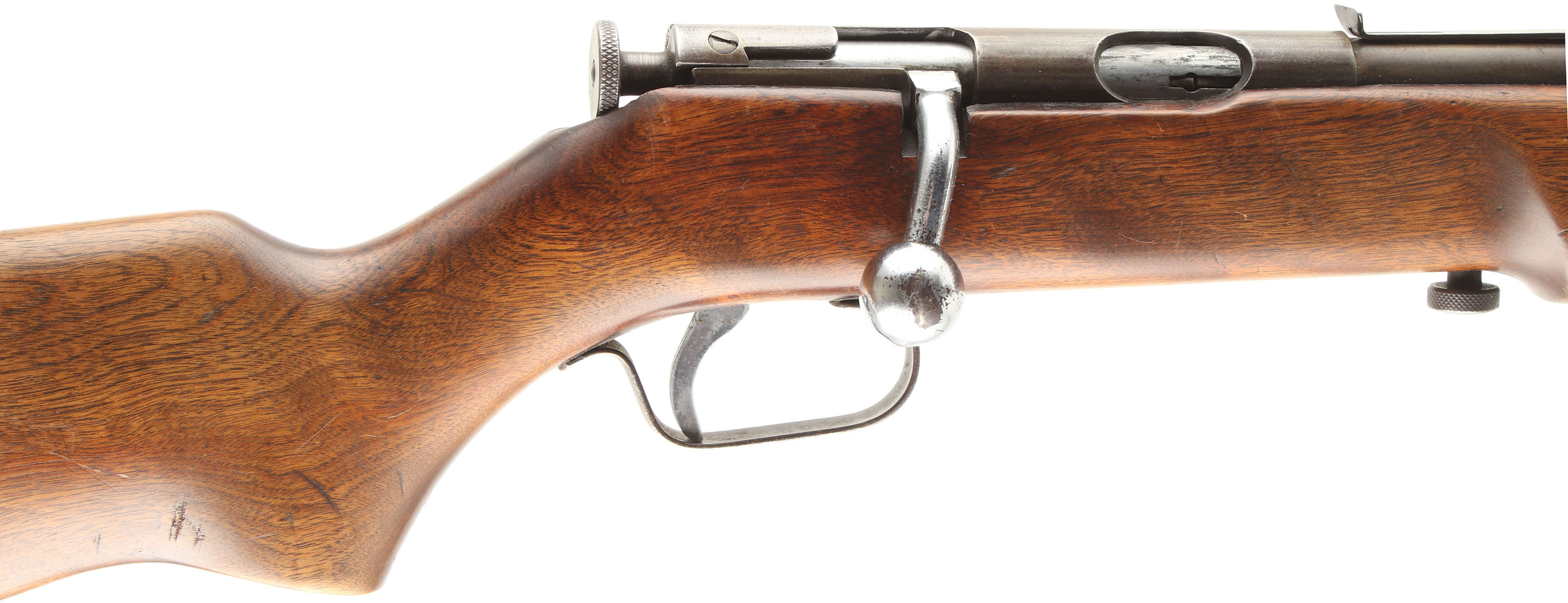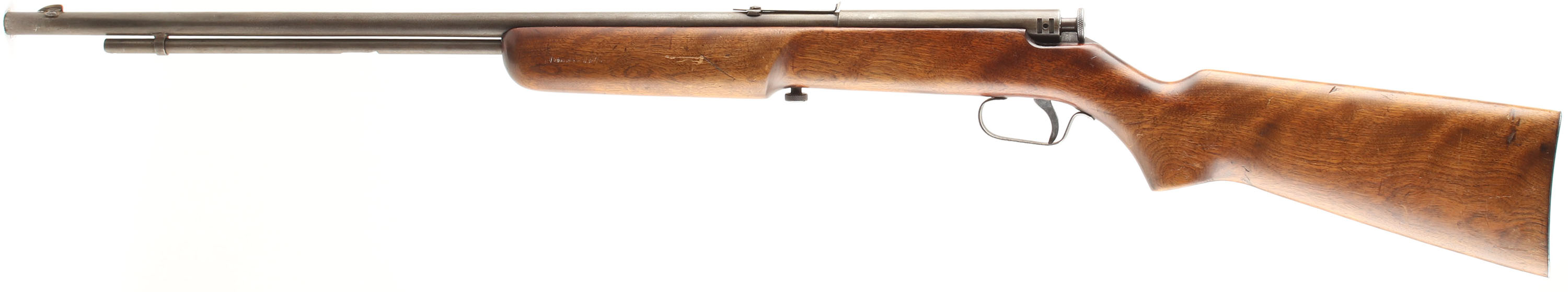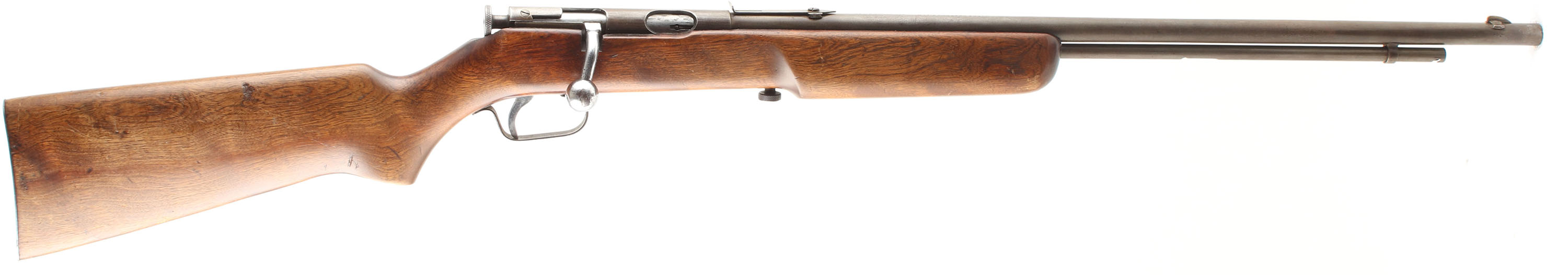Ward's Western Field, Model 40, S, L, LR Cal., MFG. 1920's, SN: None, Bolt Action Rifle, 24'' round barrel. The factory flat pistol grip wood stock is very good, with numerous minor handling marks, scratches or contusions to the original finish. The metal finish has fully worn gun metal gray. Bore is excellent, The barrel carries an adjustable rear sight, missing the elevator, & a blade front sight. Smooth metal buttplate. The bolt slides out of receiver without engaging the action & the rifle is missing the mag tube plunger. The rifle needs additional parts to function properly. The rifle is therefore being sold ''AS-IS'', as a parts gun, with NO RETURNS. FFL or C&R Req. - Value: 20 to 80