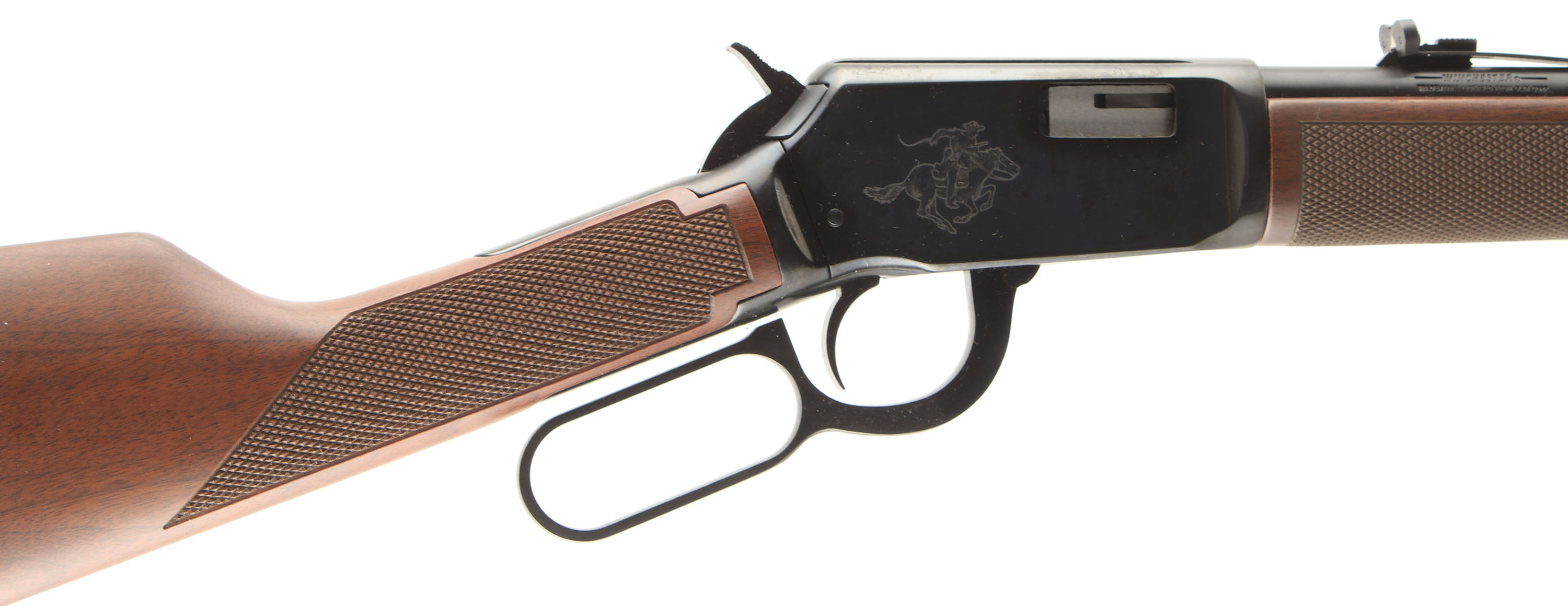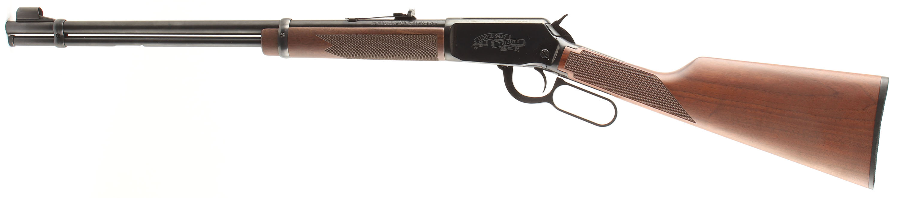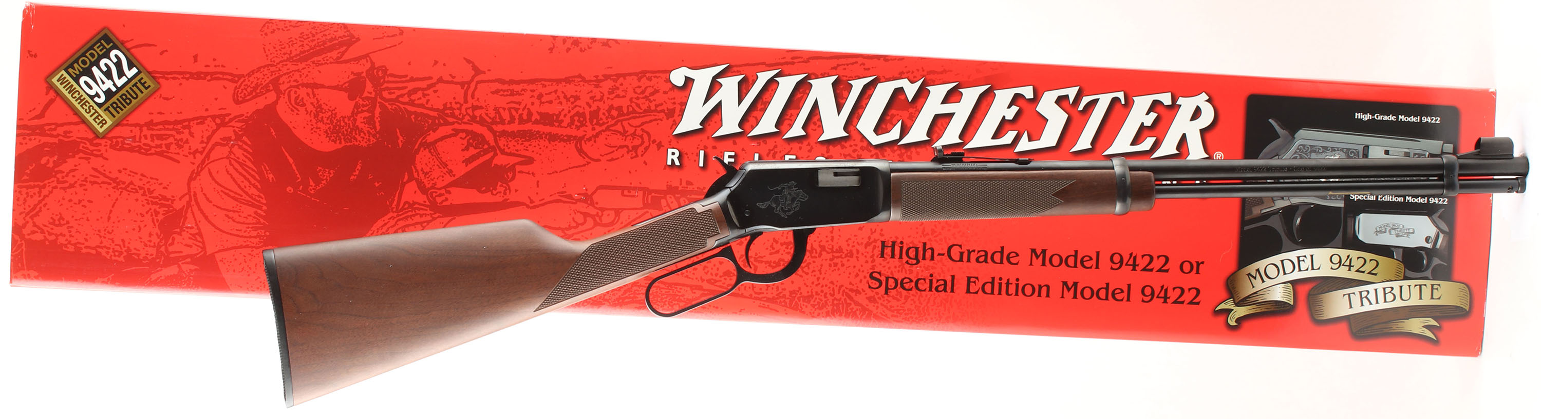 BOXED Winchester Model 9422 ''TRIBUTE'', CAL: 22 S.L.LR, MFG: 2005, SN: FTS2864, Lever Action Rifle, 20'' barrel. Grooved receiver. The Winchester 9422 Tribute rifle was a special run of 9,422 rifles produced in 2005 to commemorate the end of the Winchester 9422's production run. The Model 9422 was manufactured from 1972 to 2005. The original checkered, straight grip wood stocks are excellent, displaying factory finish & virtually no handling marks. The original metal blue finish rates 100% overall. Receiver is engraved ''Model 9422 Tribute'' on the left, with the Winchester horse & rider on the right. Barrel holds an adjustable rear elevator sight & large hood front sight. Bore is excellent. Buttstock carries a factory Winchester, checkered, black plastic buttplate. Comes in the original SN matching box, with outer sleave & original outer shipping box, with the original hanging tag & paperwork. Basically NOS & an overall excellent limited production rifle. FFL Req. - Value: 1200 to 1500