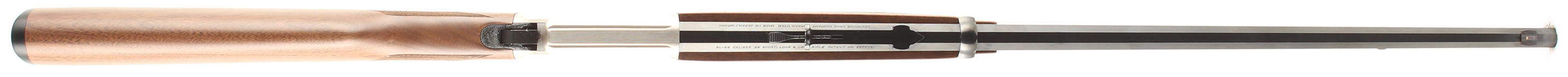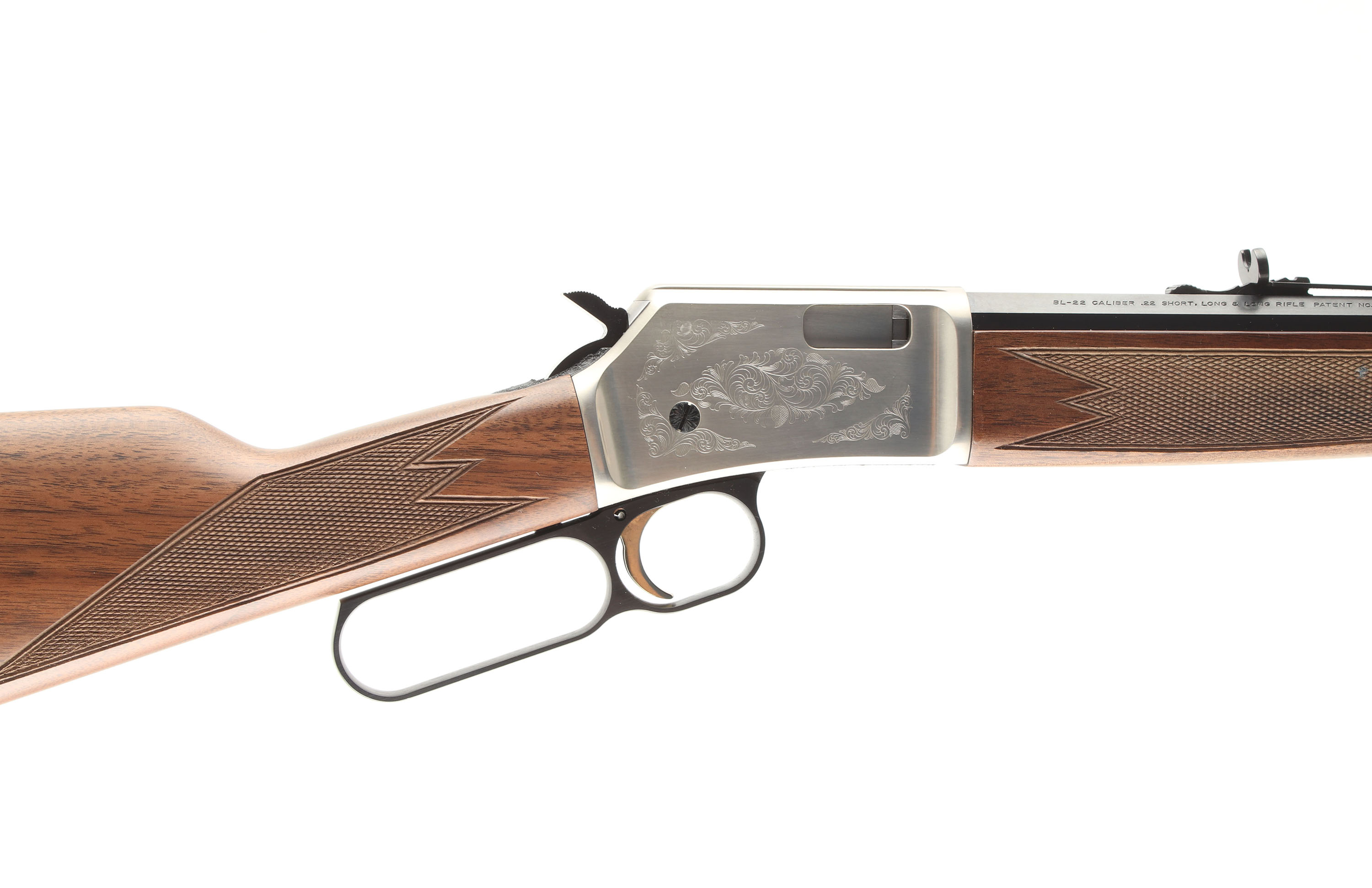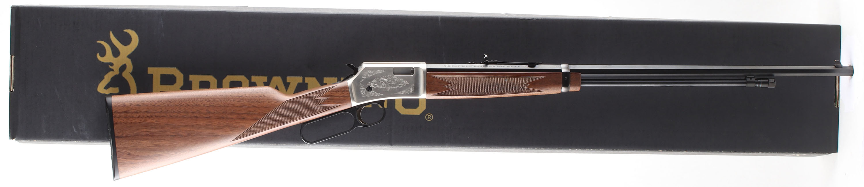 BOXED Browning, Model BL-22, GRADE II, CAL: .22 S.L.LR., MFG: Modern, SN: BRJP02870, Lever Action Rifle, 24'' Octagon barrel. 3/4 Mag. The original deluxe checkered, straight grip walnut stocks are minty. The original metal blue finish rates 100% overall. The silver receiver displays scroll engraving. Bore is excellent. The barrel carries factory folding rear & blade front sights. Buttstock carries a Browning plastic buttplate. Gold trigger. Comes in the original SN matching box, with paperwork & lock. Basically NOS. FFL Req. - Value: 1200 to 1400