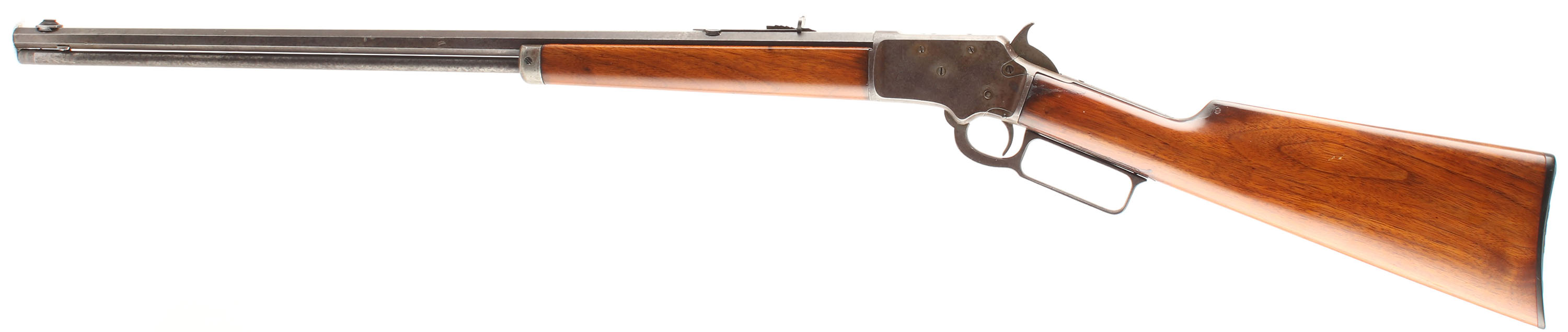 Marlin, Model 97, .22 S. L. LR Cal., MFG. 1910, SN: 411804, Lever Action Rifle, 24'' Octagon barrel, The original wood stocks are very good, as having been sanded & nicely refinished. There are several minor contusions, scraps & scuffs to the very nice high gloss finish. The metal sits proud to the wood along the edges of the tangs & receiver. The metal on the barrel & tube has worn mostly gun metal gray, with a thin spotty brown patina. The case-hardened receiver & lever has also faded to gun metal gray, with a thin brown patina, Bore is very good. The barrel carries an adjustable rear & low profile blade front sights. The stock carries a Marlin checkered plastic buttplate. Tight smooth action. FFL or C&R Req. - Value: 400 to 800