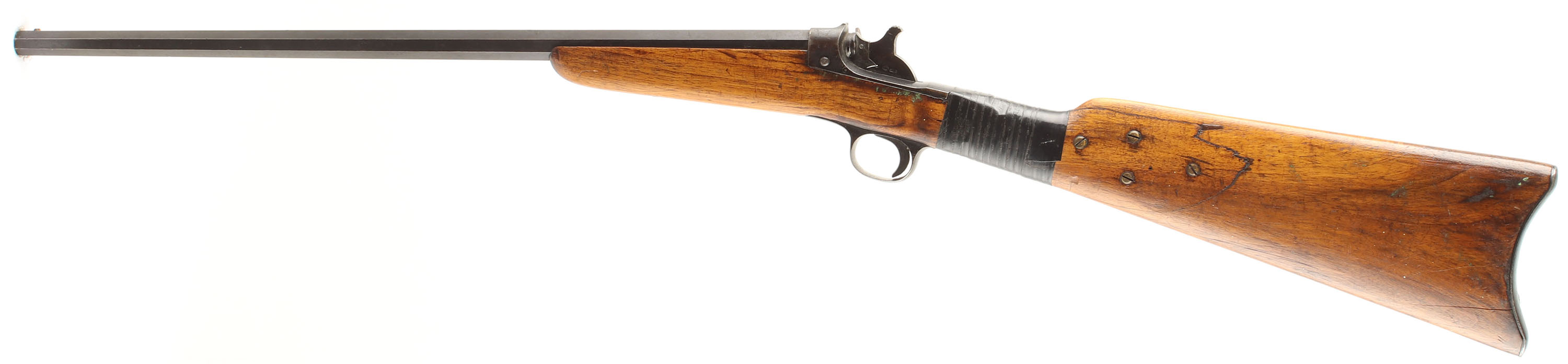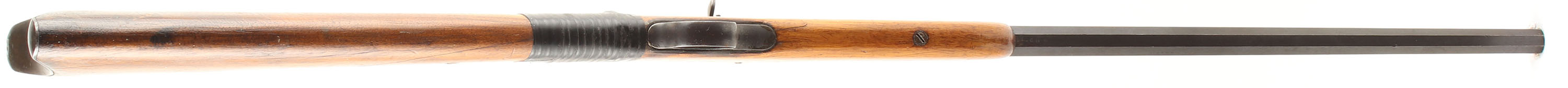 H. Pieper, Rolling Block, Cal: .22 Long, MFG: 1894-98, S/N: None, Single Shot Rifle, 19 7/8'' barrel. The wood stock is fair & feels solid, after having been broken at the wrist & repaired with brass screws & a thick tape wrap. There is a 2'' crack on each side of the toe of the stock. There are numerous scuffs, scrapes, scratches & contusions to the wood, with an added layer of finish. The metal blue finish has toned to a mix of original blue & chocolate patina with nearly full coverage. The bore is fair to poor, with lots of cleaned roughness & pitting, amongst very thin rifling. The barrel holds a single smashed brass front bead, while the rear sight notch is integral to the top of the frame. The stock carries a smooth crescent metal buttplate. Antique, No FFL Req. - Value: 50 to 150