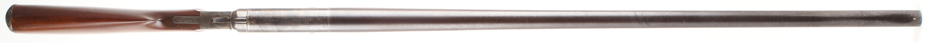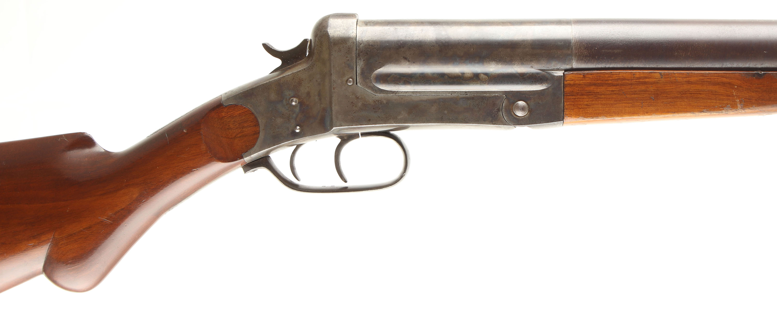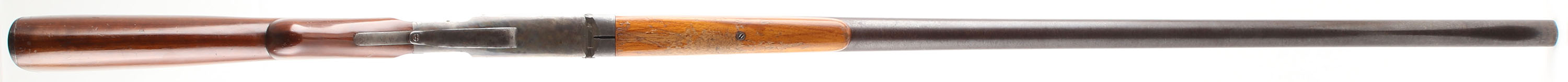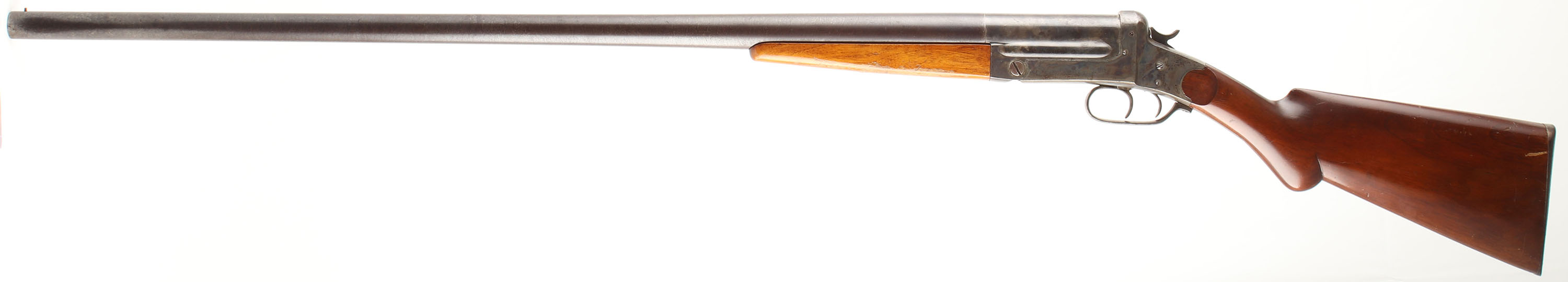 C.S Shattuck, Model ''American'', CAL: 8GA, MFG: 1880-1908, SN: 99, Break Action Single Shot Shotgun, 40'' barrel. The round knob stock & forend appear to be replacements. They are very good, with minor contusions & surface scrapes. The finish on the forend is flaking. The London Twist barrel has fully toned to a brown patina. The frame & barrel end is case-hardened, retaining visible, but faint case-colors, with some intermittent spotting. Bore is excellent. The barrel holds a single front post sight. The front trigger breaks the barrel & the rear trigger fires the gun. Stock carries a smooth metal buttplate. A nice example of a turn-of-the-century large bore shotgun. Notice: London Twist barrels are not safe to shoot smokeless powder or steel shot out of. FFL or C&R Req. - Value: 1000 to 2200