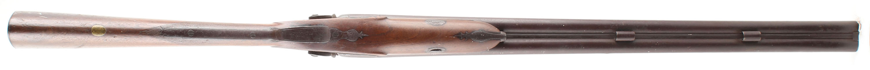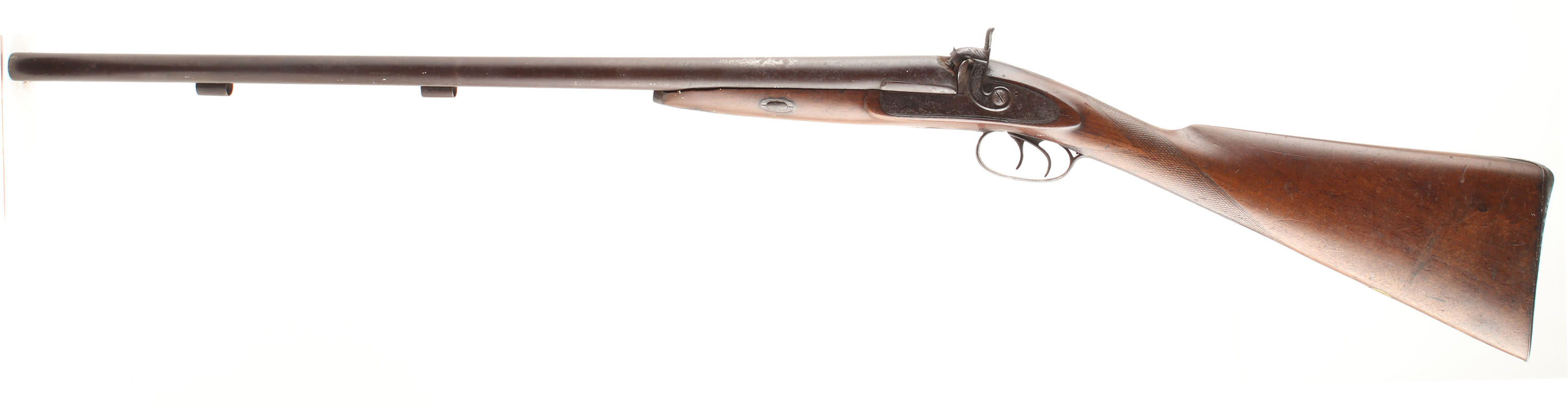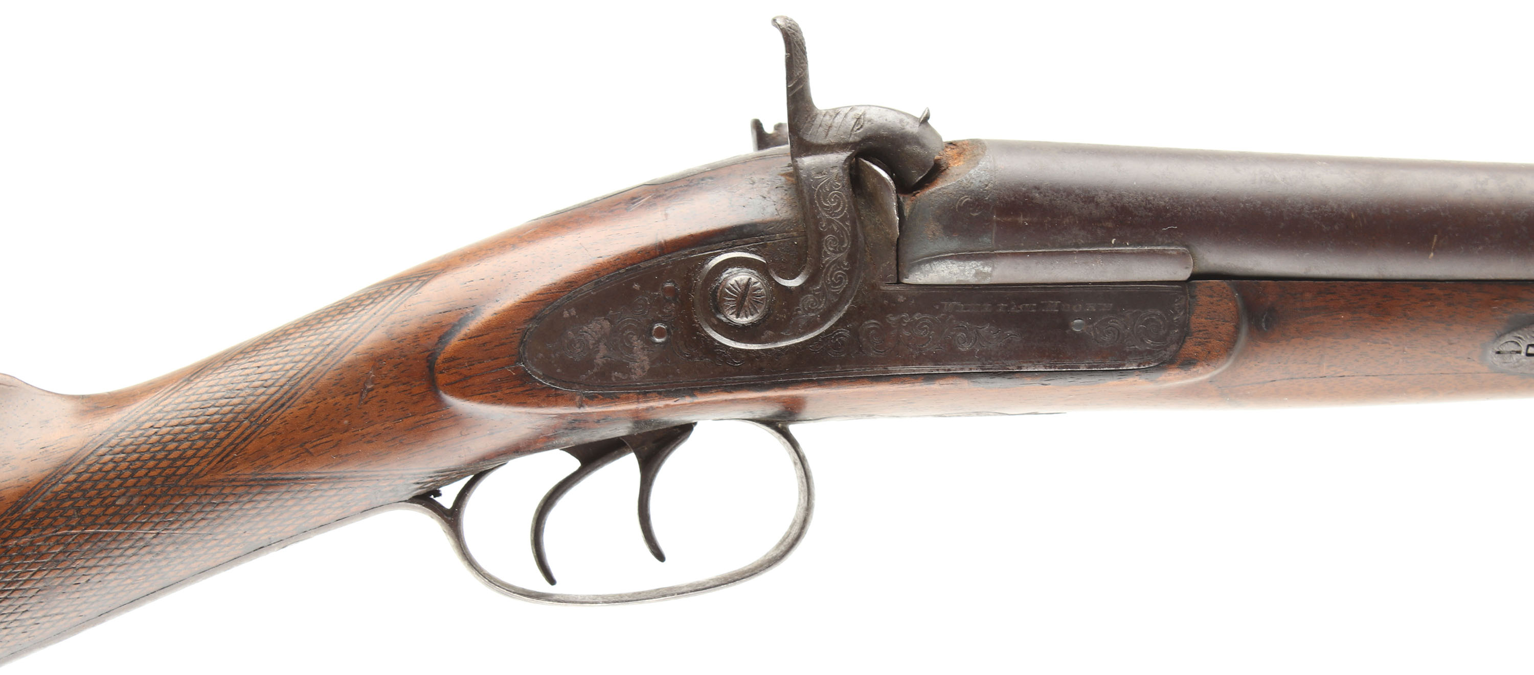 William Moore, Muzzleloader Shotgun, CAL: .78 bore, MFG: N/A, SN: N/A, Percussion Muzzleloader, 28'' barrels. The makers name is marked on both side plates & the rib is marked ''LONDON FINE TWIST''. The original checkered straight grip wood stock is very good & solid. There are a couple hairline cracks coming off the side plates, along with minor contusions, scrapes & dings. There is some darkening to the wood on the right side, cause is unknown. The barrels, receiver, side plates & hammers have all fully toned to a rich brown patina, with consistent rust spotting/speckling throughout. Bores are poor, dark & rough. The solid rib holds a front bead. Stock has a smooth metal buttplate with standing rust. Missing ramrod. The left hammer spur is broken & there is a bulge half way down the left barrel. We recommend this firearm be inspected by a licensed gunsmith before use. SOLD AS IS NO RETURNS. Blackpowder, No FFL Req. - Value: 100 to 300