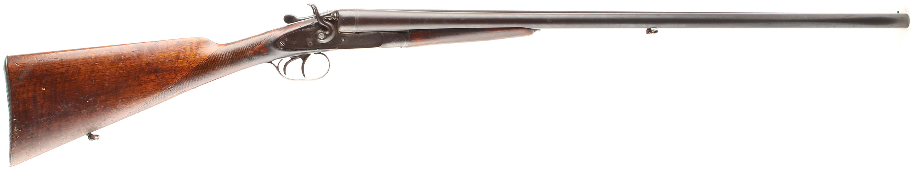 Fuile Rinforzato Hammer Double CAL; 12GA, MFG: N/A, SN: 95679, Break Action SxS, Choke: Full/Full, 27 1/2'' barrel. The side plates are marked with the makers name, the bottom of the receiver is marked ''MONOBLO BERETTA/BRESCIA'' & the barrel is marked ''P.BERETTA GARDONE V.T BRESCIA''. The original checkered straight grip stocks are very good & solid, having been sanded & refinished. There are numerous contusions, dings, scratches & scrapes throughout. The blued finish on the barrels has full toned to smooth brown patina. The nickeled receiver & side plates have remnants of nickel finish in heavily protected areas, but mostly worn to metal gray & toned to a brown patina. Bores are poor, bright, but heavily pitted. The Solid matted rib holds a front bead. Stock has a Beretta grooved metal buttplate. Sling loops. Double triggers. FFL or C&R Req. - Value: 200 to 400