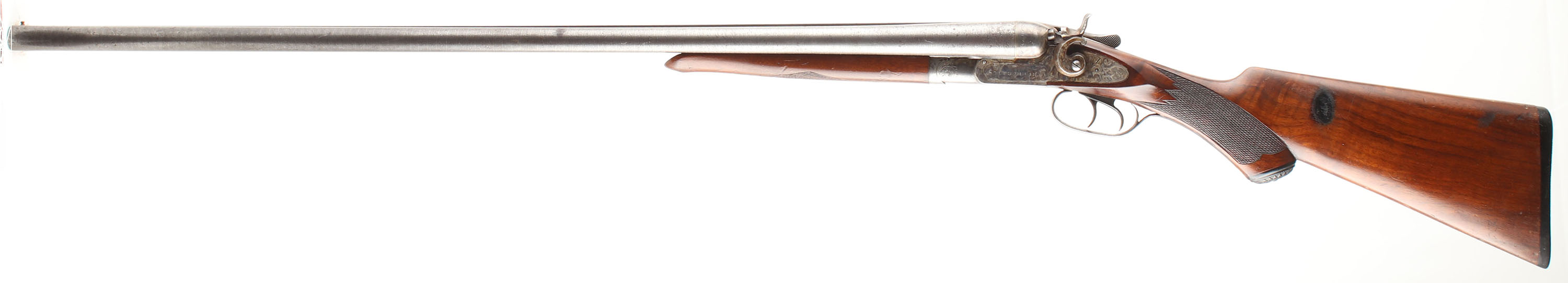 Meriden Firearms Co., ''D'' Grade, CAL: 12GA, MFG: 1905-18, SN: 23883, Break Action SxS Shotgun, 32'' barrels. The barrel rib is marked ''MFG BY THE MERIDEN FIREARMS CO MERIDEN CT PAT'D JULY 9 1907''. Both side plates are marked ''THE MERIDEN FIREARMS CO''. The water table is marked with the grade, barrel length & serial number. The frame, side plates, hammers, break lever & trigger guard all display simple floral scroll hand engraving, with bird vignettes at the tail of both side plates. The original checkered & capped pistol grips stocks are good & solid. The right side of the wrist has a repaired break, a crack & edge chip repair below the right hammer. There is a burn mark on the left side of the stock, alongside other contusions, scrapes & dings. The Damascus fingerprint pattern on the barrels is excellent, with thinning at the handling points & intermittent spotting toned to a brown patina. The case-hardened frame retains excellent case-colors, with handling points thinning to metal gray. Bores are very good & bright, with visible light wear. Solid matted rib holds a single front bead. Grooved plastic buttplate. Double triggers. Mechanical operation appears to function properly. FFL or C&R Req. - Value: 600 to 1200
