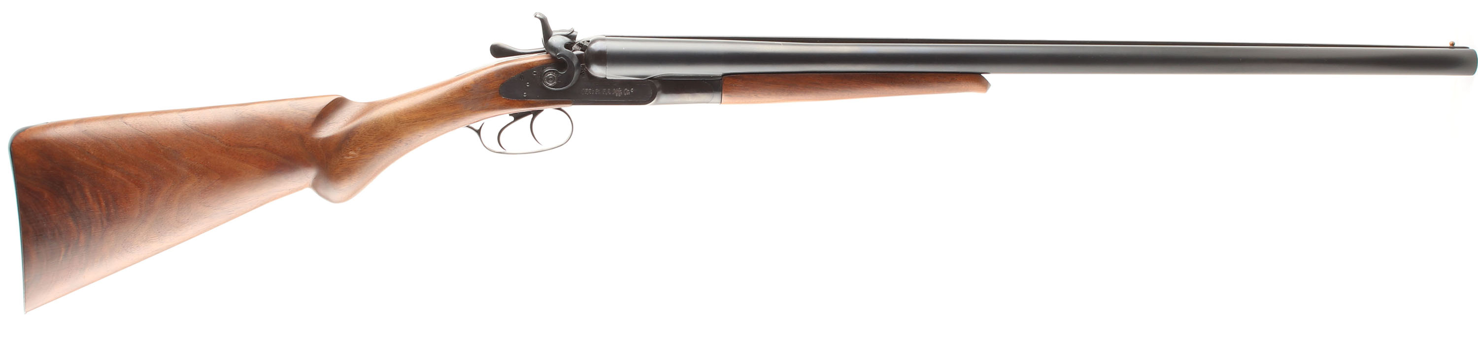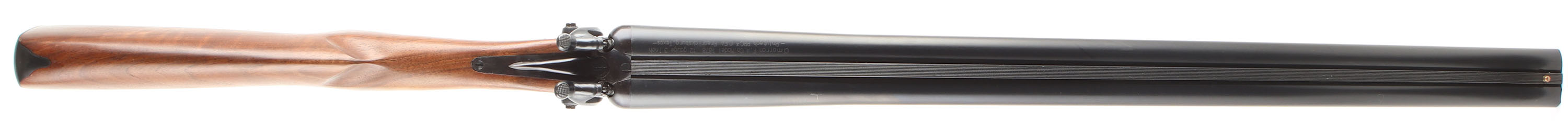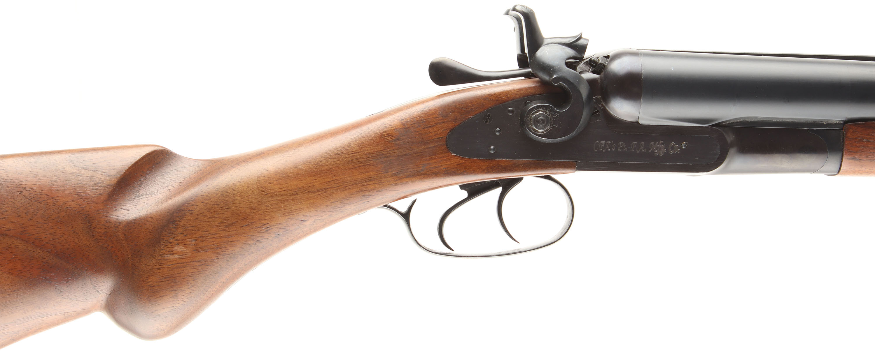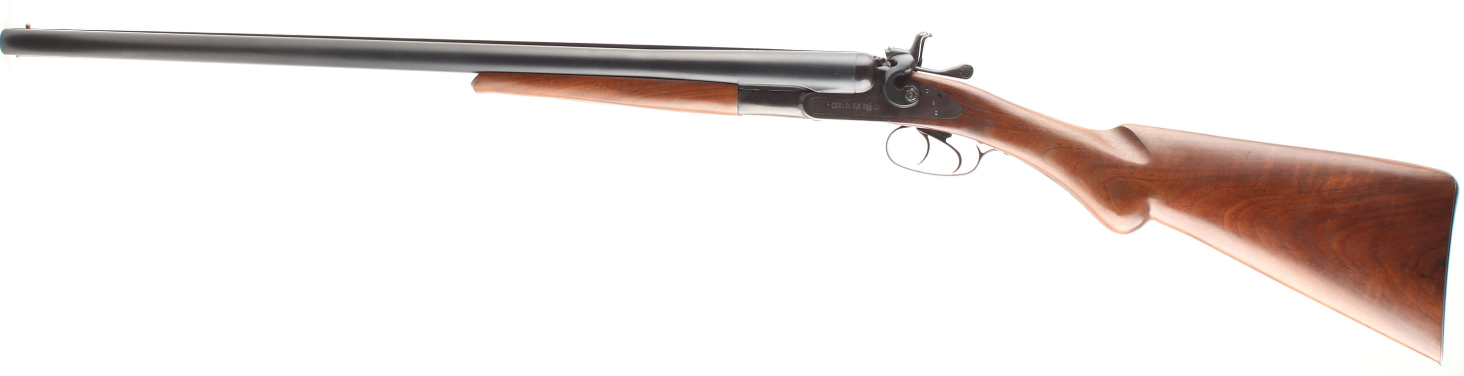 CFA's Pt. F.A. Mfg. Co. (Cimarron), Model 1878, CAL: 12GA, MFG: Modern, SN: P-07410, Break Action SxS, Choke: Cyl/Cyl, 3'' Chamber, 36'' barrels. Factory markings on the barrel & sides of receiver. The original round knob wood stocks are excellent. There are only minor handling/storage marks to the finish. The factory blued finish rates 99% overall. Bores are excellent. The grooved rib holds a brass bead. Stock has a smooth metal buttplate. Double triggers. Consignor states unfired outside factory. FFL Req. - Value: 600 to 800