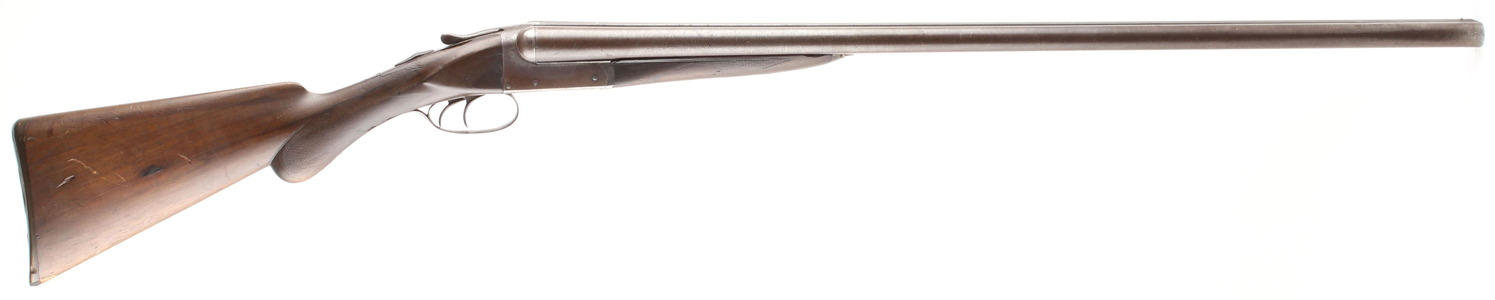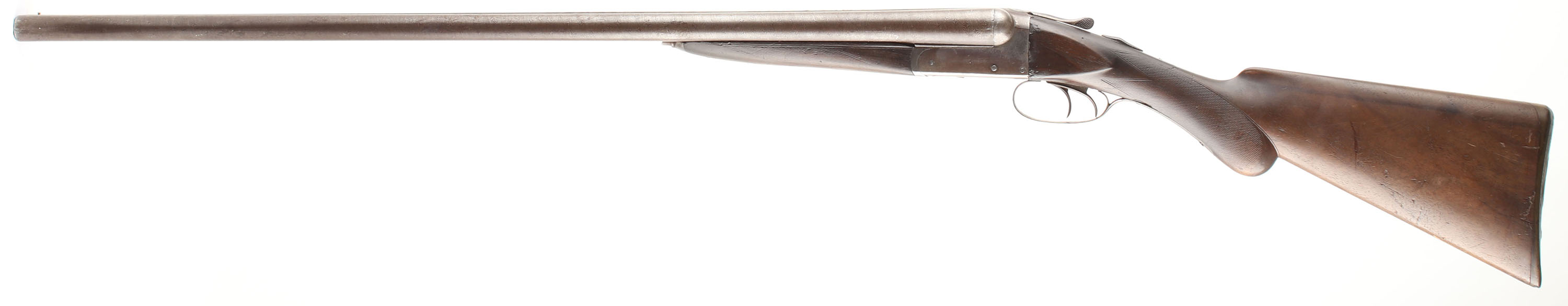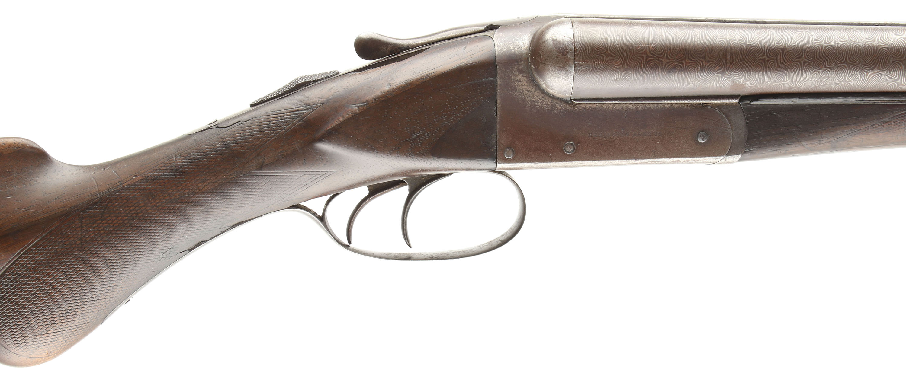 Remington, Model 1894 A Grade, CAL: 12 GA, MFG: 1894-95, Antique, SN: 102935, Break Action SxS Shotgun, 30'' Damascus barrels. The original checkered round knob wood stocks are good & solid. There are multiple small cracks & edge chips, alongside contusions, dings, gouges & scrapes. The original finish has had protective oils added over time contributing to darkening. The fingerprint Damascus pattern on the barrels is prominent, fully toned to a chocolate brown patina, with consistent rust spotting & speckling. The original nickeled receiver has mostly worn to a brown patina, with remnants of nickel remaining in heavily protected areas. Bores are good, with roughness & intermittent pitting. The solid, matted rib holds a front bead. Stock carries a worn RA checkered buttplate. Double triggers. Front trigger doesn't function. The bottom rear collar of the forend hits the bottom receiver plate which makes an audible click when opening. This shotgun needs to be inspected by a licensed gunsmith before use. SOLD AS IS NO RETURNS. Antique, No FFL Req. - Value: 200 to 400