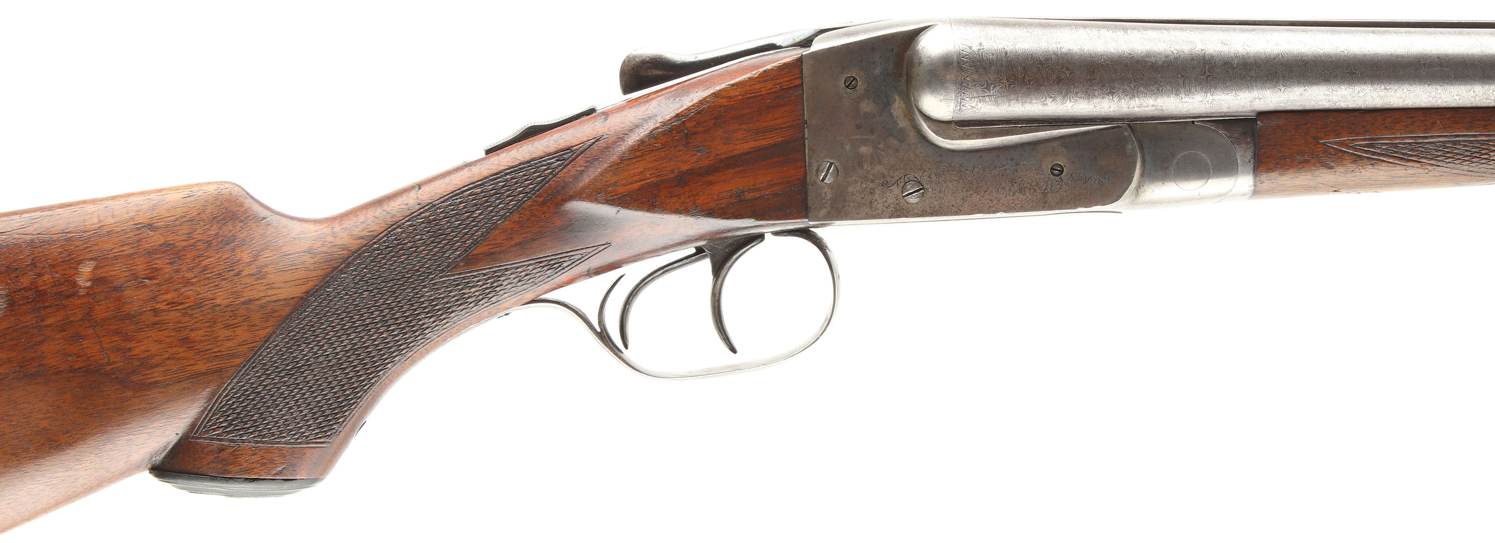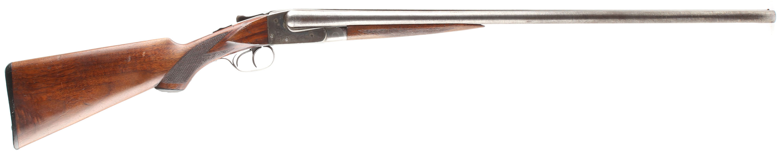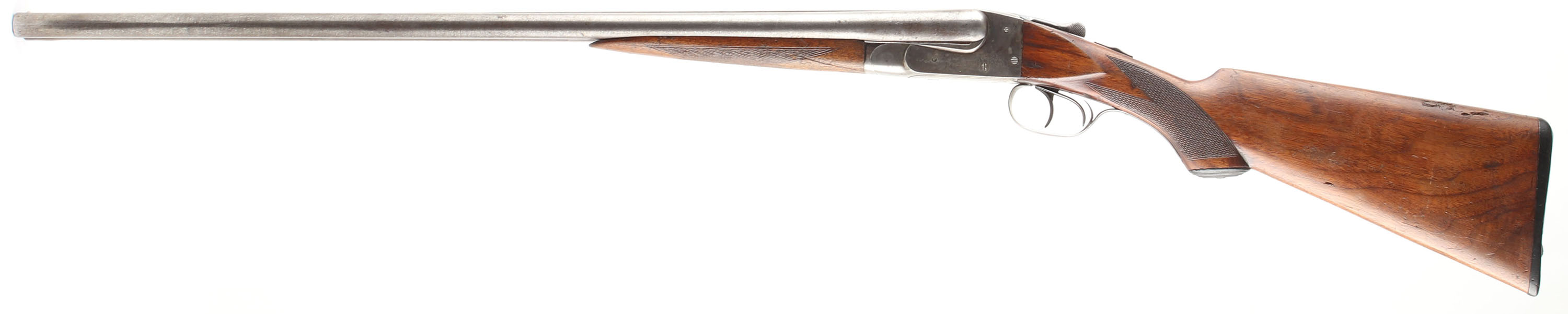 Ithaca, Lewis Model , CAL: 16GA, MFG: 1905, SN: 119003, Hammerless Break Action SxS, Choke: Full/Mod, 28'' barrels. The original checkered, capped pistol grip stocks are very good & solid. There are a couple small edge cracks, along with scratches, scrapes, gouges & dings. The original finish has had some sort of heat or water damage as its lifting from the wood's surface & there have been protective oils added over time. The fingerprint pattern on the Damascus barrels is prominent, but the browned finish has faded, with areas worn to metal gray. The case-hardened receiver has remnants of case-colors in protected areas, but has mostly worn to metal gray & toned to a brown patina. Bores are good, with consistent roughness & intermittent pitting. The solid matted rib holds a single front bead. Stock has a Ithaca Gun Co. factory buttplate. Double triggers. The rear trigger is a bit sticky & only fires occasionally. We recommend this gun be inspected by a licensed gunsmith before use. SOLD AS IS NO RETURNS. FFL or C&R Req. - Value: 200 to 400