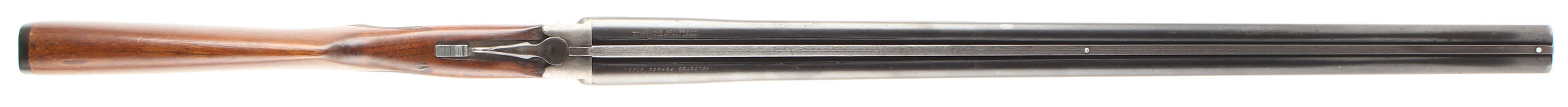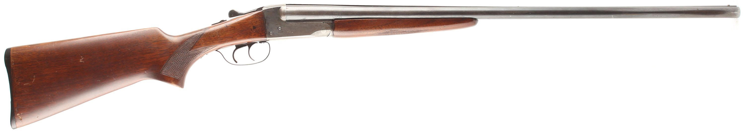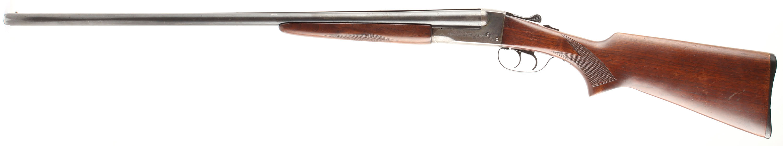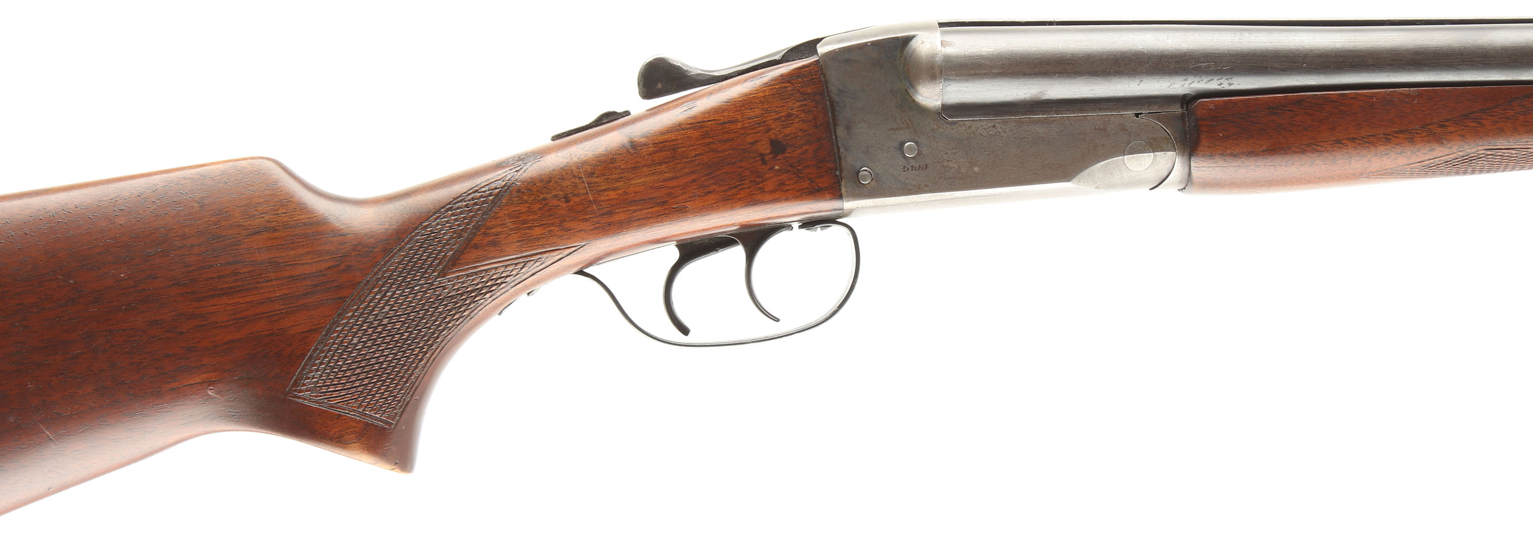Stevens (Savage), Model 5100, CAL: 20 GA, MFG: 1941-48, SN: NSN, Break Action SxS Shotgun, 28'' barrel. The checkered flat pistol grip stocks are very good & solid. There is a small hairline crack on the left side of the wrist, along with minor contusions, scrapes & dings to the finish. The metal blue finish on the barrels rates 50% & the case-hardened receiver has worn to a mix of metal gray & brown patina, with remnants of case-colors in protected areas. There's a simple engraving of a dog on the left side of the receiver. Bores are excellent, with visible striations from use. The barrel holds a small mid rib bead & front bead. Stock has a grooved plastic buttplate. Double triggers. According to John Callahan, Arms Historian for Savage Arms, guns stamped 5100 were made by the J. Stevens Arms Division of Savage from 1941 to 48. Appx 50,000 were made in that time frame. He indicated that the shotgun is basically a 311 & the 5100 stamp indicates a change in frame design to distinguish between the old & new designs. FFL or C&R Req. - Value: 200 to 400