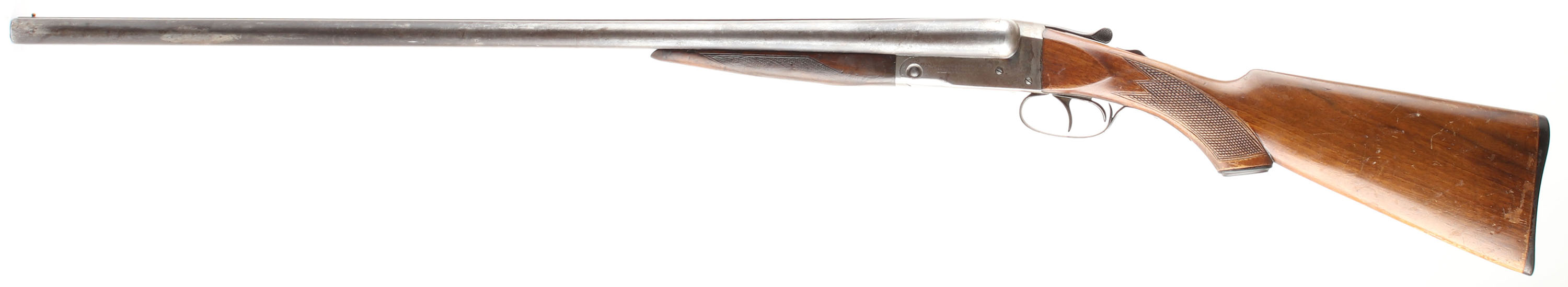 J. Stevens Arms & Tool Co., Model 355, CAL; 12GA, MFG: 1907-16, SN: 5706, Break Action SxS, 30'' barrels. The checkered, capped pistol grip stocks are very good & solid. There are surface level scrapes, scratches, dings & areas of flaking/thinning finish. The forend has been sanded & refinished, with smoothed contusions, dings & scrapes. The original blued finish on the barrel has worn to a mix of metal gray, brown patina & remaining blue. The case-hardened frame retains a few visible area of case-color, but mostly worn to metal gray & toned to a brown patina. Bores are very good & bright, with striations from use. The solid matted rib holds a single front bead. Stock has a factory Stevens checkered plastic buttplate. Back trigger does not fire. We recommend this shotgun be inspected by a licensed gunsmith before use. SOLD AS IS NO RETURNS. FFL or C&R Req. - Value: 100 to 250