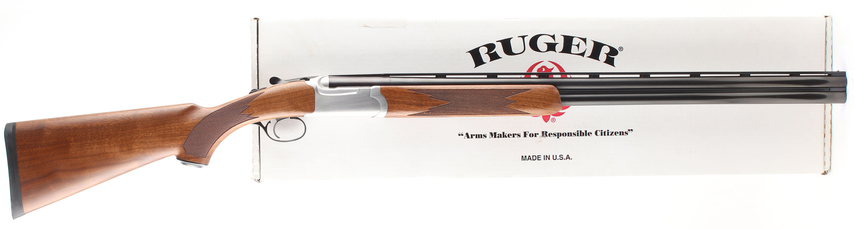 BOXED, Ruger, Red Label, CAL 20GA, MFG: 2003, SN: 401-28142, Break Action O/U Shotgun, Choke: CYL+/ CYL+, 3'' Chamber, 28'' barrels. To our knowledge, this shotgun is unused & was first together for the first time for our photography purposes. The original checkered, capped pistol stocks are mint. The factory blued finish on the barrels rates 100% & the coin silver finish on the receiver is mint. Bores are mint. The vent rib holds a silver bead. Stock has factory recoil pad. Comes in factory box, with chokes & lock. NOS. NIB. As close to new as it gets. FFL Req. - Value: 1500 to 2500