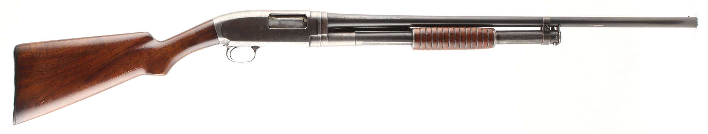 Winchester, Model 1912 Take-Down, CAL: 20 GA., MFG: 1913, SN: 25728, Pump Action, Choke: FULL, 25'' barrel. The original capped pistol grip wood stocks are excellent having been lightly sanded & refinished. There are smoothed contusions, dings & a small spots of flaking on the belly of the stock. The original blued finish rates 40% coverage on barrel. The receiver & mage tube have almost fully worn to a gun metal gray, with remnants of blue & areas toned to a brown patina. Bore is very good, with consistent frost/haze & a couple scars. The barrel holds a front bead. Stock has a Winchester checkered plastic buttplate. FFL or C&R Req. - Value: 400 to 700