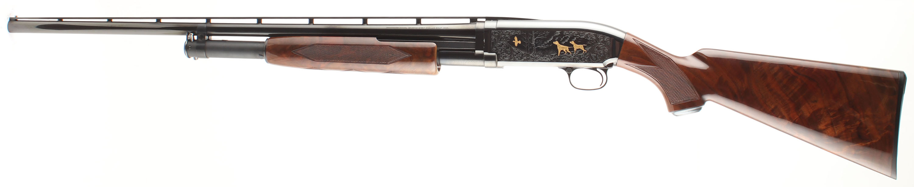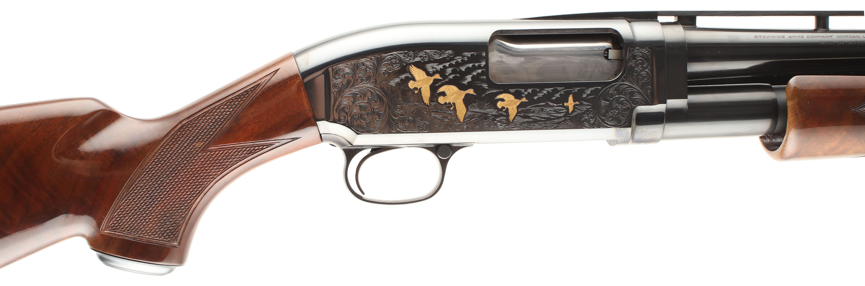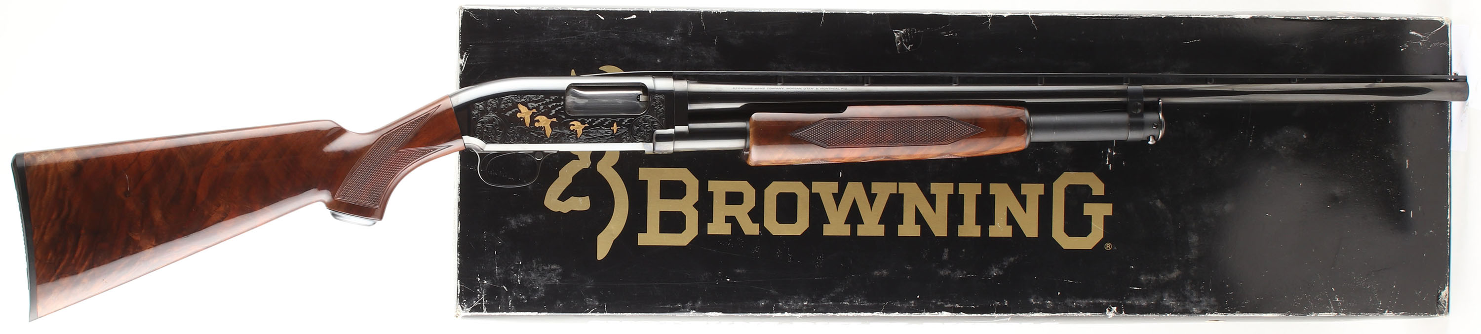 BOXED, Browning, Model 12 Grade 5, CAL; 28GA, MFG: 1991-92, SN: 02641NM972, Pump Action Shotgun, Choke: MOD, 2 3/4'' Chamber, 26'' barrel. The deluxe, checkered & capped pistol grip stock & forend are excellent. The original high gloss finish is excellent, with light storage marks. The original blued finish on the barrel/receiver rates 99%+ & the mag tube rates 97%, with some very minimal wear under the forend. The receiver displays beautiful scroll engravings with gold inlaid bird game scenes on both sides. Bore is mint. The ventilated rib holds a steel front bead. Stock has a factory Browning buttplate. Comes in factory box, with paperwork & original packaging. Consignor states this gun has never been fired outside factory. Only 5000 produced. A high condition, collectors grade shotgun. FFL Req. - Value: 1750 to 2750