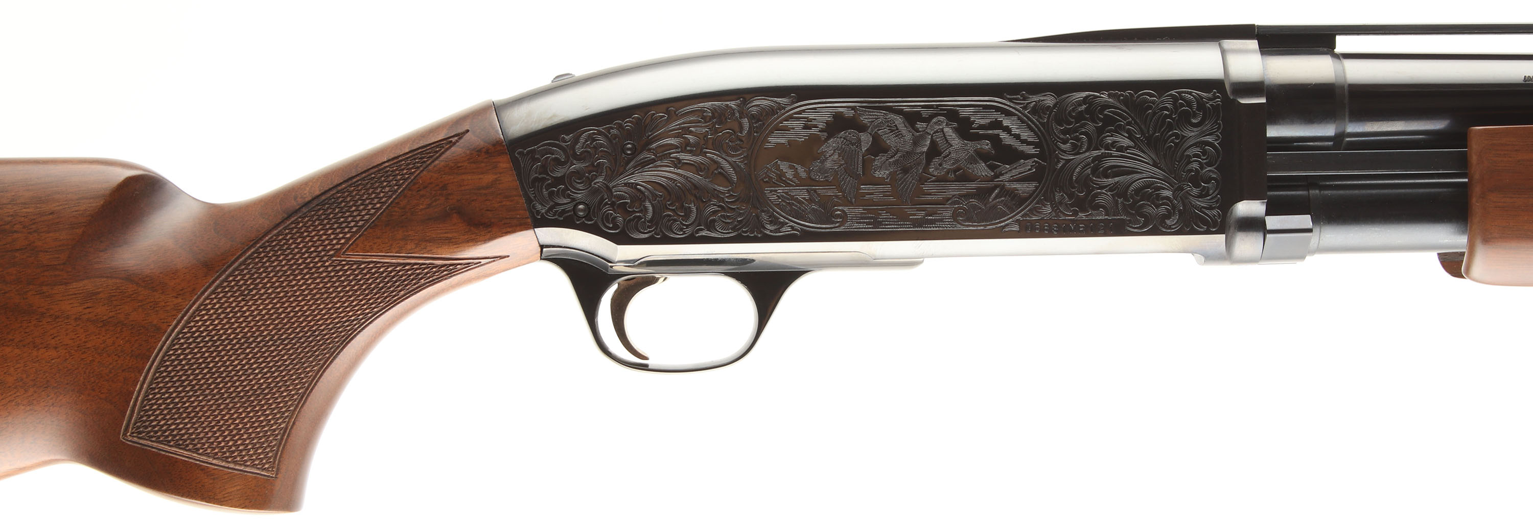 Browning (Japan), BPS Field Model/Hunter, CAL; 12GA, MFG: 1995, SN: 06831MR121, Pump Action Shotgun, 2 3/4'' & 3'' Chamber, 30'' barrel. The original Monte Carlo checkered flat pistol grip stock is excellent. There are only a couple minor handling marks to the finish. The original blued finish rates 99% overall. The receiver displays bird game scenes on both sides, with decorative scroll borders. Receiver engraving became standard in 1991. Bore is excellent. The ventilated, matted rib holds a silver bead front sight. Stock has a Browning factory recoil pad. Gold tone trigger. FFL Req. - Value: 500 to 800
