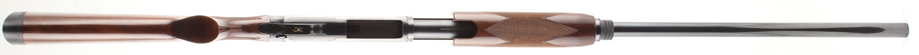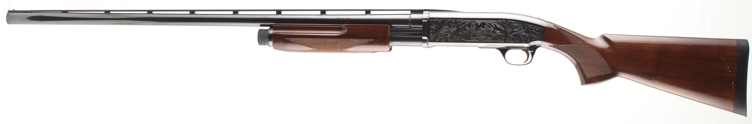 Browning (Japan), BPS Field Model/Hunter, CAL; 12GA, MFG: 1995, SN: 21702NV152, Pump Action Shotgun, 2 3/4'' & 3'' Chamber, 30'' barrel. The original checkered flat pistol grip stock is excellent. There are minor scrapes & one finish level scratch on the left side of the buttstock. The original blued finish on the barrel rates 97%, with the chamber end of the barrel toning plum, & the engraved receiver rates 95%, with minor, intermittent rust speckling. The receiver displays bird game scenes on both sides, with decorative scroll borders. Receiver engraving became standard in 1991. Bore is excellent. The ventilated, matted rib holds a silver bead front sight. Stock has a Browning factory recoil pad. Gold tone trigger. FFL Req. - Value: 500 to 700