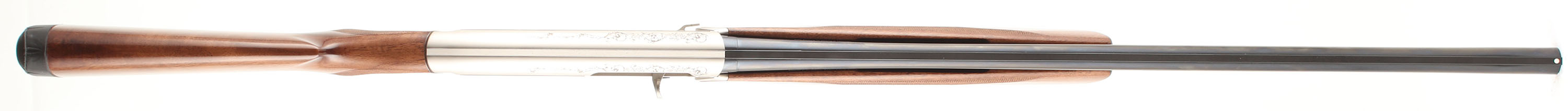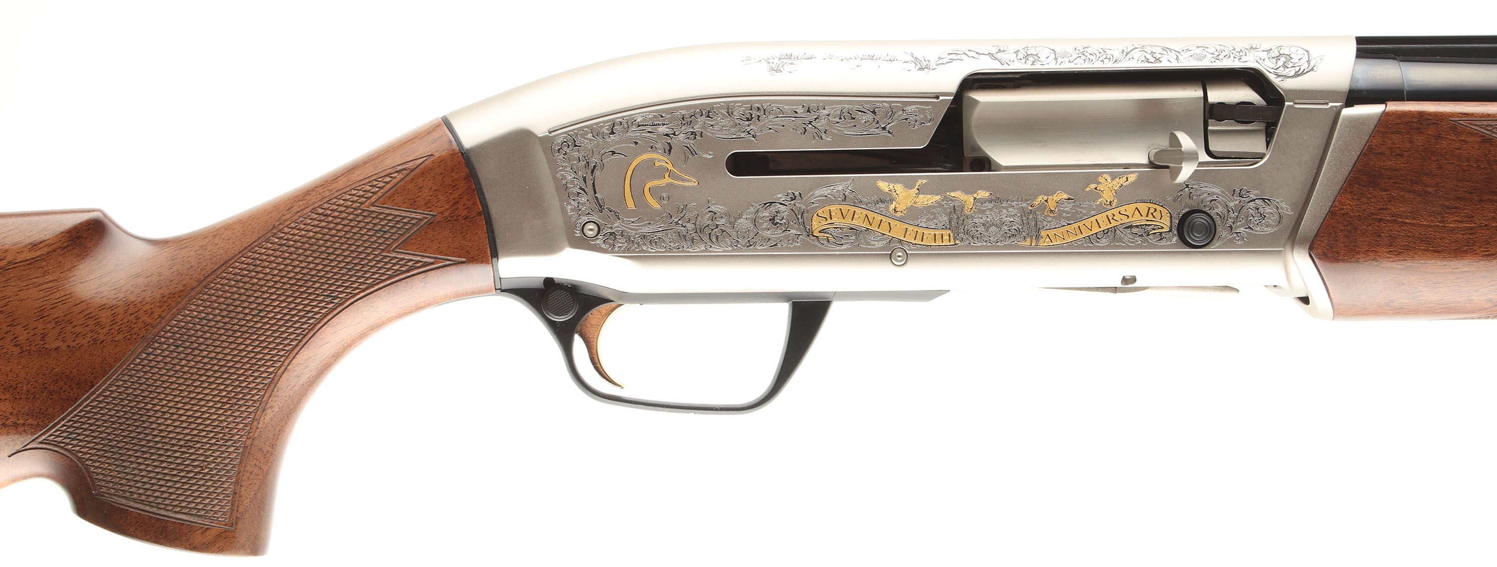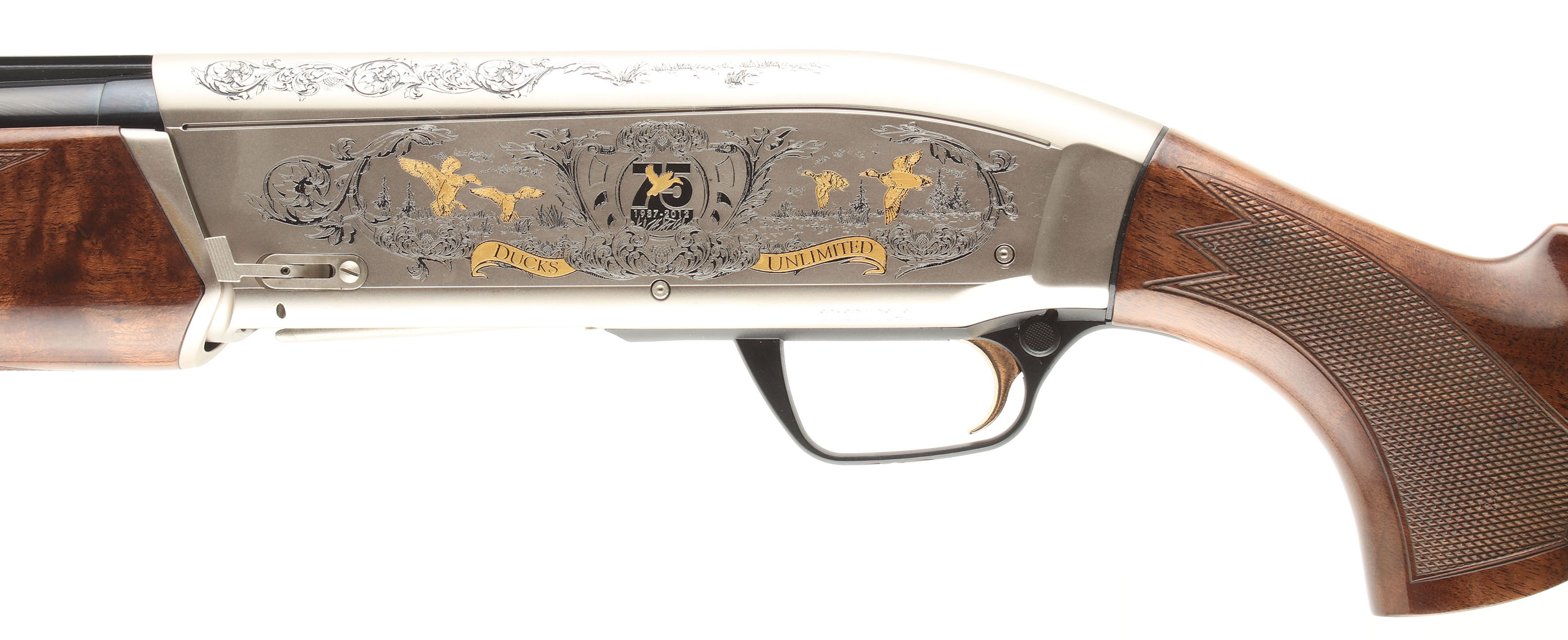 CASED Browning, Maxus Ducks Unlimited 75th Anniversary CAL: 12 GA, MFG: 2012, SN: 2012DU0242, Semi-Auto Shotgun, Choke: screw in Invector (all three), 2 3/4'' & 3'' chamber, 28'' Ventilated matted barrel. Ducks Unlimited 75th Anniversary Special Edition. Featuring elaborately engraved silver coin receiver & fancy checkered walnut stocks. The words ''SEVENTY FIFTH ANNIVERSARY'' & ''DUCKS UNLIMITED'' are engraved in banners across the bolt side of the receiver, along with numerous ducks in hunting scenes. Both wood & metal finishes are as ''NEW''. Bore is mint. Barrel holds a single front bead. Buttstock carries the original Factory recoil pad. Gold trigger. Never shot. Comes in original DU Gun Guard case, with Booklet, lock, paperwork & keys. LOP 14 1/4'' over pad. Excellent DU & Browning collectible. FFL Req. - Value: 1600 to 2200